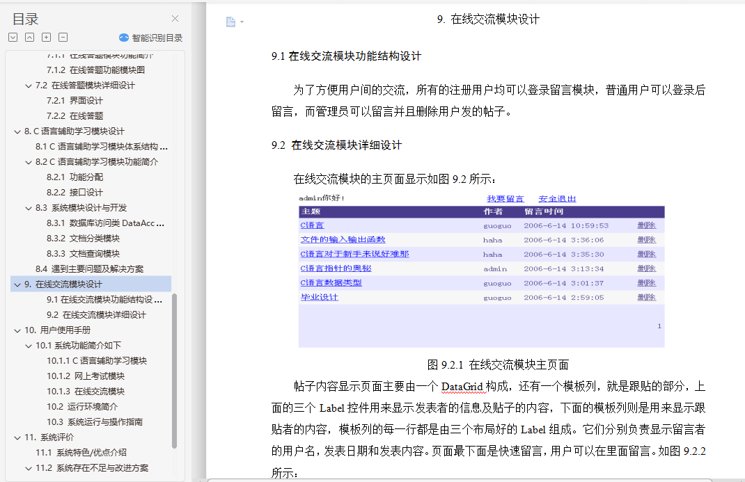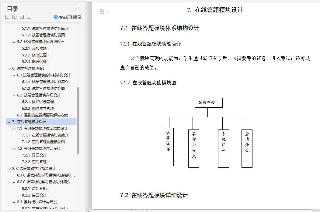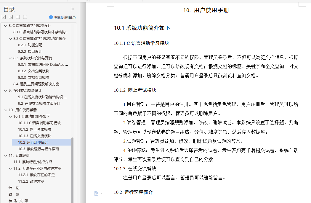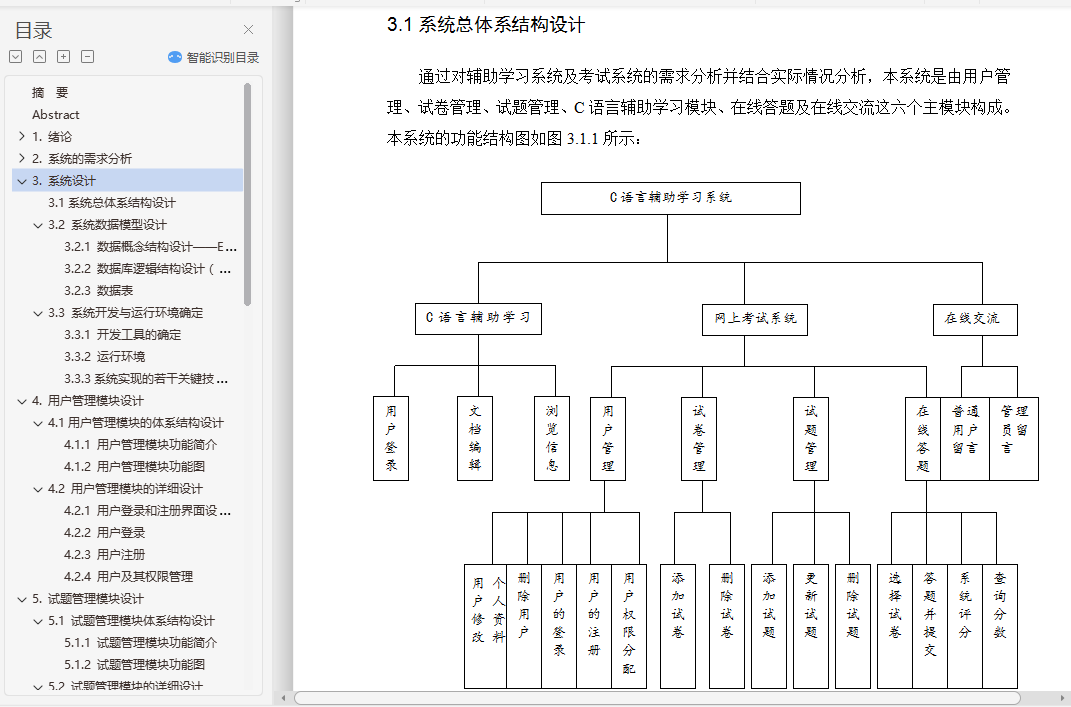 This graduation project focuses on the realization process of C language aided learning system, online examination system and online communication module, including system analysis, system investigation, data flow analysis, function design, database design, system running environment, system testing and debugging. The system is mainly for two types of personnel: administrator (teacher), ordinary students, they have different permissions. The process of using the examination module is for the administrator to add the test questions, formulate the rules of the questions, and generate the test papers. After logging in, the students select the test papers to be tested and then enter the answer questions. After the completion, they submit the test papers, store them in the database and score them. System administrators can inquire about exams The result of the student is that each candidate can only query his own performance. The auxiliary learning system module, the administrator adds an auxiliary learning document, classifies and modifies the document, and the like, and the normal user can only browse the content. In the online exchange module, any user can log in to the message, and the administrator can delete the message. In addition, the characteristics of the system are summarized: the auxiliary learning cost is saved, and the efficiency of the examination work is improved.