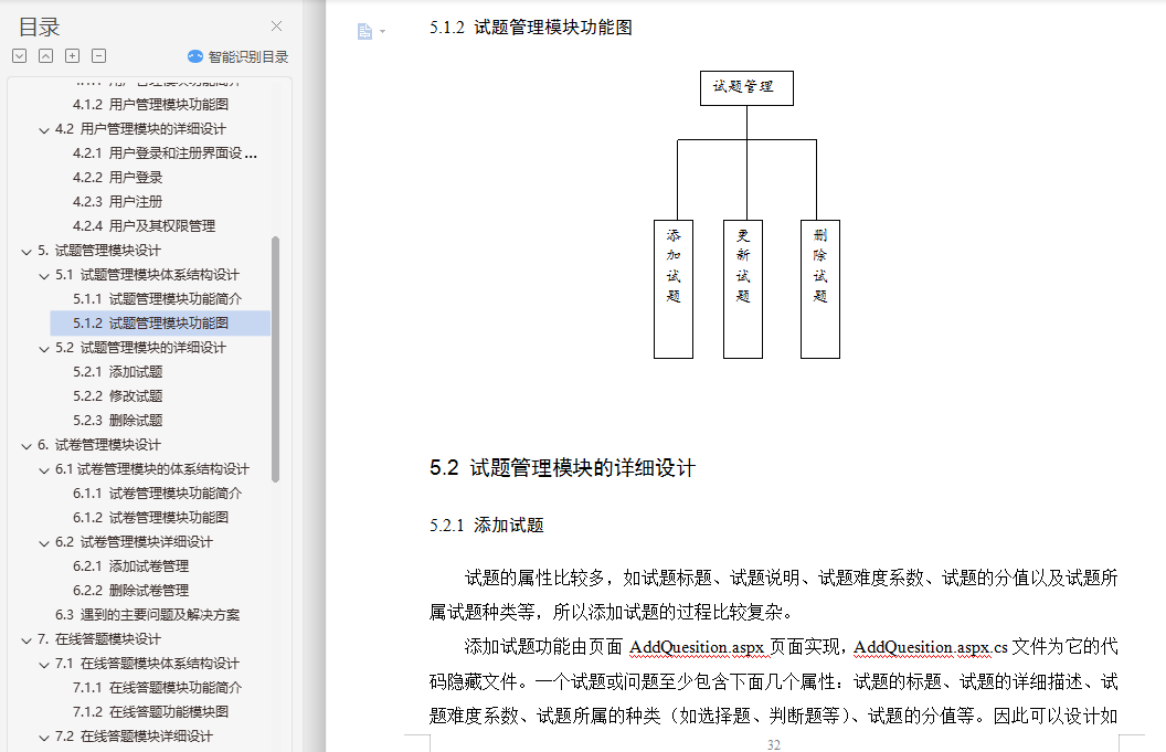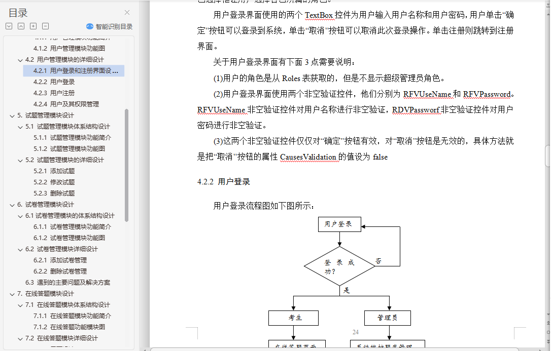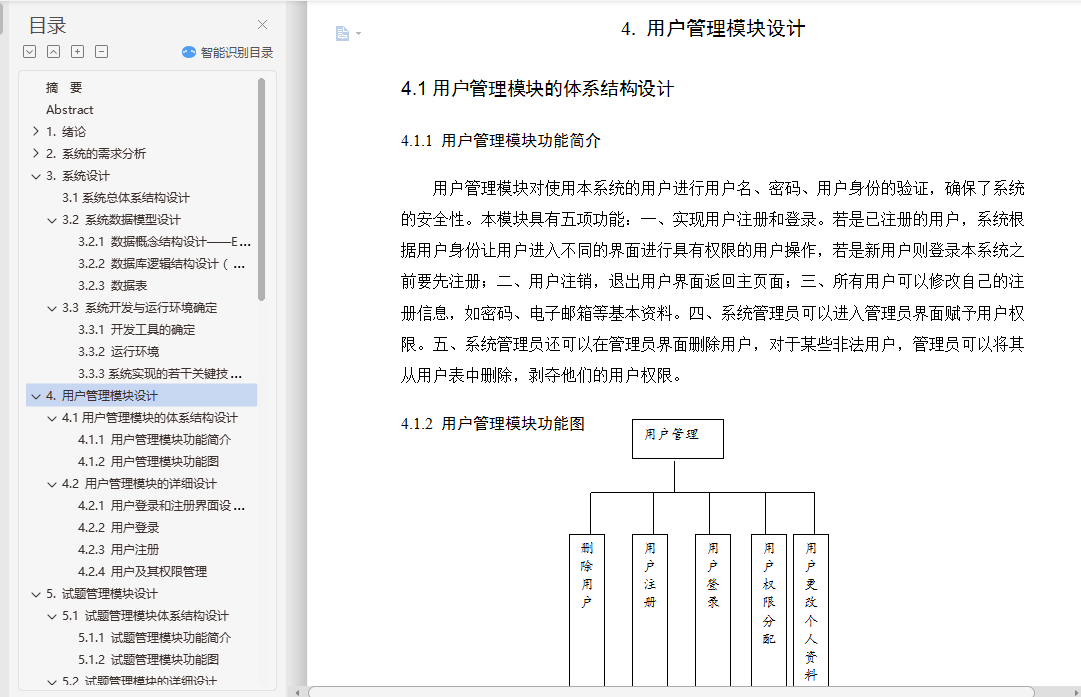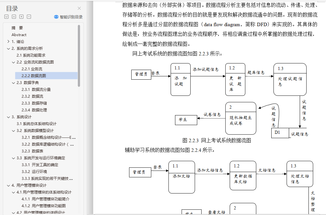 本次毕业设计重点介绍了C语言辅助学习系统、网上考试系统和在线交流模块的实现过程:包括系统分析、系统调查、数据流程分析、功能设计、数据库设计、系统的运行环境、系统测试及调试。本系统主要面向两类人员使用:管理员(教师)、普通学生,他们拥有不同的权限。考试模块使用的过程是管理员添加试题,制订出题规则,生成试卷。学生登录后选择要考的试卷然后进入答题,完毕后提交试卷,存入数据库并评分。系统管理员可以查询考生的成绩,每个考生只能查询自己的成绩。辅助学习系统模块,管理员添加辅助学习文档,并对文档进行分类、修改等操作,而普通用户只能浏览内容。在线交流模块中,任何用户都可以登录留言,管理员可以删除留言。另外总结了本系统的特点:节约辅助学习成本,提高考试工作的效率。