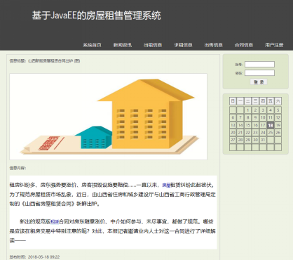 The system uses the Browser/Server architecture, JSP (Java Server Page) as a front development tool, MySQL as a back-end database development. System implementation of the final system will be divided into administrators and ordinary registered users two roles, main functions include information management, rental Qiuzu information management, news management, rental contract management, information management and information audit of the sale of several functional modules. The design of the housing rental management system can greatly improve the production efficiency of housing rental, fully embodies the superiority of the information age。