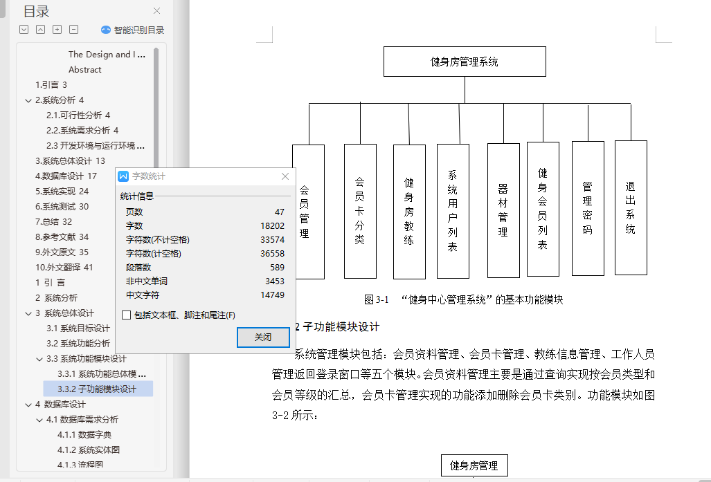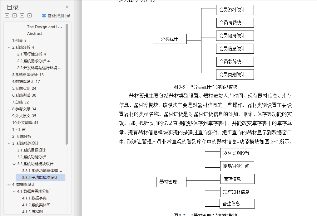 健身房管理系统的设计与实现摘 要跟随着时代的发展,为了对客户进行更好地管理和服务,提高工作效率,降低管理成本等多方面的需求,有必要通过现代化科技手段,建立完善的客户自动化管理系统,通过自动化的客户管理方法,提升健身房档次,方便客户服务,扩大业务规模,为客户提供专业的健身服务,实行专业化、科学化的管理。该论文主要论述了健身房管理系统的设计与实现。首先介绍了健身房管理系统的开发背景,并通过流程图等对该系统进行需求分析,确定了整个系统的开发设计思想和开发项目的功能需求,在此基础上,又通过业务流程图、功能模块图和E-R图对系统作了更详细的设计和描述。主要从系统管理、会员管理、会员健身管理、会员卡分类管理、会员信息管理、器材管理、工作人员健身教练管理等模块进行了详细的设计与实现。最后进行了系统测试,通过测试用例对该系统的功能进行了详细的测试并作出了客观评价,指明了系统的显示意义以及系统的开发前景。关键词:健身房;会员管理;管理系统;数据库The Design and Implementation of The Gym Management SystemAbstractFollowing the development of the times, in order to manage and service customers better, improve work efficiency and reduce the cost of management, it is necessary to establish a perfect customer automation management system through modern scientific and technological means and improve the grade of the gym through automated customer management methods. Customer service, expand business scale, provide professional fitness services for customers, and carry out professional and scientific management.This paper mainly discusses the design and implementation of the gymnasium management system. First, the development background of the gym management system is introduced, and the requirement analysis of the system is carried out through the flow chart. The development design idea of the whole system and the functional requirements of the development project are determined. On this basis, the system is designed and described in more detail through the business flow chart, the function module diagram and the E-R diagram.The detailed design and implementation are carried out mainly from system management, member management, membership fitness management, membership card classification management, member information management, equipment management, staff fitness coach management and other modules. Finally, the system test is carried out, and the function of the system is tested in detail through the test case, and the objective evaluation is made. The display meaning of the system and the development prospect of the system are pointed out.Key words: Gym; member management; management system; database目 录摘要 11.引言 32.系统分析 42.1.可行性分析 42.2.系统需求分析 42.2.1.开发设计思想 52.3开发环境与运行环境设计 52.3.1.开发环境设计 52.3.2.运行环境设计 113.系统总体设计 133.1.系统目标设计 133.2.系统功能分析 133.3.系统功能模块设计 133.3.1.系统功能总体模块设计 133.3.2.子功能模块设计 144.数据库设计 174.1.数据库需求分析 174.2.数据库逻辑结构的实现 195.系统实现 246.系统测试 307.总结 328.参考文献 349.外文原文 3510.外文翻译 41致谢 33