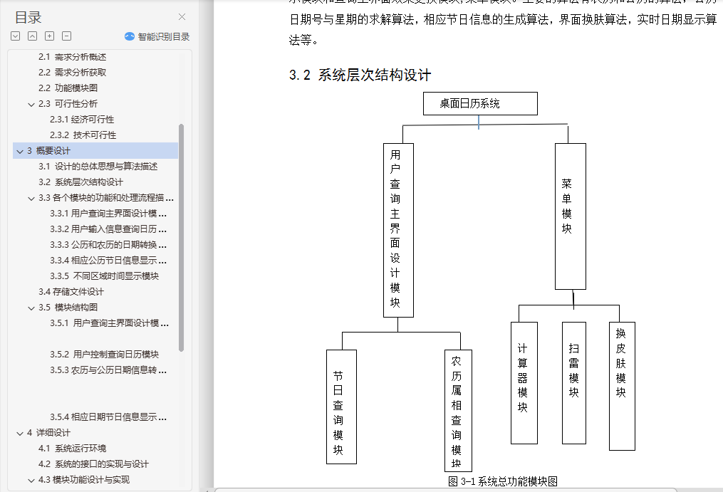 摘 要随着网络的快速发展,电脑的使用及办公越来越贴近人们的生活。为了更好的为人们提供方便快捷的服务,软件的百花齐放成了趋势。不过目前我们正在的使用的也是比较广泛的软件都存在着或多或少的缺陷和不足,比如携带不方便,不变查阅,不能自动提醒等。这就给人们的生活或多或少的带来一些不便。在时间这一块儿,桌面日历系统开始应运而生,各种的日历系统都在突出自己的优点,但是个人认为日历系统的最大优点在于它的用途,只有对于它的功能有了质的提高,才能很好的为人们服务。因此要想在各个日历系统中脱颖而出,只有把的功能做到最大化的丰富,当然在界面上的创新也是很有必要的,毕竟界面是用户体验的第一感觉。我的毕业设计就是针对当前人们正在使用的桌面日历进行了总结优化并有了一点点的创新。我查看了以往的日历系统,人们在界面上的创新比较多,除了给背景添加图片,还对系统的格局做了一些变化,这些创新都是在用户的视觉上。我认为他们没有真正意识到一个系统的最大的用处方便人们的生活,因此各种各样的功能才是真正为用户提供方便。所以我在原来只有本分的日历查询功能上提供了一些小的附加功能,比如计算器,添加闹铃,并用MP3播放器提醒,换皮肤功能等等。界面上的变化相当以往的日历系统可能不是很明显,不过在功能上它的综合性能可以在很大程度上服务于人们,方便于人们。关键词:日历;便捷;多功能AbstractWith the rapid development of the network, the use of computer and office more and more close to people's life. In order to provide convenient and efficient service, software has become the trend of All flowers bloom together. But now we are using is relatively extensive software there are more or less defects and shortcomings, such as portability, constant access, can not automatically remind. This will give people's life more or less inconvenience. At the time this together, desktop calendar system calendar system begins to appear, all kinds of in highlighting your strengths, but personally think that the biggest advantage is that it uses a calendar system, only for its functions have improved, can very good service for the people. So if you want to stand out in each calendar system, only the function to maximize the rich, of course innovation in the interface is also very necessary, after all, the interface is the first feeling of the user experience.My graduation design is aimed at the people are using the desktop calendar and summarizes the optimization and have a little bit of innovation. I checked the calendar system in the past, people innovation at the interface is more, in addition to add a picture to the background, the system made some changes, these innovations are in the user's visual. I think they are not aware of a system is the biggest use of convenience to people's lives, so a variety of functions is to provide users with convenient. So I query function provides some small additional functions, only in the original part of the calendar like a calculator, add alarm, and use the MP3 player to remind, change the skin function and so on. A change in the interface quite past calendar system may not be obvious, but the function of its comprehensive performance can largely serve the people, convenient for the people.Key words : multi function; calendar; convenient目录1 绪论 11.1 选题背景和意义 11.1.1 选题背景 11.1.2 意义 11.2 工作内容 21.3 Gui编程技术介绍 32 需求分析 52.1 需求分析概述 52.2 需求分析获取 52.2 功能模块图 52.3 可行性分析 82.3.1 经济可行性 82.3.2 技术可行性 83 概要设计 103.1 设计的总体思想与算法描述 103.2 系统层次结构设计 103.3各个模块的功能和处理流程描述 113.3.1 用户查询主界面设计模块功能和处理流程 113.3.2 用户输入信息查询日历模块 113.3.3 公历和农历的日期转换模块 113.3.4 相应公历节日信息显示模块 113.3.5 不同区域时间显示模块 123.4存储文件设计 123.5 模块结构图 123.5.1 用户查询主界面设计模块 123.5.2 用户控制查询日历模块 133.5.3 农历与公历日期信息转换模块 143.5.4 相应日期节日信息显示模块 154 详细设计 164.1 系统运行环境 164.2 系统的接口的实现与设计 164.3模块功能设计与实现 164.3.1 节日模块 164.3.2 查询模块 174.3.3 时钟模块 194.3.4 计算器模块 214.3.5 农历节日显示模块 235 编码与实现 276 测试与维护 316.1 测试环境 316.2 测试结果 316.3 维护 337 总结与归纳 357.1 收获 357.2 困难与不足 357.3 总结 36参考文献 37致谢 38