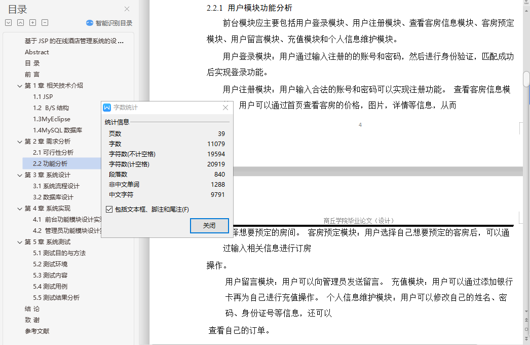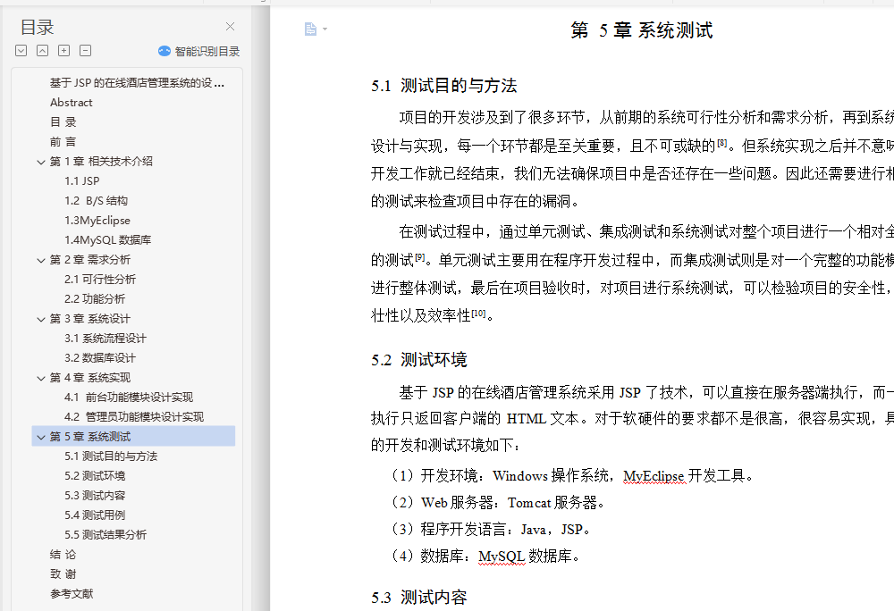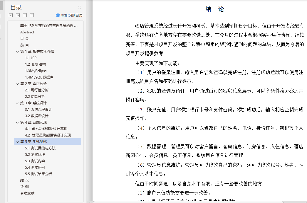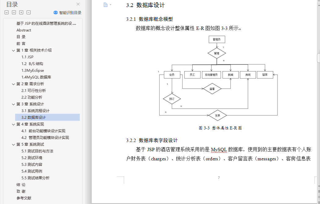 基于JSP的在线酒店管理系统的设计与实现 摘 要社会在进步,各行业也在不断的发展,酒店行业的竞争也越发激烈,如何提高酒店 的服务质量和管理效率也越来越重要。采用计算机管理模式,会提高酒店的工作效率, 从而增强酒店的综合竞争力。当前市场上许多酒店管理系统是面向大型酒店的,这类系 统对大多数的中小型酒店而言,软件功能繁多复杂并且费用昂贵。酒店管理系统基于 JSP 技术进行开发,面向中小型酒店,采用 MySQL 存储数据, 主要包括用户和管理员两大模块:用户模块具有登录、注册、查询客房、预订客房、客 户留言、个人信息管理等功能;管理员模块可以对客房信息、会员信息、员工信息,前 台展示信息、个人信息和订房信息进行管理。关键词:酒店;管理系统;JSPDesign and Implementation of Online Hotel Management System Based on JSPAbstractThe society is advancing, various industries are also developing constantly, and the competition in the hotel industry is becoming more and more fierce. How to improve the service quality and management efficiency of hotels is also becoming more and more important. Adopting a computer management model will increase the efficiency of the hotel and enhance the hotel's overall competitiveness. Many hotel management systems on the market today are aimed at large hotels, which are complex and expensive for most small and medium-sized hotels.The hotel management system is developed based on JSP technology, For small and medium sized hotels, It uses MySQL to store data, including two modules: user and administrator: user module has functions such as login, registration, querying rooms, booking rooms, customer messages, personal information management, etc. Manage room information, member information, employee information, front desk display information and personal information.Key words: hotel; management system; JSP目 录前 言 1第 1 章 相关技术介绍 21.1 JSP 21.2 B/S 结构 21.3MyEclipse 31.4MySQL 数据库 3第 2 章 需求分析 42.1 可行性分析 42.1.1 经济可行性分析 42.1.2 技术可行性分析 42.1.3 运行可行性分析 42.1.4 操作可行性分析 42.2 功能分析 42.2.1 用户模块功能分析 42.2.2 管理员模块功能分析 5第 3 章 系统设计 63.1 系统流程设计 63.2 数据库设计 73.2.1 数据库概念模型 73.2.2 数据库表字段设计 7第 4 章 系统实现 114.1 前台功能模块设计实现 114.1.1 用户登录模块 114.1.2 用户注册模块 124.1.3 查看客房信息模块 134.1.4 客房预订模块 144.1.5 用户留言模块 154.1.6 充值模块 154.1.7 个人信息维护模块 164.2 管理员功能模块设计实现 174.2.1 客户留言模块 174.2.2 客房管理模块 184.2.3 订房信息管理模块 194.2.4 入住信息管理模块 204.2.5 统计分析模块 214.2.6 酒店新闻管理模块 224.2.7 会员信息管理模块 234.2.8 员工信息管理模块 244.2.9 系统用户管理模块 254.2.10 个人信息维护模块 26第 5 章 系统测试 275.1 测试目的与方法 275.2 测试环境 275.3 测试内容 275.4 测试用例 285.5 测试结果分析 29结 论 30致 谢 31参考文献 32