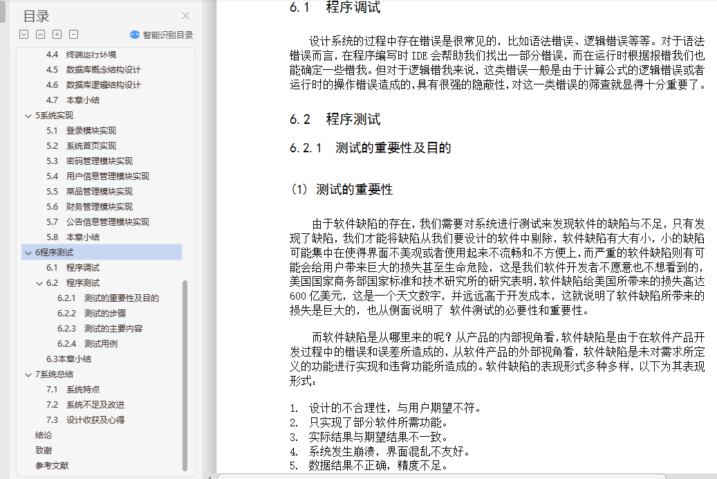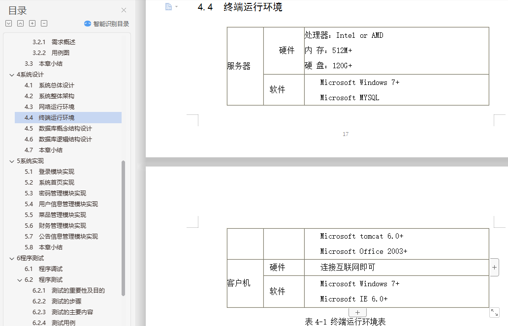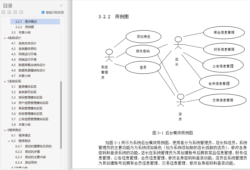 摘 要自21世纪以来,计算机技术已经发展成熟并逐步网络化,集成化。运行在单机上的软件已经不能适应当今的网络化需求而逐步退出历史舞台,取而代之的是网络化的、运行在计算机网络中的、支持多种数据形式的新型计算机应用软件。而这种新型的软件已经对效率低下、浪费人力物力的办公手段发起了强烈的冲击。在当今的餐饮企业中,依靠纯人力的餐饮管理已经不能满足餐饮企业的快速发展和随之而来的巨大需求,所以基于网络的餐饮管理系统应运而生,它使用IT的先进技术开发而成,将餐饮管理需求进行整合,提高餐饮管理效率。本系统基于JAVA语言和JSP技术开发,使用MYSQL数据库作为数据持久化工具,并使用一系列编程简化工具。主要实现了网上点餐,餐饮信息管理等功能,目的是为了实现餐饮管理的信息化,取代传统的、低效率的文字餐饮信息管理方式。使餐饮从业人员更加注重于产品的研发而非繁重的且重复的文字工作,并提高餐饮管理效率。论文主要介绍了以本课题为背景的开发过程,将重点说明系统的需求分析、设计、编程、测试等主要过程,以及其中的难题与技术要领。关键词 餐饮管理;JSP;信息化AbstractSince the beginning of the 21st century, computer technology has matured and become networked and integrated. Running on the stand-alone software already can not adapt to the network demand and gradually withdraw from the historical stage, those who replace is networked, running on the computer in the network, and support a variety of data in the form of a new type of computer application software. And the new software has had a strong impact on inefficient, labor-intensive methods of office. In today's catering enterprises, rely on the pure human catering management already cannot satisfy the rapid development of catering enterprises and the resulting huge demand, so the catering management system based on network arises at the historic moment, IT uses the advanced technology of IT development, food and beverage management needs to integrate and improve the efficiency of food and beverage management.This system is based on the JAVA coding language and JSP technology development, using the MYSQL database as a data persistence tool, and using a series of programming simplification tools. Mainly realizes the online order, catering function such as information management, the purpose is to realize catering management information, to replace the traditional way catering information management, low efficiency of text. To make the food and beverage industry more focused on product development rather than heavy and repetitive writing, and improve the efficiency of meal management.Paper mainly introduced the development process on the background of this topic, will focus on the needs of the system analysis, design, programming, testing of the main process, and the problems and technical main point.Keywords Catering Management; JSP;Informatization目录基于JSP实现的餐饮管理系统的设计与实现 1摘 要 1Abstract 21 绪论 51.1 选题的依据及意义 51.2 国内外现状研究 51.3 研究目的 61.4 本章小结 62 相关技术与开发环境 72.1 相关技术介绍 72.1.1 JSP简介 72.1.2 B/S模式分析 82.1.3 MYSQL简介 82.2 开发环境介绍 92.2.1 MyEclipse简介 92.2.2 Tomcat简介 92.2.3 SSH简介 102.3 本章小结 103 可行性分析与需求分析 113.1 可行性分析 113.1.1 经济可行性 113.1.2 技术可行性 113.1.3 操作可行性 113.1.4 法律可行性 113.2 需求分析 123.2.1 需求概述 123.2.2 用例图 133.3 本章小结 144 系统设计 154.1 系统总体设计 154.2 系统整体架构 164.3 网络运行环境 174.4 终端运行环境 184.5 数据库概念结构设计 184.6 数据库逻辑结构设计 194.7 本章小结 235 系统实现 245.1 登录模块实现 245.2 系统首页实现 255.3 密码管理模块实现 265.4 用户信息管理模块实现 285.5 菜品管理模块实现 295.6 财务管理模块实现 315.7 公告信息管理模块实现 315.8 本章小结 326 程序测试 336.1 程序调试 336.2 程序测试 336.2.1 测试的重要性及目的 336.2.2 测试的步骤 346.2.3 测试的主要内容 356.2.4 测试用例 356.3 本章小结 407 系统总结 417.1 系统特点 417.2 系统不足及改进 417.3 设计收获及心得 41结论 43致谢 44参考文献 45