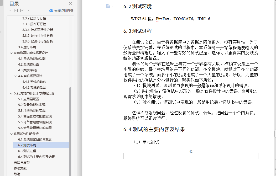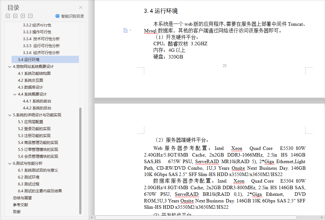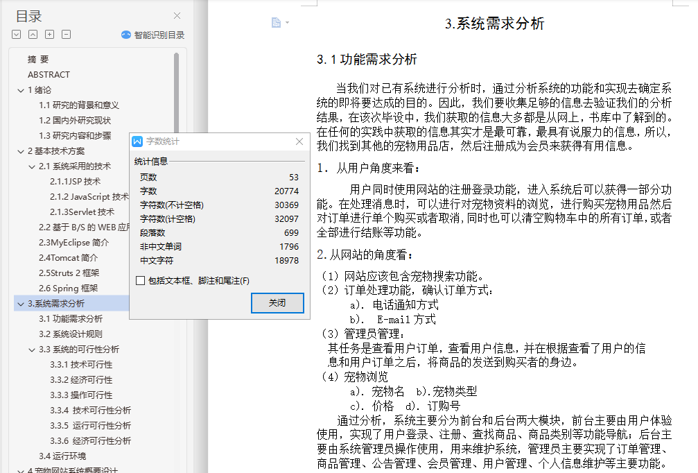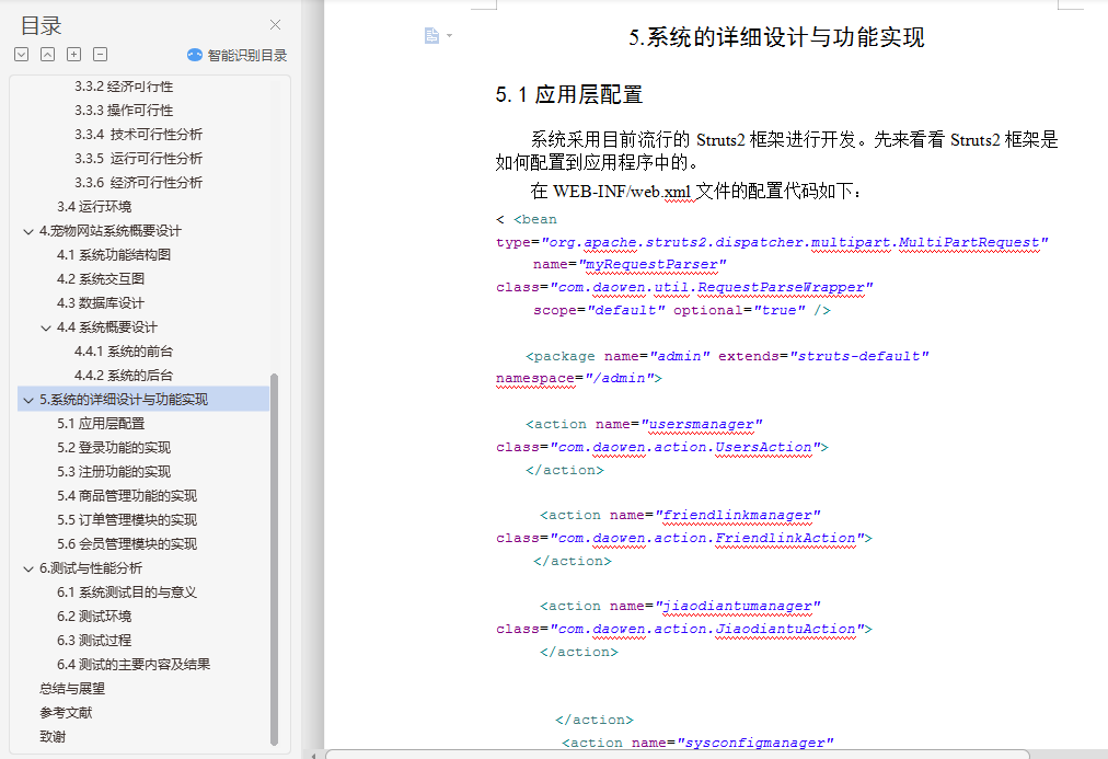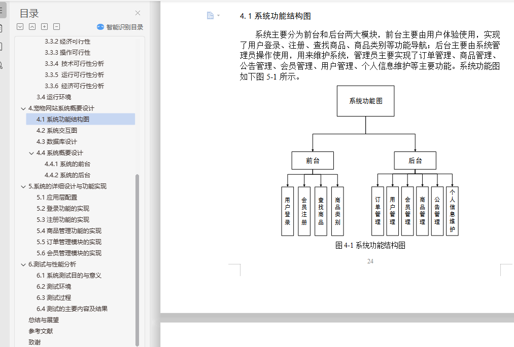 基于SSH的宠物商城网站设计与实现摘 要本系统是采用Java技术来构建的一个基于Web技术的B/S结构的宠物网站,该网站建立在Spring和Struts2框架之上,前台使用JSP作为开发语言,后台使用MySQL数据库管理系统对数据进行管理,开发环境选用MyEclipse,应用服务器采用Tomcat。宠物网站系统为广大用户实现便捷的购买宠物的功能,实现宠物商店的网络化管理。网站前台系统主要负责与用户打交道,实现用户的注册、登录、宠物预览、提交订单等功能。网站后台系统主要实现管理员登录、会员中心、新闻动态、完成订单、系统维护等功能。结果表明,本系统能够实现所需的功能,并且运行状况良好。本文分为六个部分。在绪论里首先分析了课题的研究背景与研究现状;第二章介绍了本系统开发采用的技术;第三章根据软件开发流程,对系统进行可行性分析和需求分析;第四章为系统概要设计,本章提出系统总体功能模块的设计,并对数据库的结构进行设计;第五章着重介绍各个功能模块的实现方案;最后,第六章介绍系统单元测试和性能测试的设计,以及对测试结果的分析。关键词:宠物商店网站系统;JSP;Mysql数据库;Spring和Struts2框架Design and Implementation of Pet Web site Based on JavaABSTRACTThis system is constructed by Java based on a B/S technology Web structure of the pet website, the website based on Spring and Struts2 framework, the use of JSP as a development language, the background using the MySQL database management system to manage the data, with the MyEclipse development environment, application server using Tomcat.Pet website system for the majority of users to facilitate the purchase of pet functions, pet shops to achieve network management. Website front desk system is mainly responsible for dealing with users, to achieve the user's registration, login, pet preview, submit orders and other functions. Website backstage system mainly realizes the administrator login, the member center, the news dynamics, completes the order, the system maintenance and so on. The results show that the system can achieve the required functions and run in good condition.This paper is divided into sex parts. In the preface, firstly analyzes the research background and research status of the topic; the second chapter introduces the development of the technology of this system; the third chapter according to the software development process, feasibility analysis and requirement analysis of the system; the fourth chapter is the system design, this chapter presents the design of the overall system function module, and the structure of the database design; the fiveth chapter emphatically introduces the realization scheme of each functional module; finally, the sixth chapter introduces the system design of the unit test and performance test, and the analysis of test results.Keywords: Pet Web System; JSP; MySQL database; Spring and Struts2 Framework目 录摘 要 iABSTRACT ii1绪论 11.1研究的背景和意义 11.2国内外研究现状 21.3研究内容和步骤 42基本技术方案 52.1系统采用的技术 52.1.1JSP技术 52.1.2 JavaScript技术 52.1.3Servlet技术 62.2基于B/S的WEB应用体系结构 72.3MyEclipse简介 92.4Tomcat简介 112.5Struts 2框架 112.6 Spring框架 143.系统需求分析 213.1功能需求分析 213.2系统设计规则 223.3系统的可行性分析 223.3.1技术可行性 223.3.2经济可行性 223.3.3操作可行性 223.3.4 技术可行性分析 233.3.5 运行可行性分析 233.3.6 经济可行性分析 233.4运行环境 234.宠物网站系统概要设计 244.1系统功能结构图 244.2系统交互图 254.3数据库设计 264.4系统概要设计 294.4.1系统的前台 294.4.2系统的后台 335.系统的详细设计与功能实现 355.1应用层配置 355.2登录功能的实现 365.3注册功能的实现 375.4商品管理功能的实现 385.5订单管理模块的实现 405.6会员管理模块的实现 406.测试与性能分析 416.1系统测试目的与意义 416.2测试环境 426.3测试过程 426.4测试的主要内容及结果 43总结与展望 45参考文献 46致谢 47
