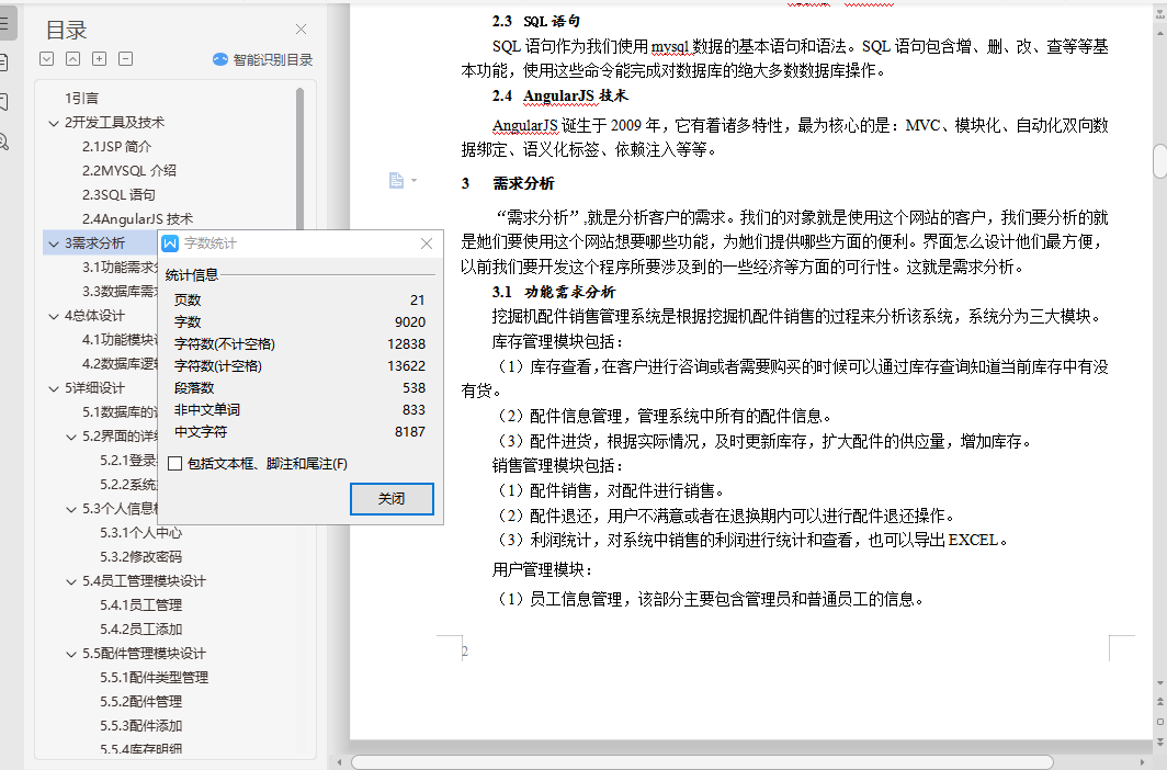 目 录1 引言 12 开发工具及技术 22.1 JSP简介 22.2 MYSQL介绍 22.3 SQL语句 22.4 AngularJS技术 23 需求分析 23.1 功能需求分析 23.2 可行性分析 33.3 数据库需求分析 34 总体设计 54.1 功能模块设计 54.2 数据库逻辑结构设计 55 详细设计 65.1 数据库的详细设计 65.2 界面的详细设计 75.3 个人信息模块设计 85.4 员工管理模块设计 95.5 配件管理模块设计 95.6 进货模块设计 115.7 配件销售模块设计 125.8 退货模块设计 155.9 数据统计模块设计 166 系统测试 176.1 测试目的 176.2 测试方法说明 176.3 测试用例设计 176.4 系统测试 186.5 测试结果分析 187 结论 18参考文献 19摘要:伴随着中国发展,各个城市的建设速度也快得惊人,随之而来的挖掘机的使用当然是必不可少的,接踵而至的商机也不言而喻,各类零配件的种类也多起来。随着工作量和业务的更加精细化,之前的人工处理方式在业务和财务方面难免出现漏洞,由于现在各类销售系统已逐步走向成熟,因此它的投入使用可以减轻企业员工的劳动强度,提高员工工作效率的同时又方便财务的统计。本次的华柳挖掘机配件营销中心销售系统主要采用了JSP语言来进行来开发,所设计的功能有包括库存管理、销售管理、用户管理和查询统计等。从需要分析出发,先进行分析再进行程序开发,完成后的系统界面美观,功能完善,会给华柳企业带来非常大的方便。关键词:配件 挖掘机 销售 管理系统Abstract: Along with the development of Chinese, each city construction speed is faster, the use of the excavator is of course essential, the ensuing opportunities are self-evident, the kinds of various accessories are also many. With the workload and the business is more refined, artificial processing before inevitably in the business and financial aspects of a loophole, because now all kinds of sales system has been gradually mature, so it can be put into use to reduce the labor intensity of employees, improve work efficiency and convenient financial statistics.In the whole system development process, the use of the basic concepts of software engineering, related technologies and methods. And the use of the system life cycle of the structured programming method, which will be the entire system development stage (demand analysis, system design, basic realization) of the basic activities throughout.Key Words:Accessories; excavator; sales management system