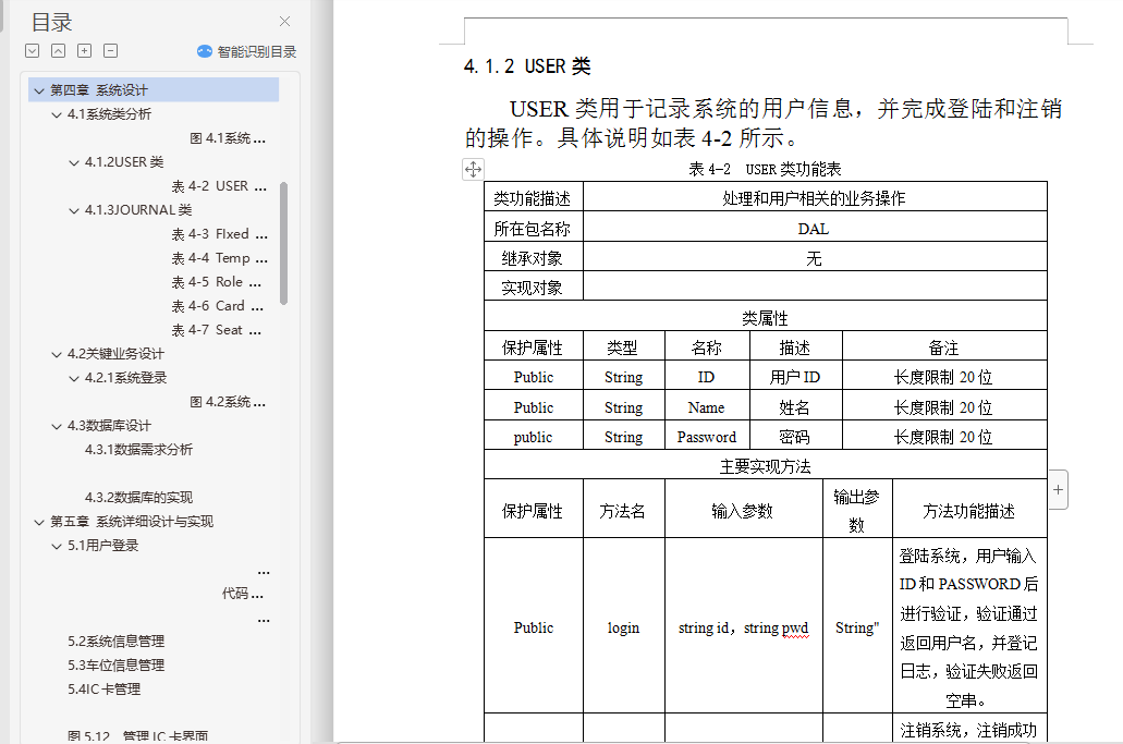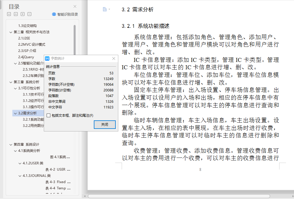 摘要随着现代社会的快速发展,人民生活水平快速提高,汽车的数量飞速增加,在生活小区、办公场所、商场、景点等地方,停车难问题也日益突出。为了解决停车难的问题,结合一些当前的停车场模式和现状开发出本停车场管理系统。主要功能包括场内车辆管理和后台数据库管理,其中场内车辆管理又分为车位管理模块、收费管理模块、停车场数据管理模块、系统功能操作模块、用户信息管理模块等。我们从系统的功能实现和设计方面阐述了管理系统软件的开发过程。系统采用了B/S架构,Tomcat8.0作为运行服务器,基于J2EE标准。Eclipse4.6开发环境,数据库采用Mysql-5.5.37。开发过程利用MVC开发模式,层次分明。成功实现了该系统。试运行结果表明,该系统具有良好的性能和扩展性,较高的响应速度和效率,该系统符合实际的停车场管理系统,为停车场管理供一个快速,简单规范的管理平台。这对提高信息化程度,降低人力成本有着重要的意义。关键词:J2EE;B/S结构;Mysql;MVC;ABSTRACTWith the rapid development of modern society, people's living standards increasing quickly, the number of vehicles increased rapidly, the living community, office space, shopping malls, scenic spots, such as local, parking problem is increasingly outstanding.In order to solve the problem of parking difficulty, combined with some parking mode and the status quo of the current developed this parking lot management system.Main functions include floor vehicle management and background database management, including internal vehicle management is divided into parking management module, data management module, system of parking charge management module, function module, user information management module, etc.We this paper expounds the realization of the function of the system and the design management system software development process.System USES the B/S architecture, Tomcat8.0 as to run the server, based on the J2EE standard.Eclipse4.6 development environment, using Mysql database - 5.5.37.Development process using MVC development mode, distinct.The system is implemented.Trial operation results show that the system has good performance and scalability, high response speed and efficiency of the system in accordance with the actual car park management system, for parking management for a rapid, simple and standardized management platform.This to improve the informationization level, reduce the manpower cost has an important significance.Keywords:J2EE; B / S structure;Mysql;MVC;目录第一章 绪论 11.1 系统研究背景和意义 11.2 研究现状 11.3 论文结构 3第二章 相关技术与方法 42.1 J2EE 42.2 MVC设计模式 52.3 JSP介绍 52.4 jQuery 52.5 智能化功能介绍 6第三章 系统分析 63.1 可行性分析 63.2 需求分析 8第四章 系统设计 114.1 系统类分析 114.2 关键业务设计 154.3 数据库设计 16第五章 系统详细设计与实现 225.1 用户登录 225.2 系统信息管理 245.3 车位信息管理 275.4 IC卡管理 3031图5.12 管理IC卡界面 315.5 临时车主管理 32325.6 固定车主管理 3434图5.20固定车主流程图 355.7 收费管理 35管理收费信息如图5.21所示: 3535图5.21管理收费信息 355.7 打印管理 35图5.22打印信息 365.8系统功能操作 36第六章 系统测试 366.1 系统测试概况及用例 3742第七章 系统评价 427.1 系统评价及意义 42第八章 总结 42参考文献 44致谢 46
