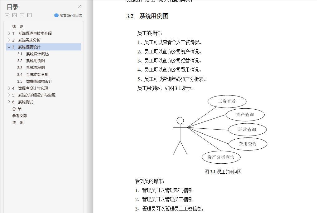 基于JSP的企业财务管理系统设计与实现摘要对于企业集来说,财务管理的地位很重要。随着计算机和网络在企业中的广泛应用,企业发展速度在不断加快,在这种市场竞争冲击下企业财务管理系统必须优先发展,这样才能保证在竞争中处于优势地位。对此企业必须实现财务管理系统的设计与开发。在这个系统中综合应用了MySQL、Servlet、JSP等知识。网页界面的结构设计以实用性出发,具有易于操作、简洁、方便等特点。在设计中,首先,运用HTML语言对网站的静态页面进行精细的加工并且在网站的美工方面取得了良好的效果。其次,对于Java编程、JSP的动态编程以及MySQL数据库进行努力学习和大量实践,并运用到了网站的建设中。本论文就企业财务管理系统进行了详细全面的论述。访问本系统的用户分为、管理员和员工两种角色,管理员的功能有基础信息管理、公司资产、经营、费用信息的管理及年终资产分析表的生成;员工的功能有查看个人工资、查看公司资产、经营、费用及年终资产分析表。关键字 : JSP;MySQL;ServletEnterprise Financial Management SystemAbstractFor the enterprise, is an important financial management position. With the wide application of computer and network in the enterprise, enterprise development speed at a constant speed, in this competitive market impact of enterprise financial management system must give first priority to the development, so that we can guarantee in the advantage position in the competition. This enterprise must realize the financial management system design and development.In this system the integrated application of MySQL, Servlet, JSP knowledge. Structure design of webpage interface to practicality, has the characteristics of easy operation, simple, convenient. In the design, first of all, has obtained the good effect of art using the static page HTML language on the website of the fine processing and in site. Secondly, to learn and practice a lot for the dynamic programming, JSP Java programming and MySQL database, and applied to the construction of the site.Users to access the system is divided into two kinds of roles, administrators and staff, the administrator has the function of generating surface analysis of year-end assets management and basic information management, the assets of the company, management, cost information; staff function view individual wages, view the company assets, management, cost and year-end assets analysis table.Key Words: JSP, MySQL, Servlet目 录绪 论 11 系统概述与技术介绍 21.1 B/S结构介绍 21.2 MySQL数据库 31.3 MyEclipse介绍 41.4 JavaScrip语言 41.5 JSP技术 41.6 MVC模式 52 系统需求分析 82.1 开发环境 82.2 需求分析 82.3 可行性分析 83 系统概要设计 103.1 系统设计概述 103.2 系统用例图 113.3 系统流程图 123.4 系统功能分析 133.5 数据库结构设计 134 数据库设计与实现 144.1 数据库结构设计 144.1.1 表概要说明 144.1.2 数据表的结构 145 系统的详细设计与实现 185.1 系统登陆页面实现 185.2 管理员功能模块 185.2.1 部门信息管理 195.2.2 员工信息管理 215.2.3 员工工资管理 225.2.4 资产类别管理 235.2.5 资产信息管理 255.2.6 经营信息管理 265.2.7 费用信息管理 275.2.8 年终资产分析 285.3 员工功能模块 295.3.1 个人工资查看 295.3.2 公司资产查询 295.3.3 公司经营查询 295.3.4 公司费用查询 305.3.5 资产分析查看 306 系统测试 316.1 测试方法 316.2 系统测试结果 32总 结 34参考文献 35致 谢 36附录 37