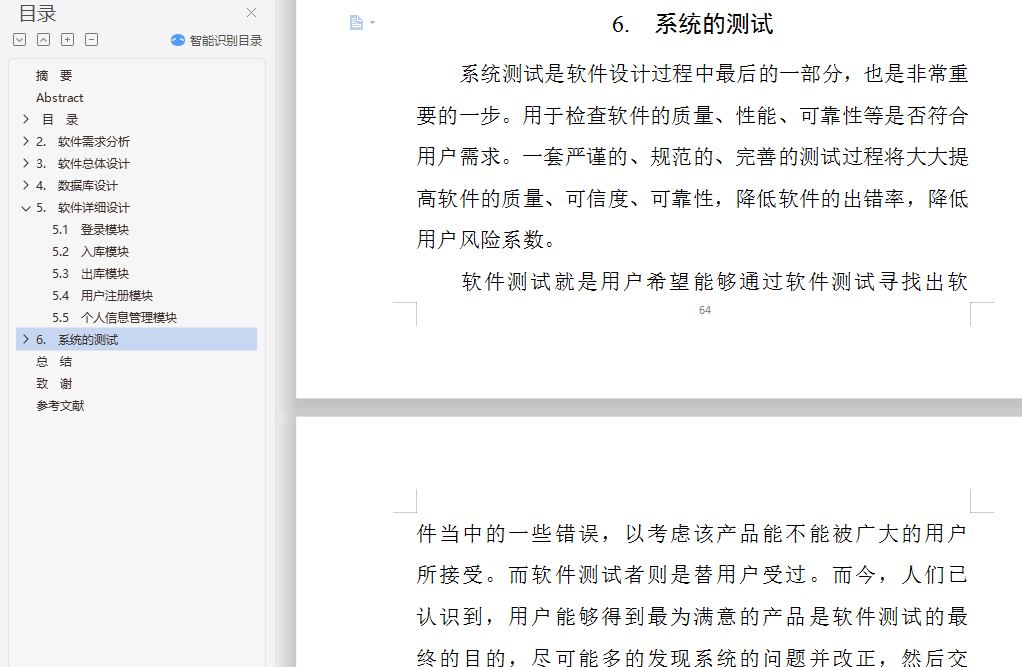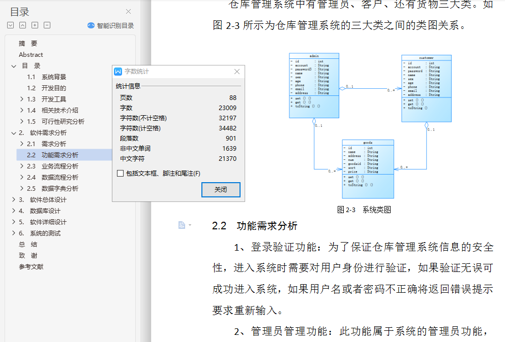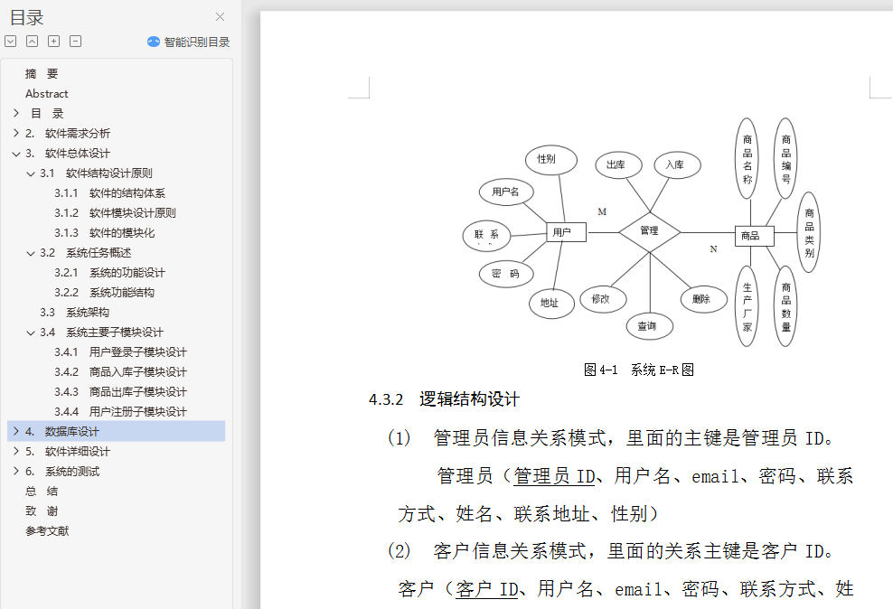摘 要仓库物品的管理是与我们的日常生活息息相关的一个重大问题。随着我国经济飞速的发展,改革开放的不断深入,企业要想在激烈的市场竞争中立于不败之地,要想继续的发展与生存,没有现代化的管理方式与方法是万万不行的,仓库管理的全面信息化、自动化则是在其中占有极其重要的地位。仓库管理信息系统则是在此需求背景下开始研制并开发的。在此篇文章中严格按照软件工程思想,设计并实现了一个仓库信息管理系统。介绍了系统从需求分析,逻辑设计,总体设计,详细设计以及系统测试、实施各阶段的主要内容和成果,包括系统结构图、业务流程图数据流程图、物理表实现及其关系、功能模块算法流程、界面设计等等。关键字 仓库; 软件工程; 系统开发Design and implementation of warehouse management system based on WebAbstractWarehouse management is a major issue is closely related to our daily life. With China's rapid economic development and the deepening of reform and opening up, the enterprise to be in an invincible position in the fierce market competition, want to continue development and survival, no modern management methods and methods is absolutely out, warehouse management and comprehensive information, automation is where you play a very important role. Warehouse management information system is started research and development in the context of this demand. This article strictly according to the software engineering, design and implementation of a warehouse management system. Introduced from requirements analysis, logic design, General design, detailed design and system testing, implementation of the content and results of each stage, including charts, business process data flow chart, functional modules algorithms, physical form and its process, interface design and so on.Key warehouse Software engineering; System development目 录摘 要 iAbstract ii目 录 iii1. 绪论 11.1 系统背景 11.2 开发目的 11.3 开发工具 21.3.1 Eclipse 21.3.2 Mysql 21.3.3 PowerDesigner 21.4 相关技术介绍 31.4.1 JSP技术 31.4.2 JavaScript技术 51.4.3 Tomcat 51.4.4 软硬件需求 61.5 可行性研究分析 61.5.1 系统目标可行性分析 71.5.2 系统的经济可行性 71.5.3 系统的技术可行性 71.5.4 系统的法律可行性 72. 软件需求分析 82.1 需求分析 82.1.1 用例图 82.1.2 类图 92.2 功能需求分析 92.3 业务流程分析 102.3.1 管理员模块业务流程 102.3.2 客户模块业务流程分析 102.4 数据流程分析 112.4.1 顶层数据流 112.4.2 一层数据流图 112.4.3 二层数据流图 122.5 数据字典分析 132.5.1 数据存储条目 132.5.2 加工条目 143. 软件总体设计 163.1 软件结构设计原则 163.1.1 软件的结构体系 163.1.2 软件模块设计原则 163.1.3 软件的模块化 173.2 系统任务概述 173.2.1 系统的功能设计 173.2.2 系统功能结构 183.3 系统架构 183.4 系统主要子模块设计 193.4.1 用户登录子模块设计 193.4.2 商品入库子模块设计 193.4.3 商品出库子模块设计 193.4.4 用户注册子模块设计 194. 数据库设计 214.1 数据库概念 214.2 数据库分析 224.2.1 数据库的完整性分析 224.2.2 数据库的安全性分析 224.3 数据库的设计 234.3.1 概念结构设计 234.3.2 逻辑结构设计 234.4 数据库的连接 254.4.1 连接工具 254.4.2 工厂类配置文件主要内容 264.4.3 Mapper类配置文件主要代码 265. 软件详细设计 285.1 登录模块 285.2 入库模块 305.3 出库模块 315.4 用户注册模块 325.5 个人信息管理模块 346. 系统的测试 386.1 测试简述 386.1.1 测试目的及重要性 386.1.2 测试原则 396.2 测试方法 406.2.1 黑盒测试 406.2.2 白盒测试 406.2.3 单元测试 406.2.4 集成测试 416.3系统模块的测试 416.3.1 登陆模块测试: 416.3.2 出库模块测试 416.4.3 用户信息模块测试结果 44总 结 45致 谢 46参考文献 47附件1:外文文献(原文) 48附件2:外文文献(译文) 57