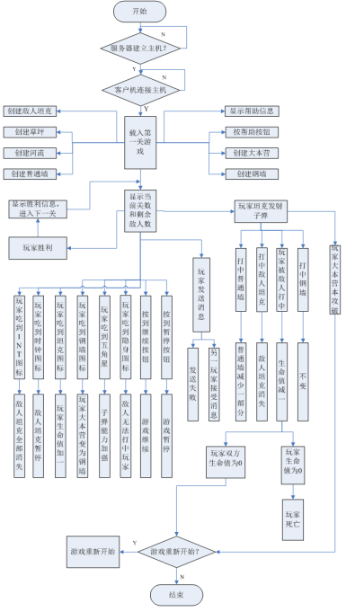 目 录1.引言 12.系统分析 22.1需求和技术分析 22.2功能分析 23.总体设计 23.1总体功能 23.2坦克大战总体流程图 44.详细设计 54.1面板功能设计 54.2子弹功能设计 84.3坦克功能设计 94.4服务器设计 104.5客户端设计 135. 游戏测试 155.1 测试方法 155.2 系统测试 155.3 测试分析和小结 176.结论 18参考文献 18基于Java的坦克大战游戏的设计与实现摘要:随着人们对生活质量的要求一天比一天高,为了让人们更好地开掘自身的智慧,游戏就此进入了大众的视野,在人们的生活中有着重要的位置,已然变得必不可少。游戏产业推动高新技术不断升级,极大地促进了经济的增长,推动了“第四产业”的经济腾飞。坦克大战游戏是童年时期经常玩的经典游戏,我们对它都十分了解。游戏通过分析JAVA游戏开发和代码设计,用Eclipse软件开发了坦克大战游戏,运用接口技术,使一个类能够实现多个接口,使用套接字Socket来完成client端和server端的连接。玩家通过连接访问进入游戏,通过操纵坦克来守卫基地,玩家还可以获得超级武器来提升坦克的属性,摧毁全部敌方坦克来取得胜利,操作非常简单,还具有非常高的普遍率,适合所有人群玩。该游戏既满足了人们的个性化需求,也让玩家在游戏过程中丢掉烦恼,尽情地释放压力。关键词:Java 坦克大战游戏 SocketThe Design and Implementation of The Java Based Tank War GameAbstract:As people demand higher quality of life every day, in order to make people better dig their own wisdom, the game into the public vision, in people's lives have a vital position, has become an indispensable part. The game industry to promote the upgrading of high-tech, which greatly promoted the economic growth, and promote the "fourth industry" economic take-off. Tank war game is often played in childhood, but also the classic game. Game through the analysis of JAVA game development and code design, with Eclipse software developed a tank war game, the use of interface technology, so that a class can achieve multiple interfaces, the use of socket Socket to complete client and server side of the connection. Players access the game through the connection, through the manipulation of tanks to guard the base, the eradication of all enemy tanks to win, players can also get super weapons to enhance the properties of the tank, the operation is very simple, suitable for people of all ages to play. The game not only meets the individual needs of people, but also allows players to lose trouble in the course of the game, enjoy the pressure to release.Key words: Java; Tank war game; Socket
