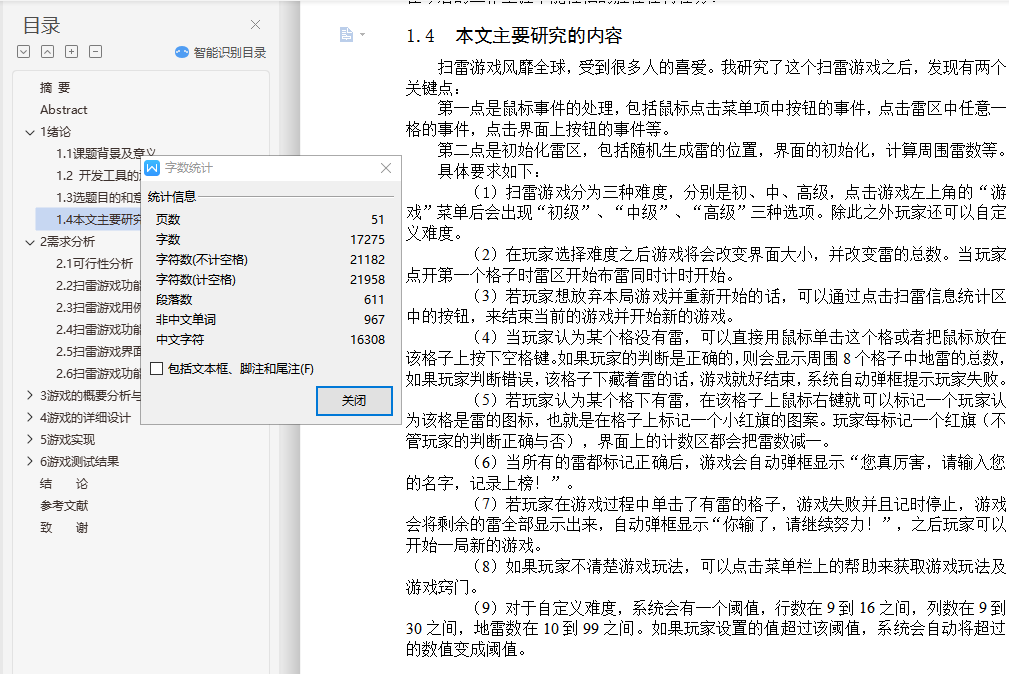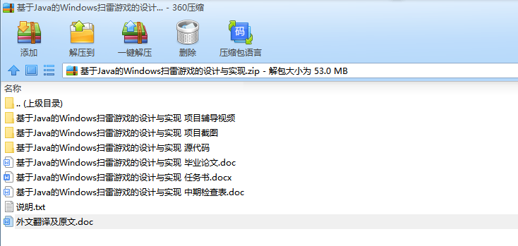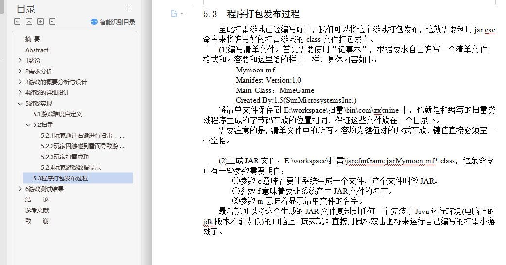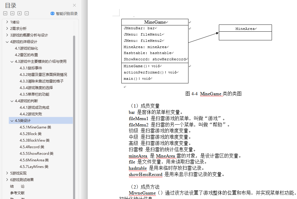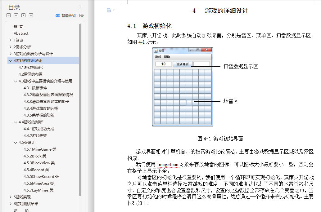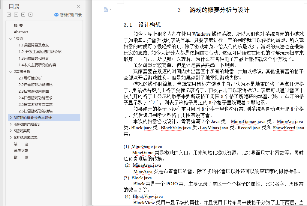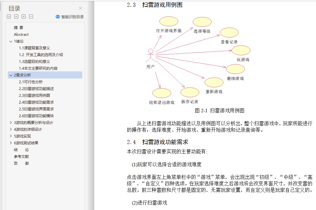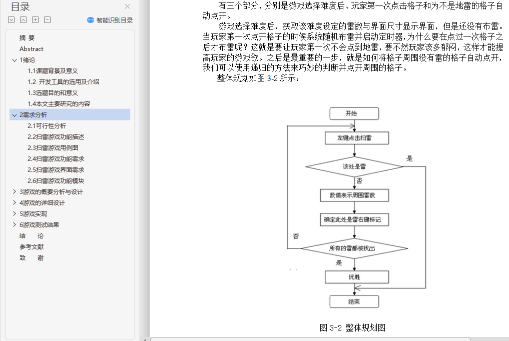 基于Java的Windows扫雷游戏的设计与实现摘 要扫雷这款游戏有着很长的历史,从扫雷被开发出来到现在进行了无数次的优化,这款游戏变得越来越让人爱不释手了,简单的玩法在加上一个好看的游戏界面,每一处的细节都体现了扫雷的魅力。所以本次的毕业设计我将开发一款扫雷游戏。本次毕业设计是以JAVA语言作为开发环境,使用Eclipse设计并开发一个类似Windows扫雷的游戏,实现其基本功能。论文首先介绍了课题背景,其次进行了需求分析及可行性分析;然后设计游戏流程,介绍雷区中的雷怎么安放和产生雷的随机算法;最后介绍游戏中可能会触发的各种时间,比如鼠标点击时间和清理掉没有雷的格子,其中鼠标事件包括点击到或没有点击到雷触发的事件和点击到重新开始以及菜单触发的事件,清理掉没有雷的格子就需要使用“递归”的方法来使该功能可以简单的实现。关键词:扫雷;Eclipse;事件;递归Design and Implementation of Mine GameAbstractMine the game has a long history, from the mine was developed to now numerous optimization, the game is becoming more and more let a person fondle admiringly, simple style with a nice game interface, every detail reflects the charm of mine. So I'm going to develop a minesweeper game.The graduate design study was designed with the JAVA language as a development environment, using Eclipse to design and develop a game like Windows minesweeper to implement its basic functions. The paper firstly introduces the background of the project and analyzes the requirements and feasibility analysis. Then the game process was designed to introduce the random algorithm of how the thunder in the minefield was placed and produced. Finally introduced the game may trigger a variety of time, such as a mouse click on the clear time and there is no ray of diamonds, mouse events including click to or no click to ray trigger events and click to restart and menu trigger events, clearing out squares no ray will need to use the "recursive" methods to make the function can be simple to implement.Key words: Mine game; Visual Basic 6.0; Affairs; Recursion目 录摘 要 iAbstract ii1 绪论 11.1 课题背景及意义 11.2 开发工具的选用及介绍 11.3 选题目的和意义 21.4 本文主要研究的内容 22 需求分析 32.1 可行性分析 32.2 扫雷游戏功能描述 32.3 扫雷游戏用例图 42.4 扫雷游戏功能需求 42.5 扫雷游戏界面需求 52.6 扫雷游戏功能模块 63 游戏的概要分析与设计 73.1 设计构想 73.2 流程规划 83.3 界面规划 93.4 算法思想 94 游戏的详细设计 114.1 游戏初始化 114.2 雷区的布置 124.3 游戏中主要模块的介绍与使用 134.3.1 鼠标事件 134.3.2 地雷及雷区表面探测情况 144.3.3 清除未靠近地雷的格子 154.3.4 游戏难度的选择 164.3.5 菜单栏的功能 164.4 游戏的判断 164.4.1 游戏成功完成 164.4.2 游戏失败 164.5 类设计 174.5.1 MineGame类 174.5.2 Block类 184.5.3 BlockView类 194.5.4 Record类 204.5.5 ShowRecord类 214.5.6 MineArea类 224.5.7 LayMines类 235 游戏实现 255.1 游戏难度自定义 255.2 扫雷 285.2.1 玩家通过右键进行扫雷,并显示小红旗 285.2.2 玩家因触碰到雷而导致游戏结束 295.2.3 玩家扫雷成功 295.2.4 玩家游戏数据显示 305.3 程序打包发布过程 326 游戏测试结果 336.1 游戏难度自定义测试 336.2 扫雷测试 356.3 玩家游戏数据显示测试 376.4 游戏数据显示区测试 396.5 递归算法测试 43结 论 44参考文献 45致 谢 47外文原文 48中文翻译 55
