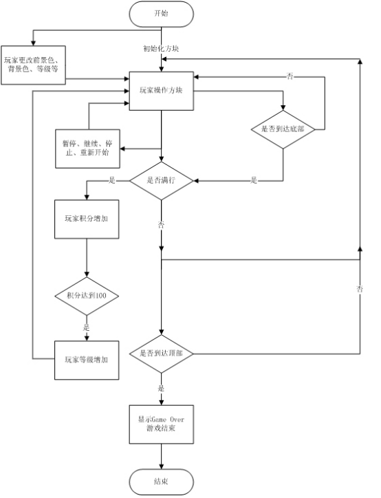 基于JavaSwing的俄罗斯方块游戏的设计与实现摘 要俄罗斯方块是一款风靡全球,从一开始到现在都一直经久不衰的电脑、手机、掌上游戏机产品,是一款游戏规则简单,但又不缺乏乐趣的简单经典小游戏,上手容易,适用范围广泛,人所共知。俄罗斯方块游戏简单的基本规则是有小方块组成的7种不同的规则图形陆续从屏幕上落下,玩家操作移动使其下落拼出一条完整的横条,随即会消失,玩家得分,游戏等级提高,当没有被消除的图形堆积到屏幕顶端时,游戏结束。俄罗斯方块游戏最初是由俄罗斯人阿列克谢・帕基特诺夫在1984年开发的休闲小游戏,曾几何时它创造了无可匹敌的商业价值,影响了一代休闲小游戏的开发与产业链。随着信息时代科技时代的不断发展和变化,计算机已经普及到每一个人的生活中,在繁忙的工作生活中,这一类休闲小游戏给人们带来了些许的放松。这篇论文详细的描述分析了经典传统的俄罗斯方块实现的基本思路和一些基本游戏规则,在此基础之上,更进一步地开发出俄罗斯方块的创新创意模式,在经典游戏基础上开发出随着分数增高而等级增高难度加大的模式,并且创意性的开发出可操控方块颜色变换的模块,并且增添了游戏声音和音乐模块。本论文对上述功能给出了具体实现流程、详细描述、和一些源代码。本论文阐述了俄罗斯方块游戏的开发和发展历史、开发此游戏的意义以及开发环境并根据软件工程开发软件和java编写程序的相关知识,对程序的需求分析、概要设计、详细设计与实现、调试运行进行了一系列描述。此次程序设计是在Microsoft Windows 7系统下,以Java为开发语言,在Eclipse开发平台上进行游戏的设计与实现。关键词:游戏设计;俄罗斯方块;软件工程;Java;Eclipse。Based on the design and implementation of Java game TetrisAbstractTetris is a popular all over the world, from the beginning to now has been enduring the computer, mobile phone, handheld game machine products, is a game with simple rules, but not the lack of fun, simple classic game, easy to use, wide application scope, basic rules of simple Tetris game evident to anyone. There is 7 different to the regular pattern of the composition of the small box on the screen in succession from the fall, the operation of the mobile game player to spell out the whereabouts of a complete bar, then disappear, game player score, game level, when the accumulation is not eliminated graphics to the top of the screen, the game is over.Tetris game is the first by the Russians in 1984 Alexei Pazhitnov developed a casual game, only a short while ago it creates unmatched business value, affect the development of a generation of casual games and industrial chain. With the information age era of science and technology continuous development and change, the computer has spread to every person's life, in the busy working life, this kind of casual games brought some people to relax.This paper gives a detailed description of the basic ideas of the traditional analysis of classic Tetris and some basic rules of the game, on this basis, further develop the creative mode in Tetris, the classic game developed with the scores increased and the higher rank of difficulty of the model, and develop creative control box color transform the module of the game, and add music and sound module. In this thesis the function given the specific implementation process, described in detail, and some of the source code.This paper describes the development history and development of Tetris game, developed this game meaning as well as the development environment and according to the related knowledge of software engineering and software development of Java programming, analysis, outline design of program requirements, detailed design and implementation, debugging and running a series of description.The program is designed in Microsoft Windows 7 system, with Java as the development language, Eclipse development platform for the design and implementation of the gameKey Words: Game design; Tetris, Software engineering, Java;Eclipse。目录基于Java的俄罗斯方块游戏的设计与实现 I摘 要 IBased on the design and implementation of Java game Tetris IIAbstract II1 绪论 11.1程序开发背景及意义 11.2开发技术概述 21.3俄罗斯方块游戏的研究现状 21.3.1 国内外研究现状 21.3.2 文献综述 32相关技术 42.1JAVA简介 42.2 Swing组件简介 42.3Eclipse开发平台简介 52.4系统平台环境: 62.4.1 硬件平台: 62.4.2 软件平台: 63 系统分析 73.1可行性分析 73.1.1经济可行性分析 83.1.2技术可行性分析 83.1.3社会可行性分析 83.2需求分析 83.2.1 功能性需求 93.2.2 非功能性需求 93.2.3 接口控制 94 系统的概要设计 114.1 系统的功能设计 114.1.1 手动处理业务的基本流程 114.1.2 基本流程的功能模块 125 系统的详细设计与实现 155.1 游戏主界面显示模块 155.2 画布、方块显示模块 165.2.1 背景画布模块设计 165.2.2 预览方块模块设计 195.2.3 方块移动、旋转模块设计 215.3 控制面版模块 255.3.1 菜单栏模块设计 255.3.2 控制面板按钮设计 266 系统的测试运行 296.1 测试概述 296.1.1 测试原则 296.1.2 测试方法 306.1.3 测试意义及注意事项 316.2 游戏代码、算法的测试 316.3 游戏界面菜单选项的功能测试 326.4 按键事件的功能测试 346.5 方块的堆砌与消行功能测试 356.6 测试结果 35结 论 36参考文献 38致 谢 39附录A 外文原文 40The psychology of Tetris 40附录B 外文翻译 43俄罗斯方块的心理效应 43