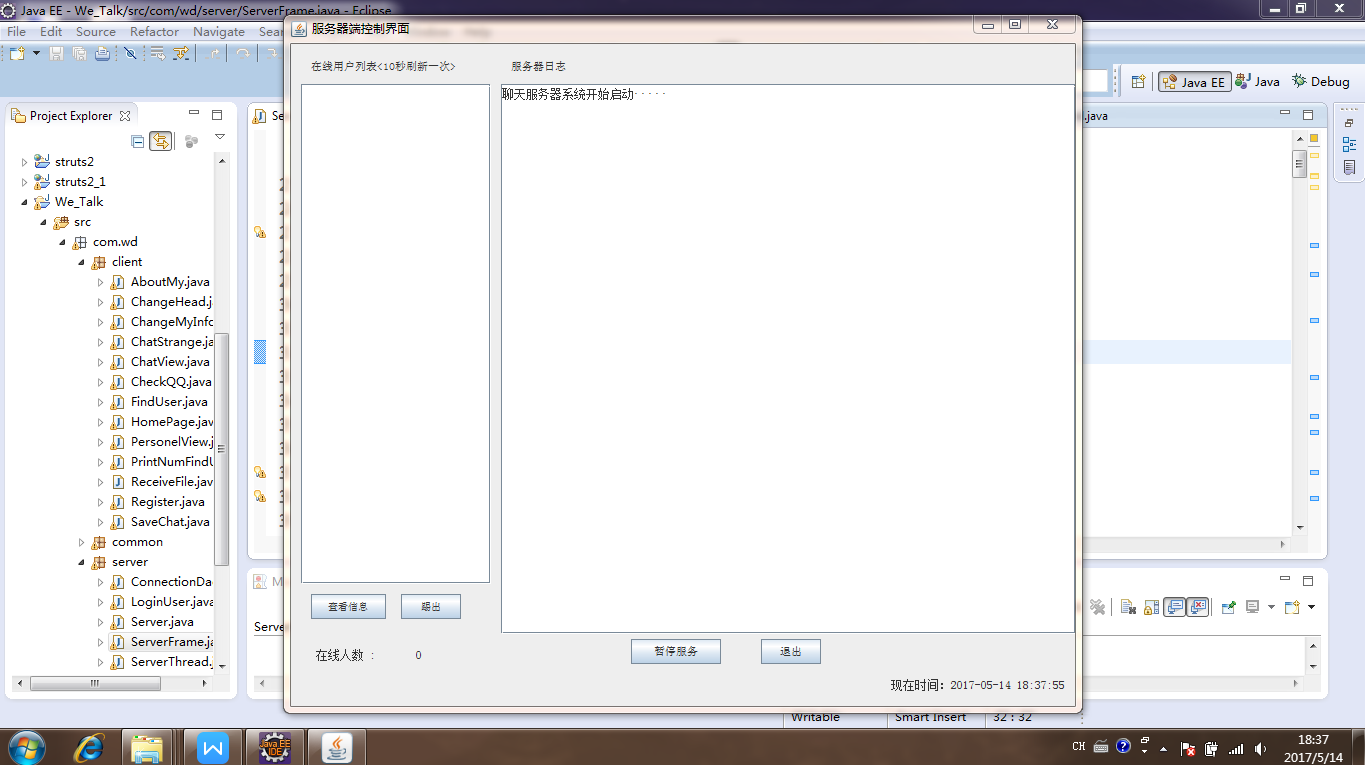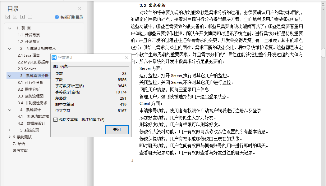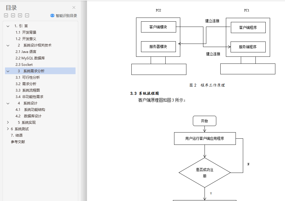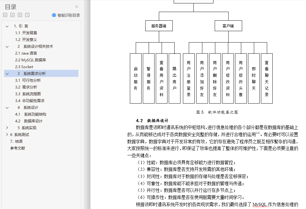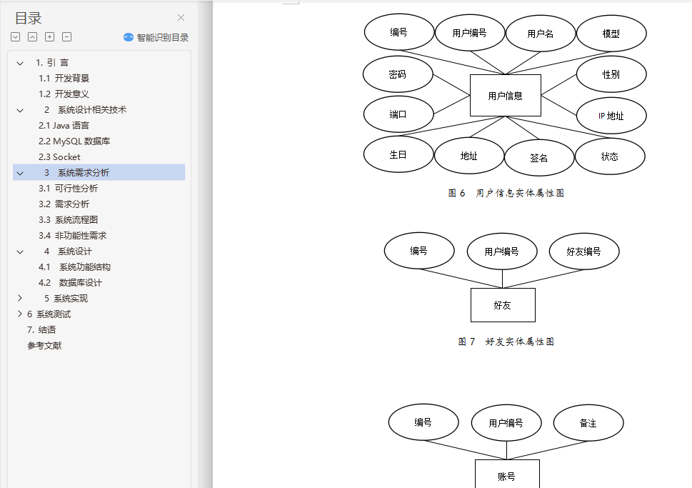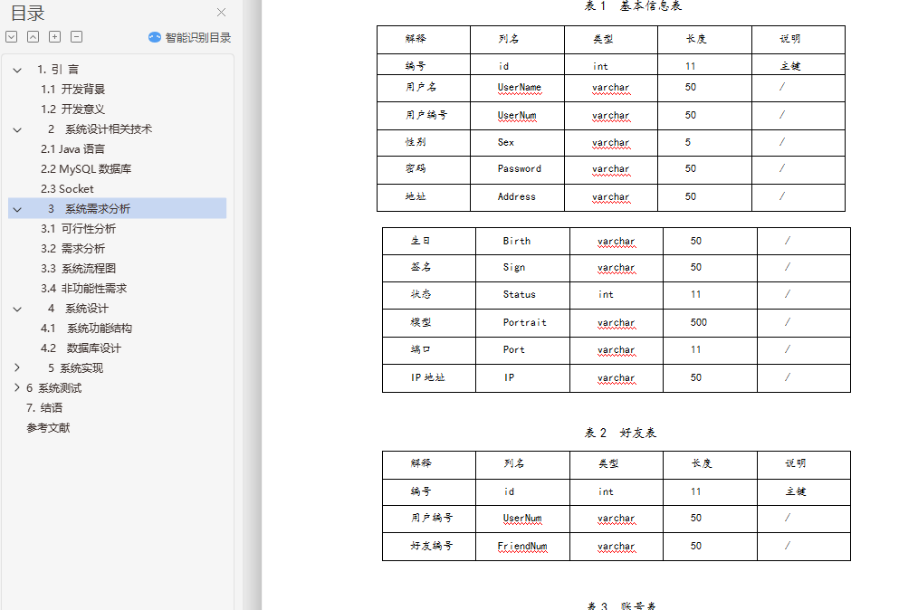 目 录1. 绪 论 11.1. 开发背景 11.2. 开发意义 12. 系统设计相关技术 22.1 Java语言 22.2 MySQL数据库 22.3 Socket 23. 系统需求分析 33.1 可行性分析 33.2 需求分析 43.3 系统流程图 53.4 非功能性需求 64. 系统设计 74.1 系统功能结构 74.2 数据库设计 85. 系统实现 105.1 系统运行环境和开发平台 105.2 系统实现 116. 系统测试 176.1 测试内容 186.2 测试预期结果 186.3 测试用例 186.4 测试结果 197. 结语 20参考文献 21基于JavaSocket的即时通讯系统设计与实现摘要:即时通讯软件即所谓的聊天工具,其主要用途是用于文字信息的传递与文件传输。使用eclipse作为即时通讯软件的开发工具,使用Socket建立通讯渠道,多线程实现多台计算机同时进行信息的传递,swing技术等进行实际开发相对比较合适。通过一些轻松的注册登录后,在局域网中即时聊天便可以成功进行。关键字:即时通讯软件,局域网聊天,Java,SocketDesign and Implementation of Instant Messaging Software for BoWangAbstract:Instant messaging software is the so-called chat tool, its main purpose is for text messaging and file transfer. The use of eclipse as instant messaging software development tools, the use of Socket to establish communication channels, multi-threaded multi computer and information transmission, swing technology for the actual development of relatively suitable. After a few easy to log in, in the LAN chat can be successful.Key words:Instant messaging software LAN chat Java Socket