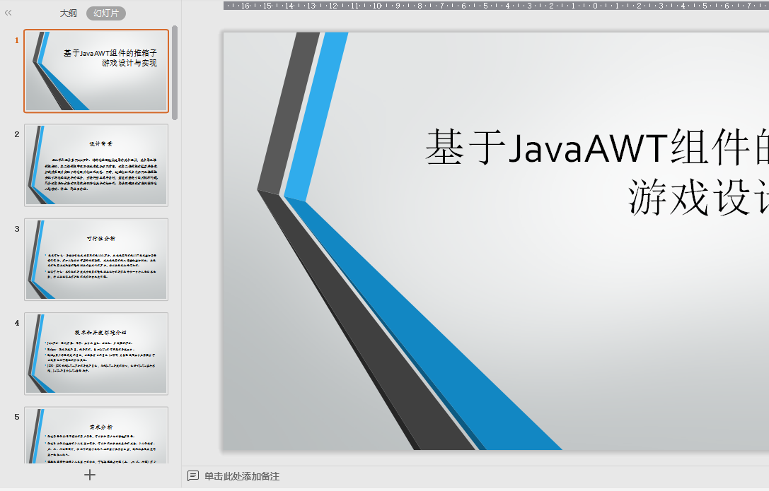 基于JavaAWT组件的推箱子游戏设计与实现摘 要社会在进步,人们生活质量也在日益提高。高强度的压力也接踵而来。社会中急需出现新的有效方式来缓解人们的压力。此次设计符合了社会需求,Java推箱子游戏可以让人们在闲暇之余,体验游戏的乐趣。具有操作简单,易于上手的特点。推箱子游戏的玩法十分简单――控制人物绕过障碍物,到达目的地。此次毕业设计基于Java语言。将游戏地图做成通用的关卡设计,关卡用二维数组实现,在二维数组中设置值域来表示不同对象,运用二维数组的遍历算法来加载对应图片实现了游戏图片初始化状态。同时,通过初始化多个不同二维数组实现了游戏地图关卡的设计,方法巧妙且简单易行,有效的解决了图片排布问题。充分运用类和方法的调用来实现游戏关卡的初始化。用读取键值的方法判断游戏人物移动、停止、到达目的地。舒缓的音乐配合有趣的步骤,相信能引起很多人的兴趣。作为一个具有悠久历史的游戏,也能够引起人的怀念和共鸣。关键词 Java 游戏 二维数组 算法 读取键值 栈Sokoban based on JavaAbstractSocial progress, quality of life is also increasing. High-intensity pressure also follows. The emergence of new social urgently needed an effective way to relieve people's stress. This is designed to meet the needs of the community, Java Sokoban game allows people in her spare time, experience the fun of the game. With simple operation, easy to use features.Sokoban game’s rule is very simple - control characters around obstructions, to arrive at the destination. The graduation project is based on Java language. Game map to make a generic level design, level with two-dimensional array implementation, set the domain in a two-dimensional array to represent different objects, using the two-dimensional array of times calendar calculation method is realized to load the corresponding picture game image initialized state. At the same time, through the initialization of several different two-dimensional arrays realized the design of the game map level, a method is clever and simple, easy to effectively solve the problem of the picture arrangement. Make full use of calling classes and methods to implement the initialization of the game levels with reading the key value method to judge the characters move, stop, or reaching its destination. Soothing music with interesting step, which will hopefully lead to a lot of people's interest. As a game with a long history, but also can cause people to miss and resonance.Key Words: Java game; two-dimensional arrays; algorithm; key value method; stack;目 录摘 要 iAbstract ii引 言 11 系统分析 21.1 技术可行性分析 21.1.1 可行性目的 21.1.2 可行性研究前提 21.1.3 算法可行性分析 21.1.4 平台选择 61.2 需求分析 61.2.1 引言 61.2.2 游戏需求 61.2.3 软硬件需求 91.2.4 接口控制 101.3 方案论证 101.3.1 C++语言的优点 101.3.2 Java语言的优点 111.3.3 C语言的优点 131.3.4 方案选择 142 概要设计 162.1 游戏设计分析 162.1.1 地图文件的引用 182.1.2 程序运逻辑 192.1.3 绘图 202.1.4 显示平台 222.2 注意事项 242.3 游戏流程图 242.4 函数模型 253 详细设计 283.1 游戏总体结构与代码 283.2 选关模块 293.3 地图的绘制形成 303.4 小人与箱子移动的算法 313.5 小人上下移动模块 333.6 悔棋模块 343.7 音乐控制 354 游戏测试 384.1 软件测试 384.1.1 软件测试简介 384.2 测试方法 384.3 测试步骤 384.4 游戏系统性能分析 415 项目经验与总结 426 参考文献 447 致谢 458 外文原文及中文翻译 46