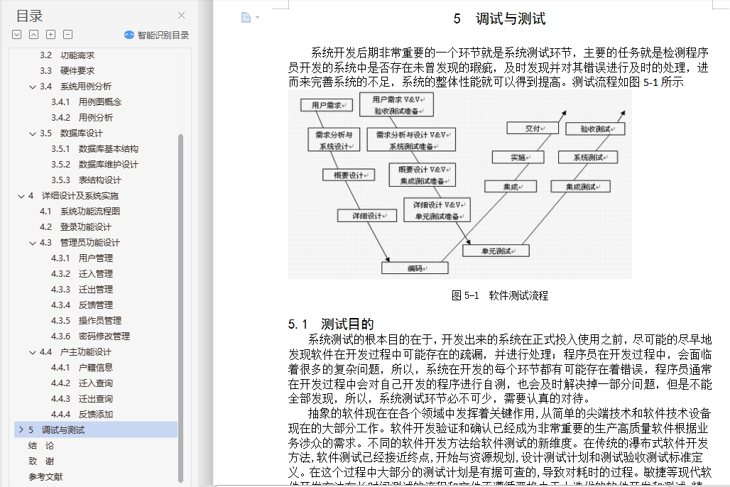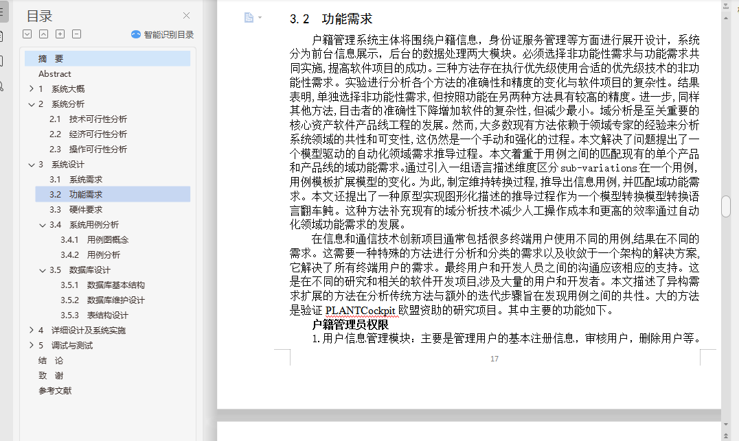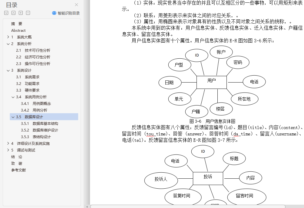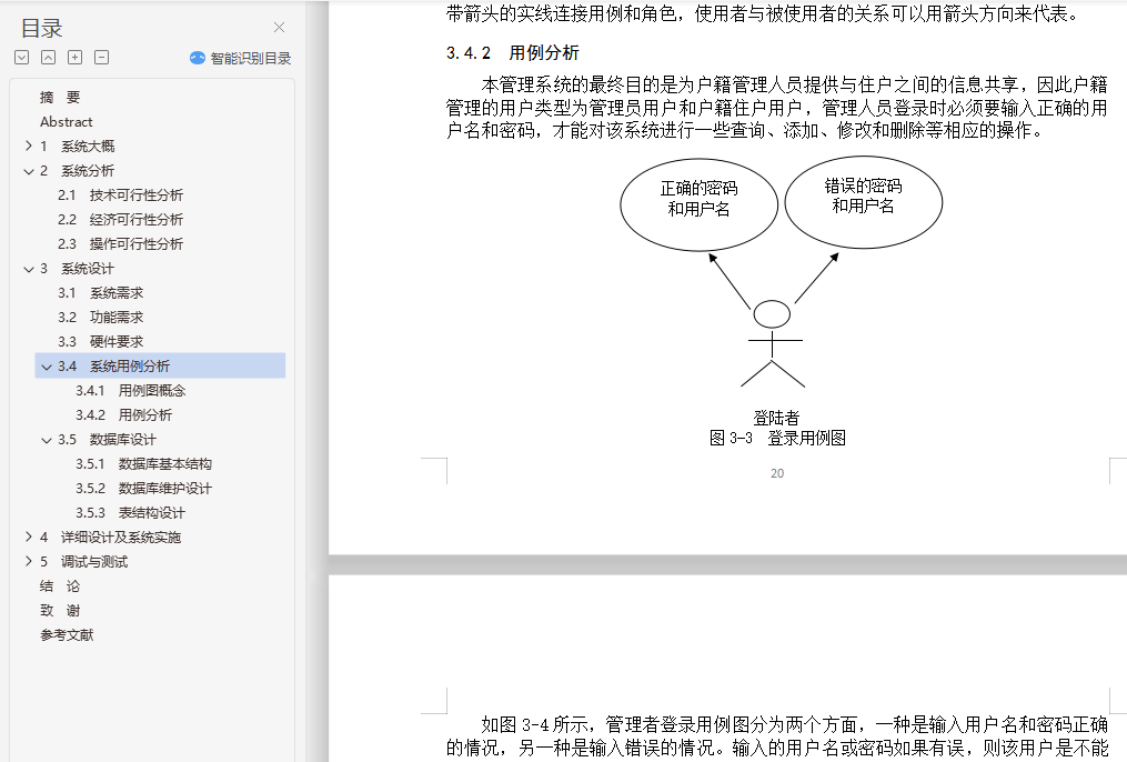 基于JavaWeb的居民户籍管理系统的设计与实现摘 要当今社会人们生活质量越来越高,人们对生活品质的追求不断提升,对于孩子求学,变更住所等情况时有发生,因此对于户籍变动管理就显得十分重要,管理用户的户籍信息可以有效防止信息错乱,信息管理过程中出现问题可能会带来很多不必要的麻烦;因此,需要进行信息化对户籍信息进行管控。本系统主要设计出发点就是围绕着户籍管理方面来进行设计,开发一套符合现代社会需求户籍管理的系统平台,给用户更多的便利和实惠;系统主要包括了登陆模块,注册模块,用户模块,户籍模块,迁入出模块,身份管理模块,缴费模块等等,系统设计采用的是WEB开发模式,结合简单的架构,运用java的开发语法,在强大的数据库支持下完成的,系统开发符合软件工程标准,数据准确,系统稳定。关键词 户籍管理;数据库;TOMCATDesign and implementation of household registration management systemAbstractWith the improving of the people's living standard, people's life level rising, schooling for children, change of domicile, and so on and so forth, so for the household registration management is very important to manage the user's registration information can effectively prevent the information confusion, information problems may lead to unnecessary trouble; Therefore, the need for information controls for household registration information.This system main design starting point is around the household register management to design, develop a accords with modern household service management system platform, give users more convenience and benefit; System mainly includes the login module, registration module, the user module, the household registration module, moved out of the module, identity management module, capture expends module and so on, the system design is used in WEB development model, combined with simple structure, using the development of Java syntax, with powerful database support, system development accord with standard of software engineering, data accuracy and system stability.Key words: Household register management; database; TOMCAT目 录摘 要 IAbstract II1 系统大概 11.1 系统背景 11.2 研究意义 11.3 本文结构 21.4 开发平台简介 21.4.1 Java语言的特点 21.4.2 J2EE概述 31.4.3 B/S结构概述 41.4.4 MySQL 51.4.5 Tomcat 61.4.6 JSP.NET 71.4.7 开发流程 81.4.8 Eclipse简介 101.4.9 office工具简介 102 系统分析 122.1 技术可行性分析 132.2 经济可行性分析 142.3 操作可行性分析 153 系统设计 163.1 系统需求 163.2 功能需求 173.3 硬件要求 183.4 系统用例分析 193.4.1 用例图概念 193.4.2 用例分析 203.5 数据库设计 213.5.1 数据库基本结构 213.5.2 数据库维护设计 223.5.3 表结构设计 244 详细设计及系统实施 264.1 系统功能流程图 264.2 登录功能设计 274.3 管理员功能设计 274.3.1 用户管理 284.3.2 迁入管理 294.3.3 迁出管理 294.3.4 反馈管理 304.3.5 操作员管理 314.3.6 密码修改管理 314.4 户主功能设计 314.4.1 户籍信息 314.4.2 迁入查询 324.4.3 迁出查询 324.4.4 反馈添加 325 调试与测试 345.1 测试目的 345.2 调试过程 355.3 功能测试 35结 论 40致 谢 41参考文献 42外文原文 42外文翻译 50