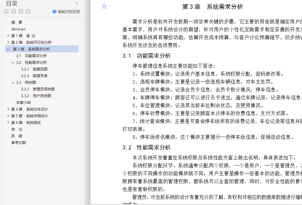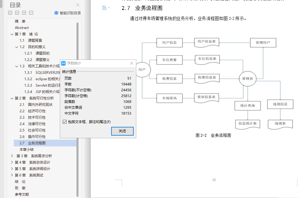 摘 要如今,我国现代化发展迅速,人口比例急剧上升,在一些大型的商场,显得就格外拥挤,私家车的数量越来越多,商场停车难得问题凸显,对于停车场的合理利用有助于缓解用户停车压力,鉴于这样的背景;初步设定系统功能主要包括,用户信息管理,违规车辆信息管理,刷卡停车牌管理,停车位信息管理,停车计费,信息查看管理等功能模块。本系统采用JAVAEE开发形式,利用数据库来完成数据存储功能,运用了B/S形式的开发模式,严格按照了软件工程的开发模式进行开发,保证系统的良好运行。关键词:停车场系统;Javaee;TomcatJAVAEE - based parking management systemAbstractNowadays, our country modernization is developing rapidly, urban population and the rapid increase of floating population in some large shopping malls, supermarkets appear very crowded, The number of private cars is increasing, shopping malls supermarket parking difficult problem, for the rational use of the parking lot helps to alleviate the pressure of the users of parking, in view of this background; Preliminary setting system function mainly includes user information management, illegal traffic information management, management of credit card the stop sign, Parking spaces information management, parking billing, information viewing management and other functional modules This system adopts the JAVAEE development form, sing the database to complete the data storage function, is in the form of web development model, system design to follow the software engineering development mode, ensure the system perform well .Keywords:Parking system ; Javaee ; tomcat目 录摘 要 iAbstract ii第1章 绪 论 11.1 课题背景 11.2 目的和意义 11.2.1 课题目的 11.2.2 课题意义 11.3 相关工具和技术介绍 21.3.1 SQLSERVER2005的相关介绍 21.3.2 eclipse的相关介绍及tomcat配置 31.3.3 Servlet的运行原理 31.3.4 JSP的相关介绍 5第2章 系统可行性分析 72.1 国内外研究现状 82.2 经济可行性 82.3 技术可行性 92.4 法律可行性 92.5 社会可行性 92.6 操作可行性 102.7 业务流程图 10本章小结 11第3章 系统需求分析 123.1 功能需求分析 123.2 性能需求分析 123.2.1 数据流图 133.2.2 数据字典 133.3 用例图 153.3.1 管理员用例图 153.3.2 用户用例图 15本章小结 16第4章 系统总体设计 174.1 系统模块设计 174.2 数据库分析步骤 174.3 数据库设计 184.3.1 E-R图设计 184.3.2 表结构设计 184.4 数据库链接代码部分 20本章小结 21第5章 系统详细设计 225.1 系统运行平台设置 225.2 系统的实现 225.2.1 登录模块的实现 225.2.2 用户主界面的实现 235.2.3 管理员主界面实现 255.2.4 密码修改模块的实现 265.2.5 公告功能模块的实现 265.2.6 车位功能模块的实现 275.2.7 违规管理模块的实现 295.2.8 注册模块的实现 30本章小结 31第6章 系统测试 326.1 测试目的 326.2 测试方法 326.3 测试内容及需求 336.3.1 界面测试 336.3.2 功能测试 346.3.3 需求测试 346.4 测试用例和结果 34本章小结 39结 论 41致 谢 42参考文献 43附录一 外文文献(原文) 44附录二 外文文献(译文) 49