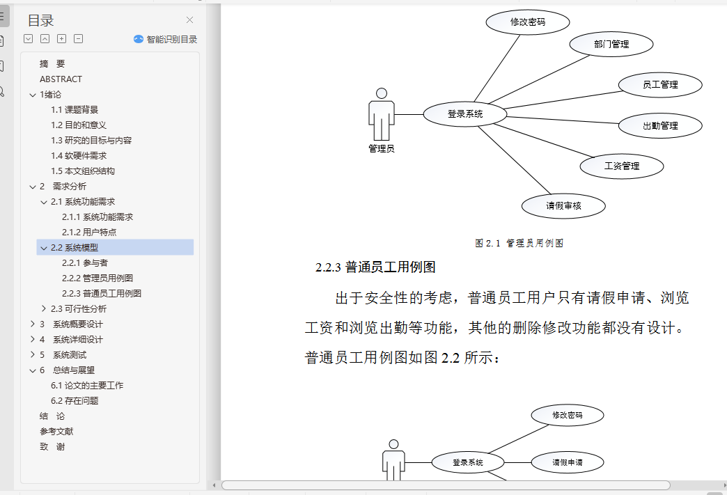 摘 要随着电子信息的飞速发展,计算机已经融入到了生活的各个方面,越来越多的企业开始使用电子计算机来对企业进行管理,信息化的时代已经到来,各个企业无论大小都需要一个信息化的管理系统来对自己公司内部的员工信息进行管理,企业员工信息管理系统是一个针对此问题而进行开发的系统,使得公司的员工管理不如现代化,开启了一个新的管理模式。本文首先对比了国内外企业员工信息管理的现状,明确了需求的不同以及需要吸收借鉴的部分,然后在员工信息管理的需求基础上,通过系统的功能需求与系统的可行性分析,确立了企业员工信息管理系统的基本功能,构建了该系统的框架以及结构设计,然后对该系统的各个功能的主要代码进行分析、设计,最后对系统的各个功能进行测试,完成了本次系统的开发。企业员工信息管理系统分为两大模块,管理员模块和普通员工模块,管理员可以操作系统的所有功能,主要包括部门管理、员工信息管理、出勤管理、工资管理以及请假审核等功能;为了信息的保密以及系统的安全性,普通员工只具有查看工资以及请假的功能。文章以需求分析,系统概要设计,系统功能实现,系统测试等为主要内容,详细介绍了一个基于Web技术的B/S结构的企业员工信息管理系统。本系统主要使用MyEclipse软件进行程序编写,使用JSP作为前台的开发语言,使用MySql作为后台的数据库管理系统,服务器采用tomcat,开发出的一个适应现代社会发展的企业员工信息管理系统。关键词:员工信息,JSP,B/S结构The design and implementation of enterprise employee information management systemABSTRACTWith the rapid development of electronic information, computer has been integrated into all aspects of life, more and more enterprises begin to use computer to manage the enterprise, the information age has arrived, regardless of the size of each enterprise needs an information management system to the company's internal staff information management, employee information a management system is to solve this problem for the development of the system, making the company's employee management as the modernization, opening a new management mode.This paper first compares the present situation of domestic and foreign enterprise employee information management, clarifies the different demand and need to absorb the part, and then the demand based on the employee information management, through the feasibility of functional requirements and system analysis, establishes the basic function of enterprise staff information management system, construct the system framework and structure design, and then the main code for each function of the system is analyzed and designed, and finally test the various functions of the system, completed the development of this system. Employee information management system is divided into two modules, administrator module and general staff module, the administrator can all functions of the operating system, including department management, employee information management, attendance management, salary management and audit functions in order to leave; information security and secrecy system, general staff wages and leave only with a view the function of.This paper takes requirement analysis, system outline design, system function realization and system test as the main contents, and introduces a B/S enterprise employee information management system based on Web technology in detail. This system mainly uses MyEclipse software to program and use JSP as the development language, using MySQL as the background database management system, using Tomcat server, an information management system for enterprise employees adapt to the development of modern society developed.Keywords: employee information,JSP,B / S structure目录摘 要 1ABSTRACT 31 绪论 11.1课题背景 11.2目的和意义 21.3研究的目标与内容 31.4软硬件需求 41.5本文组织结构 42 需求分析 62.1系统功能需求 62.1.1系统功能需求 62.1.2用户特点 82.2系统模型 82.2.1参与者 82.2.2管理员用例图 82.2.3普通员工用例图 92.3可行性分析 102.3.1技术的可行性 102.3.2经济的可行性 112.3.3操作可行性 112.3.4法律的可行性 123 系统概要设计 133.1系统设计原则 133.2系统架构设计 143.3数据库设计 163.3.1数据库的概念结构设计 163.3.2数据库的逻辑结构设计 173.3.3数据库的连接原理 214 系统详细设计 254.1系统登陆页面实现 254.2管理员模块 324.2.1部门信息管理 334.2.1.1部门信息录入 334.2.1.2部门信息管理 344.2.1.3部门信息删除 374.2.2员工信息管理 384.2.2.1员工信息信息录入 384.2.2.2员工信息管理 394.2.3出勤管理 434.2.3.1出勤录入 434.2.4修改密码 434.2.5工资管理 434.2.6请假审核管理 444.2.7退出系统 454.3普通员工模块 454.3.1请假申请 454.3.2我的工资浏览 464.3.3修改密码 475 系统测试 485.1系统测试目的与意义 485.2系统测试方法 485.2.1系统测试计划 485.2.2系统测试方法 495.2系统功能测试 495.2.1主页面的登录模块测试 495.2.2修改密码的模块测试 505.2.3部门管理的模块测试 515.2.4员工管理的模块测试 515.2.5出勤管理的模块测试 525.2.6工资管理的模块测试 535.2.7请假审核的模块测试 545.2.8我的请假的模块测试 555.3其他错误 556 总结与展望 576.1论文的主要工作 576.2存在问题 57结 论 59参考文献 61致 谢 62外文原文 63中文翻译 77