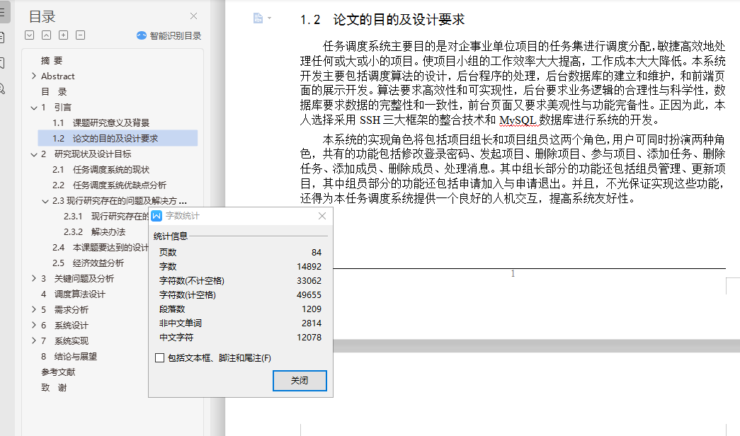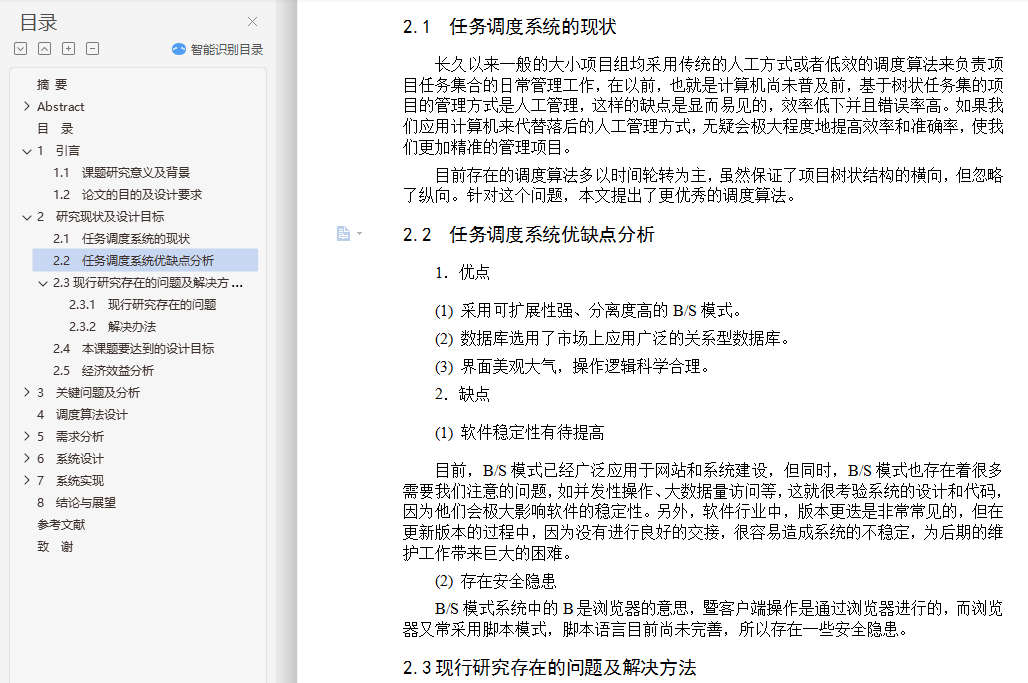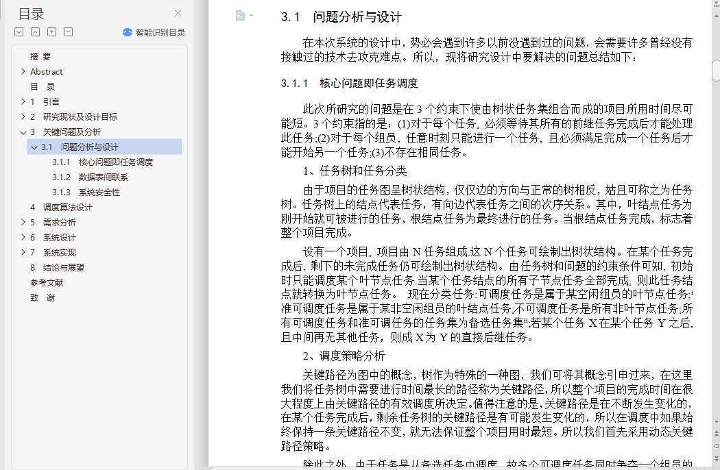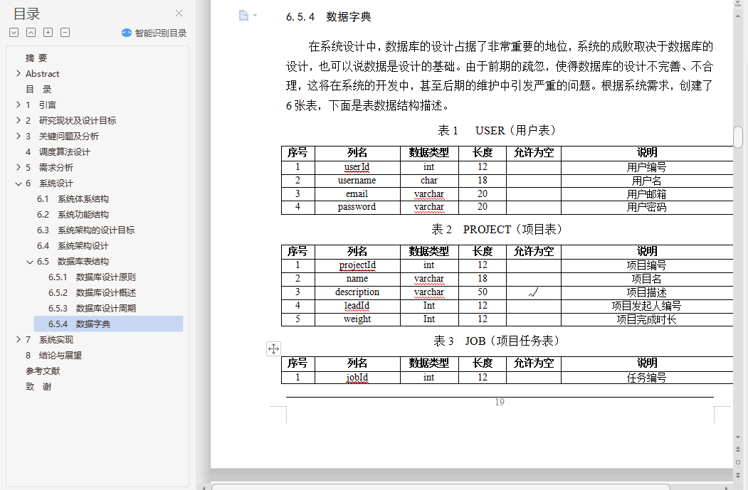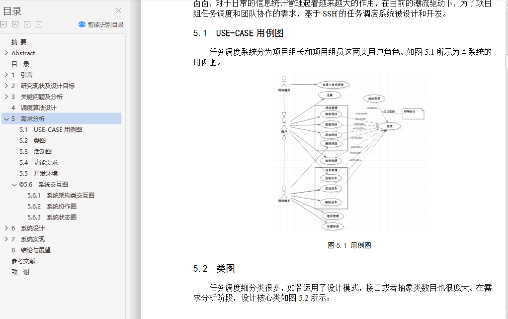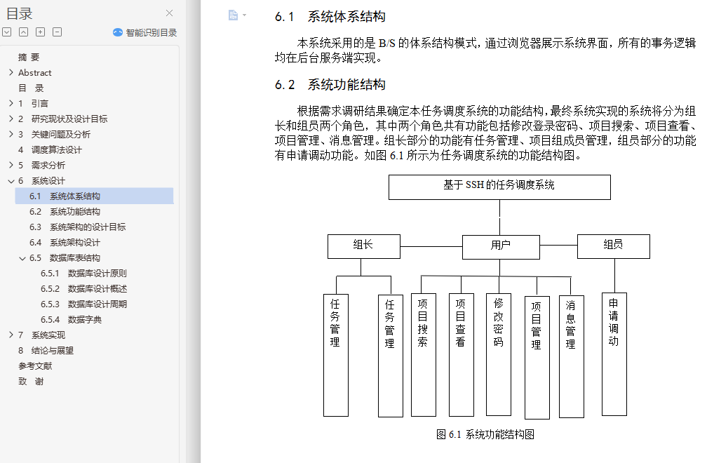 基于JSP远程任务调度管理系统的设计与实现摘 要随着科学技术的飞速发展和各行各业的分工愈发明细化,对于改革传统的人工任务调度方式的呼声越来越大。得益于快速发展的计算机技术,我们看到了改革的方向。本系统是针对企业或者事业单位甚至一个小团队的任务调度而设计的,目的是改变传统的调度方式,通过计算机来计算各项任务的最佳人员分配和最佳时间分配,绘制出任务调度图,以此更好地进行各项任务的调度和团队协作,该系统是一种任务调度系统。本系统采用了B/S体系结构,主要实现语言是JAVA,后台数据库使用的是MySql。整个系统实现角色将分为组长和组员,实现功能包括帐号注册、修改信息、项目管理、任务管理、消息管理、团队管理等功能。本任务调度系统的设计实现可以远程实现任务的调度与科学分配,并通过评估各项任务与参与人员,来使项目更好的进行任务调度。关键词: 任务调度;B/S;SSHDesign and Implementation of Task Scheduling System Based on SSHAbstractWith the rapid development of science and technology and the division of labor in all walks of life more and more refined, for the reform of the traditional task of scheduling tasks more and more. Thanks to the rapid development of computer technology, we see the direction of reform. The purpose of this system is based on the design and implementation of the task scheduling system based on SSH, which is designed for the task scheduling of enterprises or institutions or even a small team. The purpose is to change the traditional scheduling mode and calculate the most Good staff allocation and the best time allocation, draw the task scheduling map, in order to better carry out the task scheduling and team collaboration, the system is a task scheduling system.The system uses a B / S architecture, the main realization of the language is JAVA, the background database using MySql. The whole system implementation role will be divided into group leader and team members, to achieve the functions, including account registration, modify information, project management, task management, message management, team management and other functions. The design and implementation of the task dispatching system can realize the scheduling and scientific allocation of the task remotely, and make the task plan be carried out by evaluating the tasks and the participants.Keywords: Task scheduling; B/S; SSH目 录摘 要 IAbstract II目 录 III1 引言 11.1 课题研究意义及背景 11.2 论文的目的及设计要求 12 研究现状及设计目标 22.1 任务调度系统的现状 22.2 任务调度系统优缺点分析 22.3现行研究存在的问题及解决方法 22.3.1 现行研究存在的问题 22.3.2 解决办法 32.4 本课题要达到的设计目标 32.5 经济效益分析 43 关键问题及分析 53.1 问题分析与设计 53.1.1 核心问题即任务调度 53.1.2 数据表间联系 63.1.3 系统安全性 64 调度算法设计 75 需求分析 85.1 USE-CASE用例图 85.2 类图 85.3 活动图 95.4 功能需求 105.5 开发环境 105.6 系统交互图 115.6.1 系统架构类交互图 115.6.2 系统协作图 125.6.3 系统状态图 136 系统设计 156.1 系统体系结构 156.2 系统功能结构 156.3 系统架构的设计目标 166.4 系统架构设计 166.5 数据库表结构 176.5.1 数据库设计原则 176.5.2 数据库设计概述 186.5.3 数据库设计周期 186.5.4 数据字典 197 系统实现 217.1 公共模块 217.1.1 模块功能 217.1.2 模块代码 217.2 注册模块 267.2.1 模块功能 267.2.2 模块代码 267.3 登录模块 297.3.1 模块功能 297.3.2 模块代码 297.4 搜索模块 317.4.1 模块功能 317.4.2 模块代码 317.5 项目管理模块 337.5.1 模块功能 337.5.2 模块代码 337.6 任务调度模块 407.6.1 模块功能 407.6.2 模块代码 408 结论与展望 49参考文献 50致 谢 51