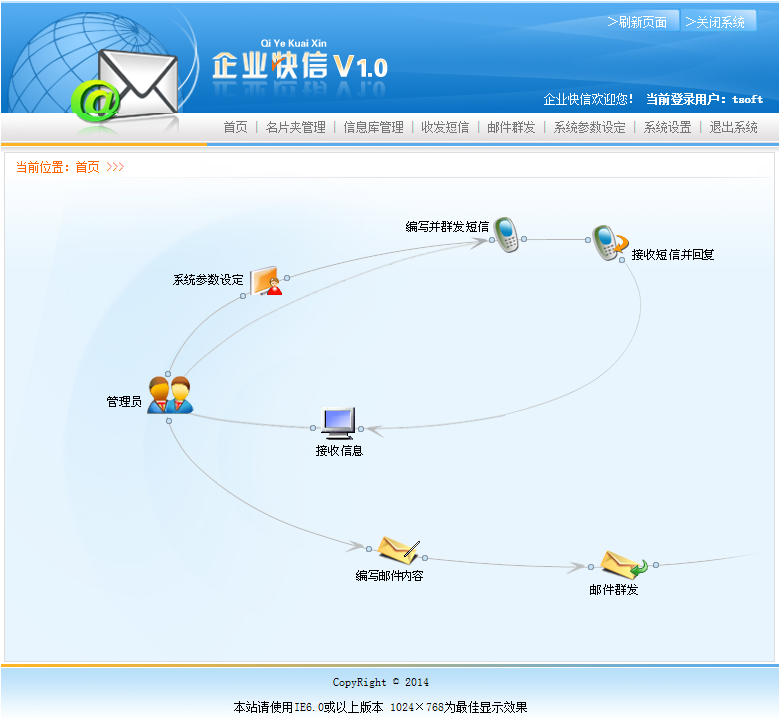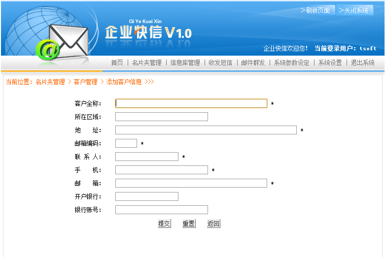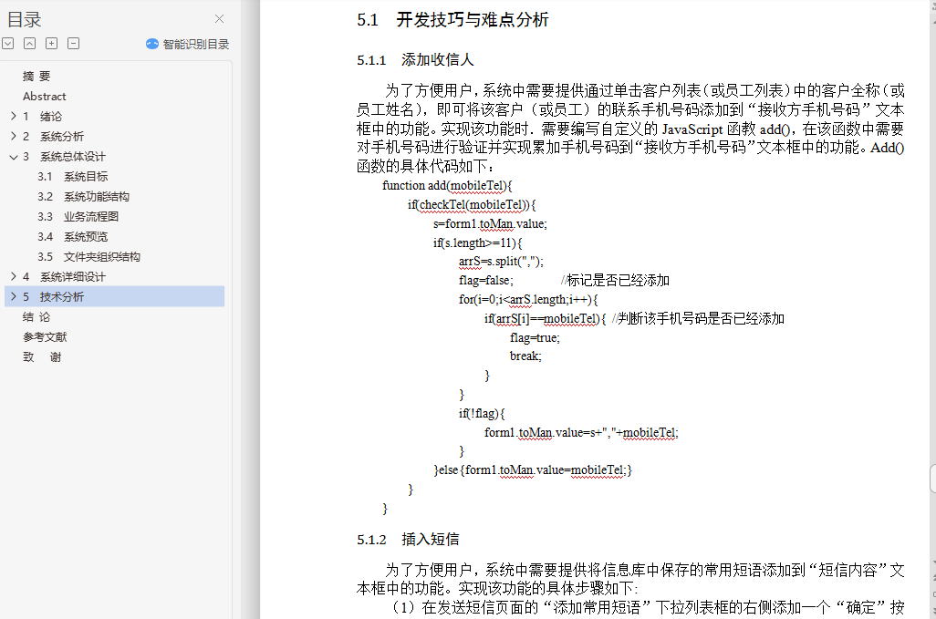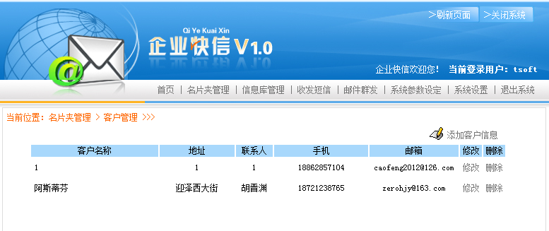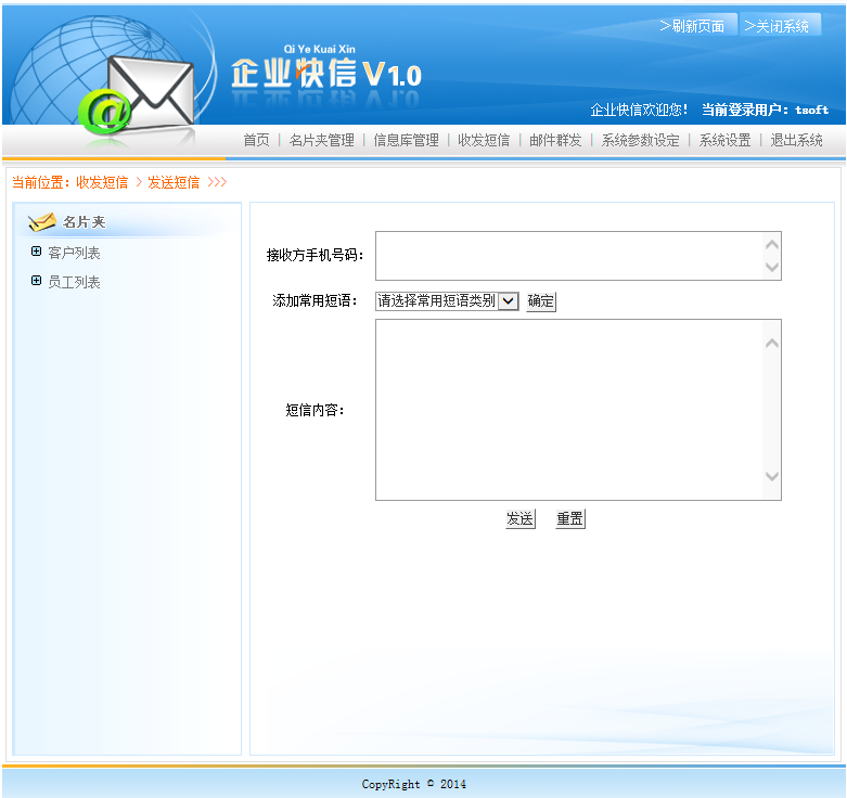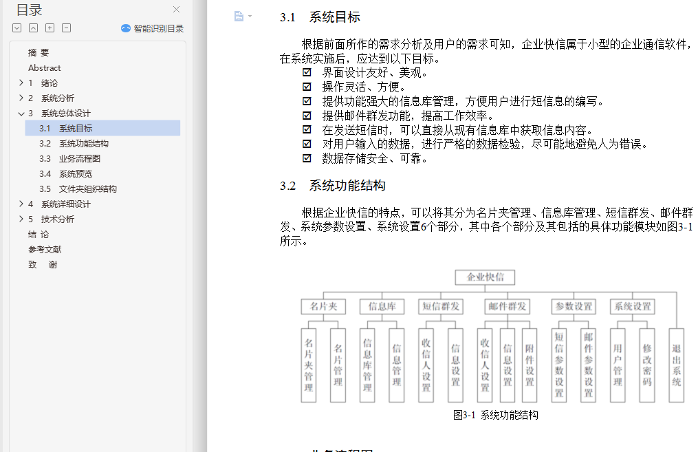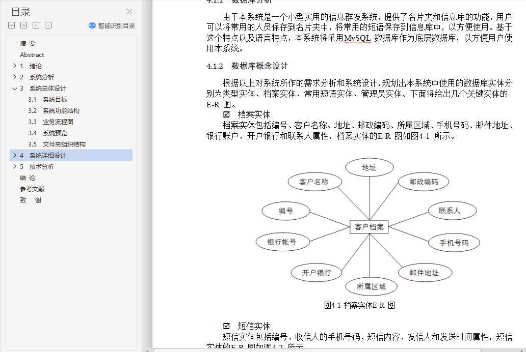 JSP企业快信(短信猫+java邮件)的设计与实现摘 要计算机网络的出现到现在已经经历了翻天覆地的重大改变。因特网也从最早的供科学家交流心得的简单的文本浏览器发展成为了商务和信息的中心。到了今天,互联网已经成为了大量应用的首选平台,人们已经渐渐习惯了网络交易,渐渐对网络产生了依赖。公司会议、机票预定、酒店预定、公司之间货物订单的下达等等工作都可以通过网络快速的完成。网络已经渗透到了人们生活中的方方面面,甚至已经延伸至人们日常的衣食住行各个领域。本项目就是在此背景下设计的企业快信系统。本系统在开发中,采用了 MYSQL 数据库,同时使用到了 Java Swing、短信猫组件、Java MailAPI 等相关技术。在进行详细设计之前,根据总体设计的结构,确定每部分功能的解决方案,并完成相关技术的可行性分析以及技术原型的实现。在该系统中,采用数据服务器,和客户机相结合形成 B/S 结构,由相关人员或系统管理员执行如系统的备份、恢复、修改等重要操作,从而用来提高系统的安全性,并且降低了了黑客通过 Web 入侵来获取以及改变系统中重要数据信息的可能性。同时,采用 Web 客户机架构 B/S 三层结构,Web 客户机可通过 Internet 或专线连接应用服务器,向其发送指令,从而获取服务。这样做的优点是用浏览器便可进行,使用起来方便快捷,为客户提供了很大的便利。而对于记录管理,系统维护功能而言,主要是对记录信息进行处理,即对数据库信息进行添加,查询,导入和导出操作,这部分功能涉及的主要技术为通过 java连接 MYSQL 数据库,并通过 Java 代码完成对表内信息的查询和添加操作。本文首先对企业快信的开发进行了较深入的研究,然后对短信发送与邮件发送原理进行了介绍,接下来对系统的概要设计、功能模块、数据库设计,以及名片夹管理功能与邮件发送功能的具体实现作了细致阐述,最后是系统效果的展示。企业快信系统是一个集短信与邮件为一体的移动商务应用系统。是针对企业内部II及外部不同需求和应用方面,而专门定制开发的系统软件。它完全集成了企业的业务推广、客情沟通、内部管理等应用功能。企业快信的作用是帮助企业解决企业内部、企业与外部沟通难、信息不能及时传播等问题。为此,系统提供邮件群发、短信群发、人员档案、信息的管理等功能。系统是短信猫与邮件在企业商务应用中的典型实例,因此必然受到众多企业的青睐,成为企业通信的最佳选择。关键词:短信发送;邮件发送;企业快信The Design and Implementation of Enterprise’s Express Letter SystemAbstractComputer network has undergone a great change.The internet has also developed intoa business and information center from the earliest.The company eeting,airlinereservation,hotel reservation, release the order of goods between the companies and so on,these all can becompleted through the network quikly.Internet has penetrated into every aspect of people’s life, even extending to the basic necessities of life in all areas of people’s daily life, The enterprise’s express letter system is designed in this context.The system development uses MYSQL database, uses Java Swing, GSM Modem, Java mail API and other Technology. Before the detailed design of the structure of the overall design to determine the solution of some of the features, and complete the feasibility analysis and prototype implementation of the related technologies. In this system, data server and client combine to form the C/S structure, performed by the financial staff or system managers, such as system backup, restore, and modify the amount of important operating to improve the security of the system, reduce hacker by Web Intrusion to access and change the possibility of important information. The same time, the use of the Web client organizations into the B / S three-tier Web client can be connected through the Internet or green application server, send commands, and thus access to services. The advantage is you can operate from a browser, easy to use, fast and efficient, convenient to the customer with the greatest convenience. For records management, system maintenance functions, record information that the database information to add, query, import and export operations, some of the features involved in technology to through VC6 connect the MYSQL database, and Java code to query and add operations on the information in the table.In this paper, we research the development of enterprise’s express letter system at first,and then introduce the principles of sending SMS and mails, After that, we made a elaboration of the summary of the system design, function modules, database design,business card folder management capabilities, as well as of the e-mail function’s concreterealization.Finally, we show the system’s effect.The enterprise’s express letter system is a mobile business of application systemwhich sets SMS and E-mail as a whole .The system software is specificallycustom-developed for internal and external needs and applications. It is fully integrated enterprise business promotion, customer intelligence, communication, internal management applications. The enterprise’s express letter system of the role is to help businesses solve internal, corporate and external communication difficult, not timely issemination of information and other issues. To this end, the system provides functions as java mail, BSwing , personnel files, information management and so on. The system is a typical example of the GSM Modem and e-mail in the enterprise business applications, so it will be subject to the favor of many enterprises, the best choice for business communications.K