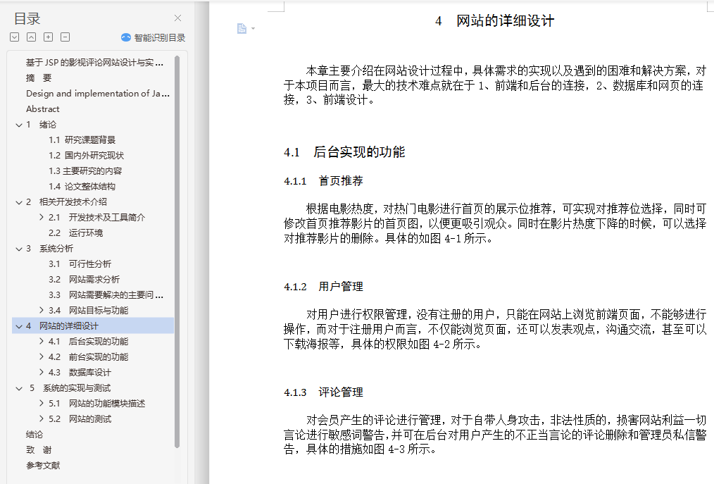 There is no doubt that the emergence of the Internet to traditional television industry to bring the greatest convenience is to facilitate the communication and interaction film practitioners and enthusiasts,and provides browsing for users to build a film critic,film critic reply platform to critics as the carrier to make the user feel critic,film critic interpretation of the Internet in the traditional film industry came into product. Critics in the process of constant development,because of its depth interpretation of the works of film culture,has become the public's favorite entertainment media,at the same time,our platform can also provide the latest information and critic critic poster,users can also your favorite film critic vote. This document describes in detail the process of the nine development system,from needs analysis,code,run to the final test,the preparation of reports. Design report is divided into eight parts,namely introduction,demand analysis,outline design,detailed design,code design,summary,references,acknowledgments and user instructions.