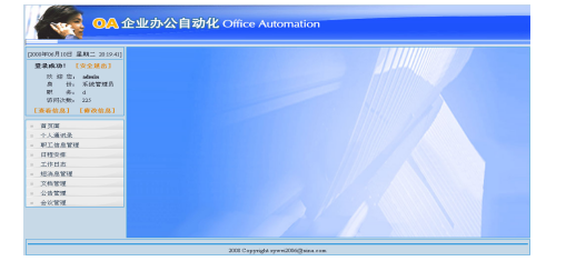 The office automated systems based on auspicious open scientific and technological computer training school internal management and business develop the demand, employ the computer technology, Internet technology, realizes enterprise's office automation, manage the information. This system adopts the systematic development approach that structurize combines with prototype law. The whole system into the overall design and system for users to log in and registered user authentication module for the system administrator to manage the information workers trade union information management module for the current log of users to manage their personal address book contacts module For the current log of users to manage their own agenda of the schedule of modules for current users log in the log of their work to manage the work of the log module for the system among various users send short message information management module for systems management Members of the general meeting of management and information of the user to view the session management module for the system administrator to manage the notice, as well as ordinary users to view the information notice Notice management module and the current log users to upload, download, view documents, such as document management module.