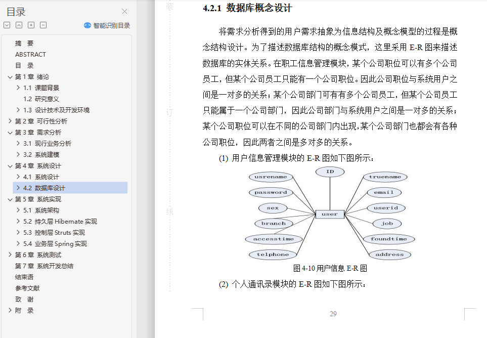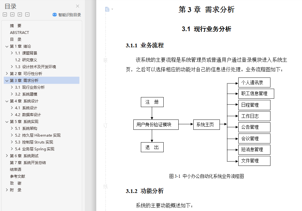 所开发的办公自动化系统,基于公司本身内部管理及业务发展需求,应用计算机技术,Internet技术,实现企业办公自动化,管理信息化。本系统采用结构化与原型法结合的系统开发方法。整个系统分为系统整体设计及用作用户登录和注册的用户身份验证模块,用作系统管理员对职工信息进行管理的职工信息管理模块,用作当前登录用户对自己的通讯录进行管理的个人通讯录模块,用作当前登录用户对自己的日程进行管理的日程安排模块、用作当前登录用户对自己的工作日志进行管理的工作日志模块、用作系统各个用户之间互相发送信息的短消息管理模块、用作系统管理员对会议进行管理以及普通用户查看会议信息的会议管理模块、用作系统管理员对公告进行管理以及普通用户查看公告信息的公告管理模块和当前登录用户上传、下载、查看文件的文件管理模块等。