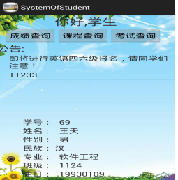基于Android的课程成绩管理系统的设计与实现摘 要近年来,随着移动互联网和电子信息技术的迅猛发展,使用Android技术开发的手机软件越来越多。人们已经从电脑中解放出来,可以采用更简巧的设备--手机,进行娱乐,工作。本文通过对Android应用开发的初步研究,设计出了一款基于Android平台的课程成绩管理系统。在对系统进行详细需求分析的基础上,确定了系统的基本功能要求,对系统的菜单界面、布局、系统数据获取、数据库操作进行了设计,最终实现课程成绩管理系统简单的功能,包括管理员管理界面,教师界面,学生界面。本文介绍了实现课程成绩管理系统的相关理论基础、运行平台和实现技术,重点研究了SQLite数据库的技术特点及数据的存取,提高数据的存取效率,并合理布局系统界面,使界面更加美观和人性化,实现了学籍系统的基本功能,最后,论文对学籍系统的各个模块进行了功能和性能测试。关键词:Android;学籍;系统;SQLiteThe design and implementation of student status management system based on AndroidAbstractIn recent years, with the rapid development of mobile Internet and electronic information technology, the use of Android technology development more and more mobile phone software. Have been liberated from the computer, can use more Jane artful devices, mobile phones, entertainment, work.This article through to the preliminary research on the Android application development, designed a based on Android platform of student status management system. In the system in detail, on the basis of demand analysis, to determine the basic functions of the system requirements, the system menu interface, layout, data acquisition system designing, database operations, and ultimately achieve simple student status management system function, including the administrator management interface, interface of teachers, students interface.This paper introduces the theoretical basis, relative to the implementation of student status management system platform and the implementation technology, focuses on the technical characteristics of SQLite database and data access, improve the efficiency of data access, and reasonable layout of the system interface, make the interface more beautiful and humanization, has realized the basic function of system, finally, the paper on the modules of system function and performance test.Keywords: Android;One's status as a student;system;SQLite目录1.绪论 11.1 引言 11.2 课题背景介绍 11.2.1 教育系统发展现状 11.2.2 手机的应用市场发展现状 21.2.3 Android平台介绍 31.2.4 Android管理学生学籍的意义 51.3 课程成绩管理系统概述 51.3.1 开展该系统的原因 51.4 相关技术介绍 61.4.1 Android的系统框架 61.4.2 Android的特性 71.4.3 Android的开发环境的搭建 81.4.4 Android的数据库 92.系统整体规划 122.1 数据库的设计 122.2 系统流程图 143.系统分析 153.1 系统需求分析 153.1.1 性能需求 153.1.2 功能需求 153.2 系统功能分析 163.3可行性分析 163.3.1操作可行性 163.3.2技术可行性 173.3.3社会可行性 173.4 方案选择 174.系统功能实现 154.1 项目建立 204.2 类的创建 204.3.1 用户登录界面 214.3.2 用户注册界面 224.3.3 学生用户界面 224.3.4 教师用户界面 234.3.5 管理员界面 245.系统详细设计与实现 265.1 系统工程的创建 265.2 界面UI设计 275.2.1 主要界面布局 275.2.2 角色界面布局 286.编码 296.1 登录界面的编码 296.2 角色界面的编码 316.2.1 学生角色界面 316.2.2 教师角色界面 316.2.3 管理员角色界面 327.系统测试 347.1 测试环境介绍 347.2 功能模块测试 347.3 系统性能分析 387.4 小结 38总结 39致谢 40参考文献 41