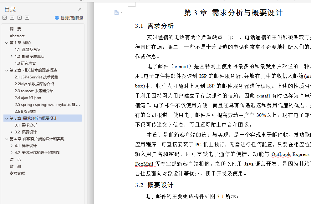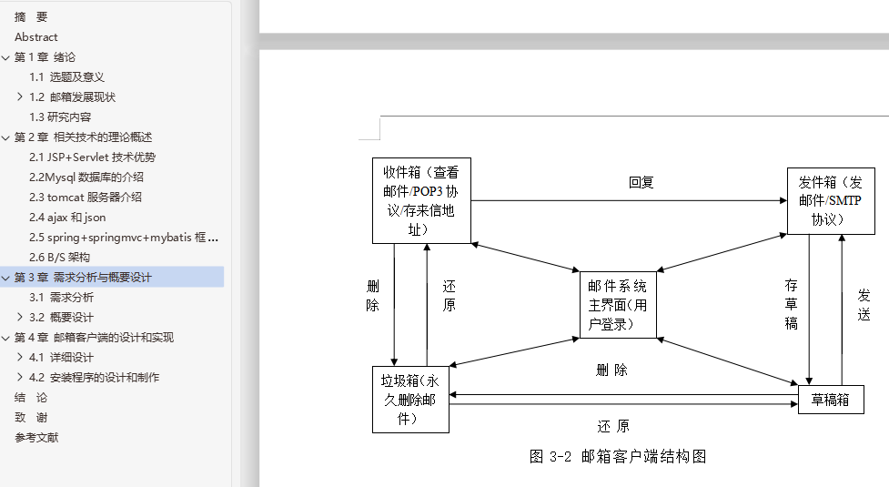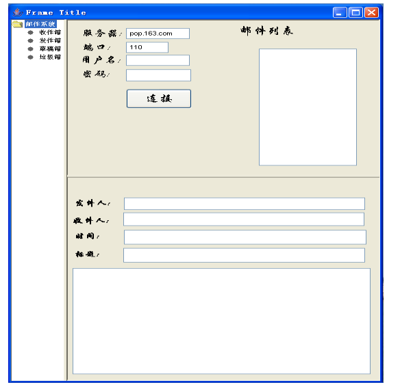 完成项目的需求分析、概要设计、详细设计等前期工作,在此基础上,采用基于Java的程序设计技术完成邮件客户端的主界面设计,包括收件箱、发件箱、草稿箱、垃圾箱以及通讯录功能,采用基于Javamail的程序设计技术完成邮件的发送和收取功能,最终完成毕业设计论文的攥写。