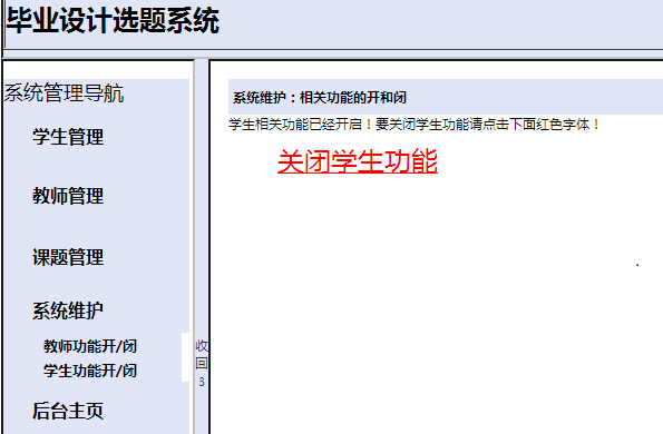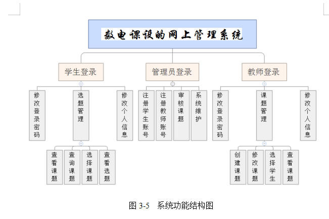 本次项目为数电课设的网上管理系统,可以让学生在此系统中直接选报自己想要的题目,老师也可以通过此系统来发布题目。学生可以操作的功能包括:选择课题、修改选择的课题、退选课题,修改个人信息及其密码;教师可以操作的功能包括:添加课题、修改已有课题、删除课题、修改个人信息及其密码;管理员可以操作的功能包括:添加教师、批量添加教师、添加学生、批量添加学生、管理课题、维护系统。