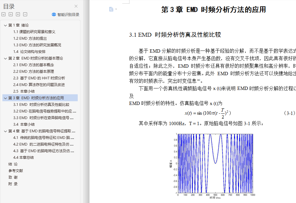 本次毕业设计的主要内容是应用经验模式分解(EMD)及其改进算法对脑电波信号进行分析,EMD是一种用于分析非线性和非平稳性时间序列的自适应数据处理和挖掘算法,该方法通过筛选过程将信号分解为若干本征模态函数IMF,每个IMF分量包含了原始信号在不同尺度上的局部特征。其次,结合机器学习算法,对经由EMD算法处理之后的信号进行分类识别。