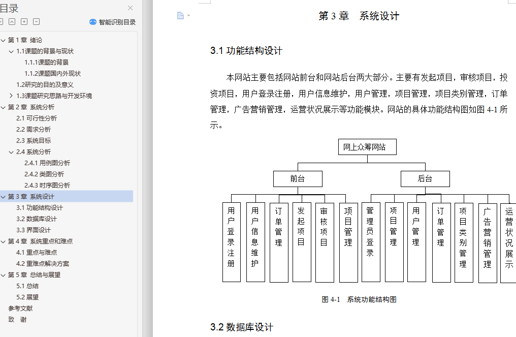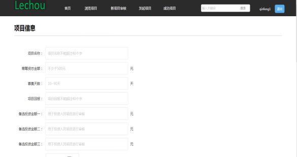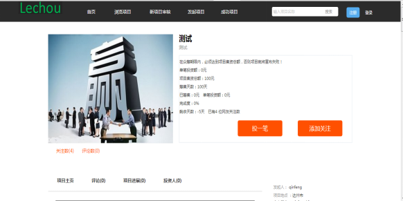 Because the word "crowdfunding" is a new word introduced from abroad in recent years, this paper begins with the background of the emergence of crowdfunding mode, the current research situation at home and abroad and the basic concepts of crowdfunding, so that readers can have a general understanding of the basic concepts of crowdfunding. On this basis, this paper briefly introduces the related technologies and theories involved in this website, and then analyzes the system, including website requirements analysis, feasibility analysis, business process analysis, data flow analysis, and then the design of the system. Including website function design, database design, interface design, and finally the implementation of the system. This site uses myeclipse10 / Adobe As a development tool, Dreamweaver CS3 adopts the popular JSP dynamic web page development technology, and uses the MySQL database system as the backstage database of the website. The basic functions of this website include user registration, login, initiation project, audit project, browse project, investment project, background project management, user management, order management and so on.