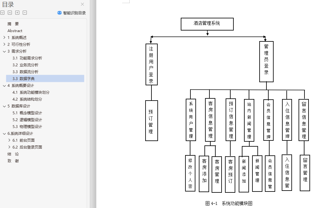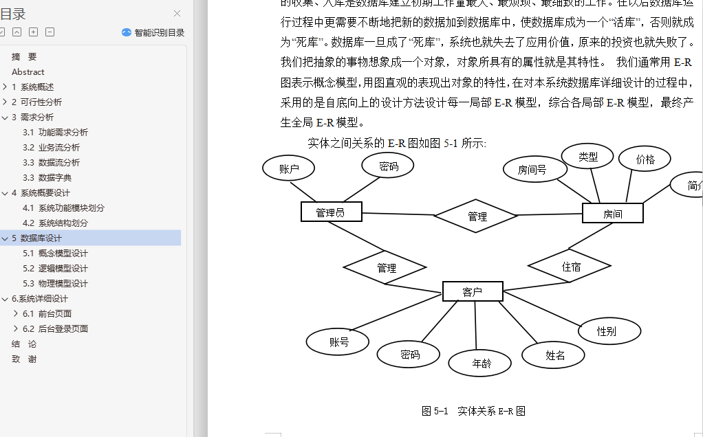系统由前台和后台管理两个部分组成。前台作为与用户直接交互的可视化界面,能将系统的各个功能提供给用户,以帮助用户进行客房管理。后台管理主要由数据库系统作为支持,包括完成对各个数据表单的维护、数据库的备份及恢复等工作。