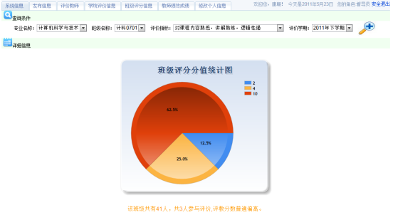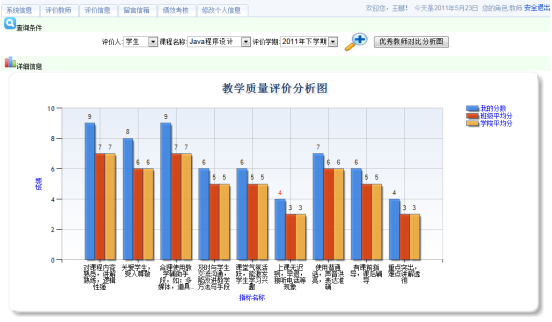 教师教学质量评价信息反馈系统采用ASP.NET开发技术和SQL Server数据库,基于Visual Studio集成开发平台。系统使用经典的三层架构设计方法有效地完成了Web方式下教学质量评价的任务。系统的特色在于对教学评价数据进行了充分有效的利用,通过教师成绩与班级教师或学院教师平均成绩的对比显示,教师不但可以看到自己的评价情况,还可以看到自己教学活动的优势和劣势。学院领导可以多维度的查看教师、课程、班级的评价情况,通过评价数据的对比了解学院教学活动的发展情况。