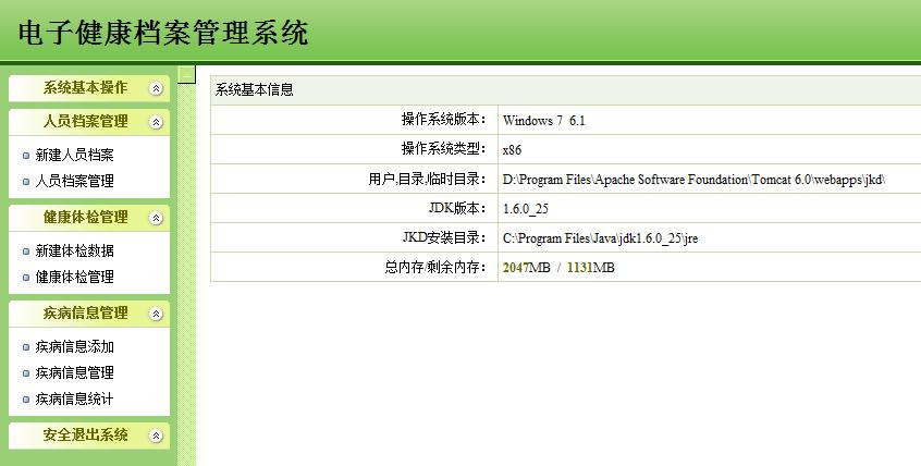 通过基于JAVA的电子健康档案管理系统这个平台,可以实现人员健康情况的信息化、网络化、系统化、规范化管理,从繁杂的数据查询和统计中解脱出来,更好的掌握人员健康状况。系统的主要功能包括:人员档案管理、体检管理与疾病信息管理。