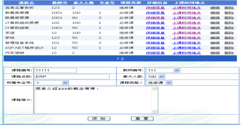 In order to strengthen the standard management of course-choosing, reduce the teaching administer work, simultaneously use the network and the in formalization method well, achieve to student's course-choosing work is prompt and standard, this system is developed for the online course-choosing system based on the B/S pattern. Online chooses the class and the tradition chooses the class way to compare more frugal resources, enhanced the student to choose the class efficiency, increased the student to choose the class right to independence, caused the teaching to be more transparent, simultaneously greatly enhanced the educational course administration supervisory work efficiency.Completed according to programming and design of the on-line management system of B/S mode, and adopted currently more popular development tool ASP.NET 2.0, higher SQL Server of the adoption safety of the backstage database is 2005 databases.The aim is resolve currently to exist in the management according to the C/S mode of some difficulties and problem, make management and maintenance of system more simple and faster, more safe and more dependable.