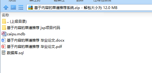 用户的历史行为进行推荐,能够有效解决以上问题。同时还对系统的其他部分进行研究,定义了如何对菜谱进行结构化的设计与存储,如何对推荐的结果进行回测和评价分析,通过搭建网站作为前台显示页面的技术等。研究过程中主要使用 Java 代码来实现推荐算法,食谱的结构化存储使用MySQL 数据库,系统设计开发完成后通过网页的形式来进行展示。使用 jsp 技术编写网页,Tomcat 进行托管,设计模式使用 MVC 架构,用到 DAO 模式来完成与数据库的连接,主要开发工具为 Intellij IDEA。