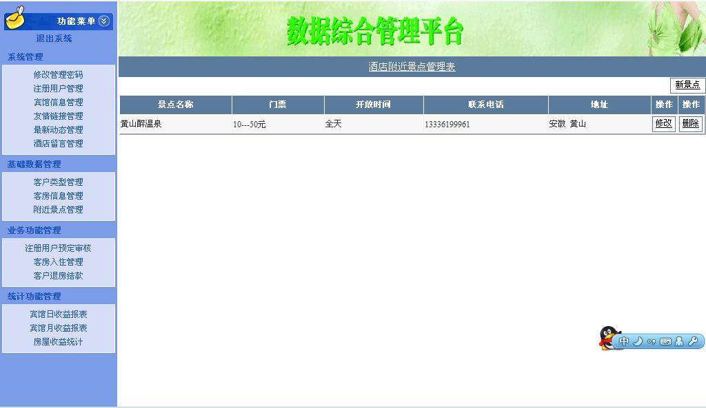 管理客房类型和客房信息,可以添加、修改、删除客房信息。