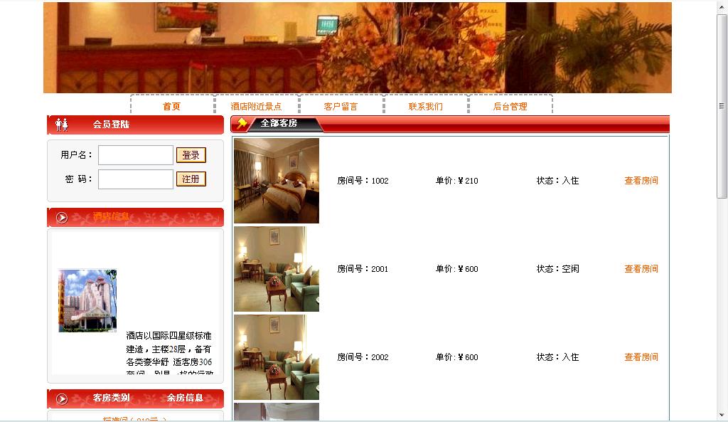 会员通过注册系统,可以查询自己满意的客房信息,进行预定。