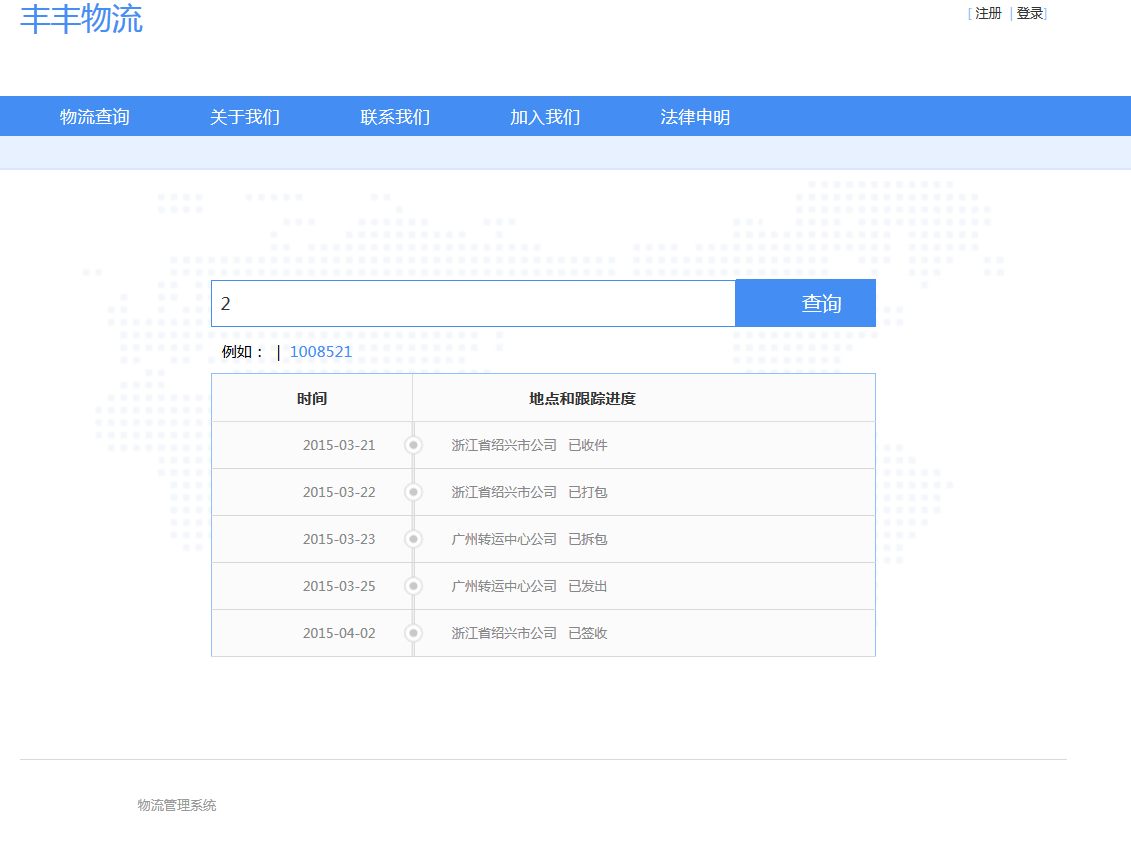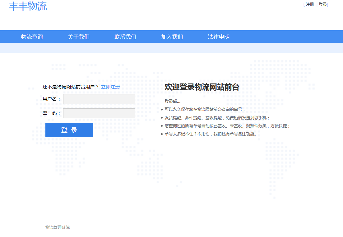 该系统是基于.NET物流管理系统,本系统使用三层结构设计,Web服务技术平台的选择,使用技术的进步,未来,可伸缩,保证系统具有良好的稳定性和伸缩性。根据标准化、分层设计、组件实现了系统设计。使用基于组件的软件开发方法,使结构层面,业务系统,实现分离,分离逻辑和数据;一个统一的服务接口规范为核心,使用开放标准。功能,系统相对完整,系统网络接口和用户交互与用户,企业可以通过数据库管理系统,提供信息和其操作的采访,同时存储数据信息。系统实现信息和数据的浏览、查询、编辑和管理基本的数据库操作,如使用模块化的设计方法,根据用户的需求,易于使用和维护应用程序,在另一个模块的一部分,促进扩大应用和维护,建立程序功能复用的基础。物流信息管理平台,物流行业的基础,实际调查,实际的设计。属于B/S模式下,系统可以访问后端数据库进行数据更新操作通过前台界面和修改数据库。物流信息管理平台分为前后两部分,包括前景和背景两个模块:前台模块:用户注册、登录、物流查询、公司信息视图,后台模块有:用户管理、车辆管理、仓库库存管理、员工信息管理、分销管理、交付路线管理、文章管理。