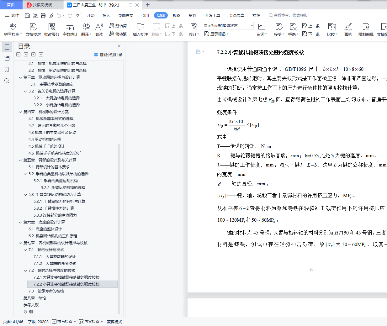 7.2.2小臂旋转轴键联接处键的强度校核………………………………………34