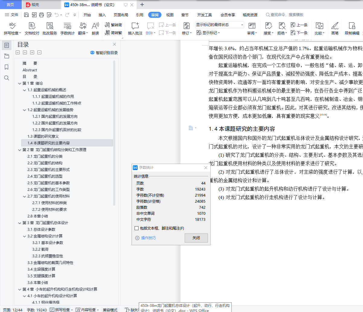 本文首先简要介绍了课题的研究背景和意义,以及龙门起重机的发展趋势与结构分类;然后列出了450t-38m龙门起重机设计的基本的参数,完成450t-38m龙门起重机总体的设计;计算了该龙门起重机受到的静载荷、动载荷、风载荷、偏斜运行时的水平侧向力、碰撞力等等;计算了龙门起重机的轮压,校核了起重机的稳定性、正常工作状态和非正常工作状态的防风抗滑安全性。以及对龙门式起重机的金属结构设计和计算,对龙门式起重机的小车起升机构和行走机构进行了设计与计算,对龙门式起重机的大车行走机构进行了设计与计算。