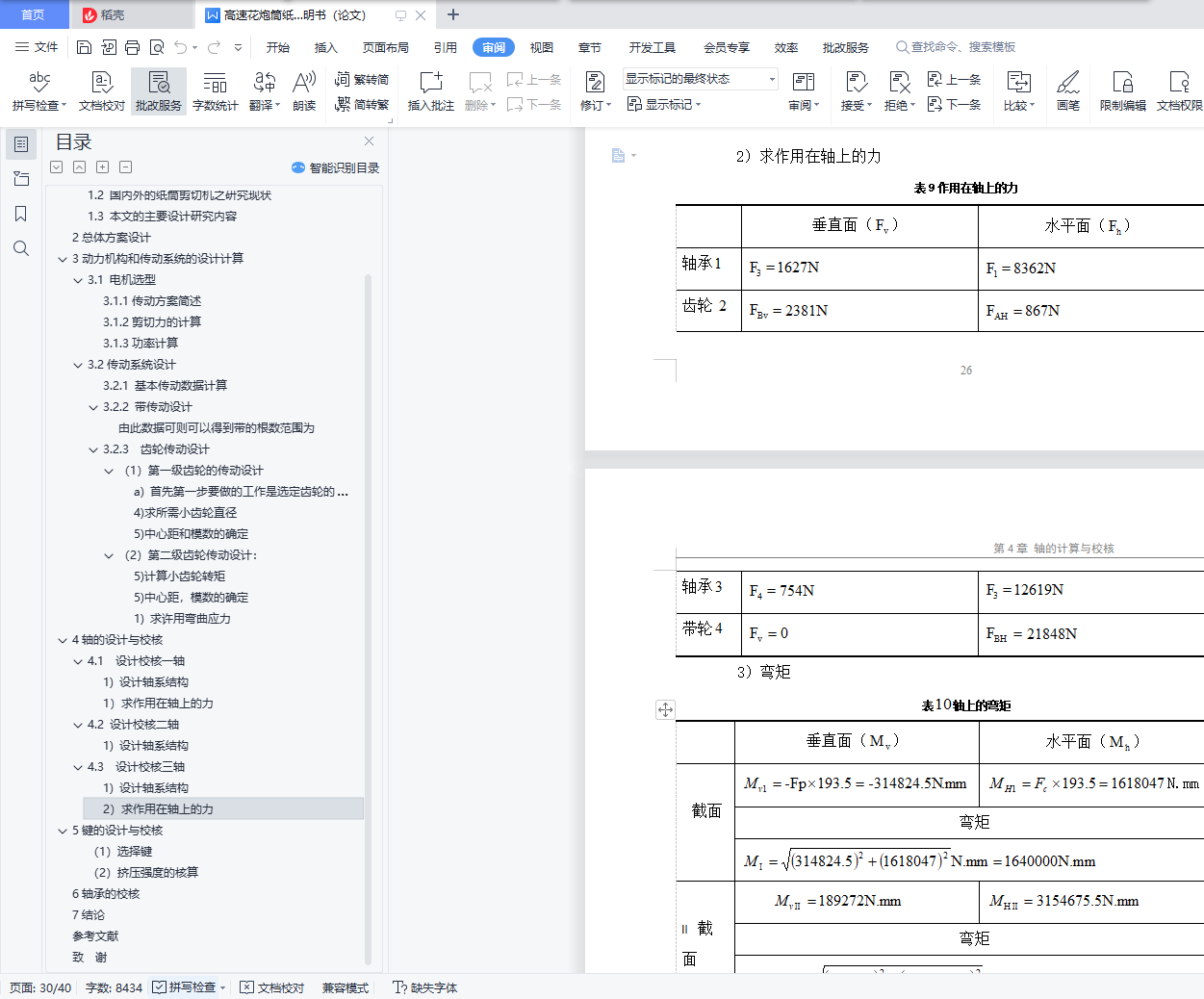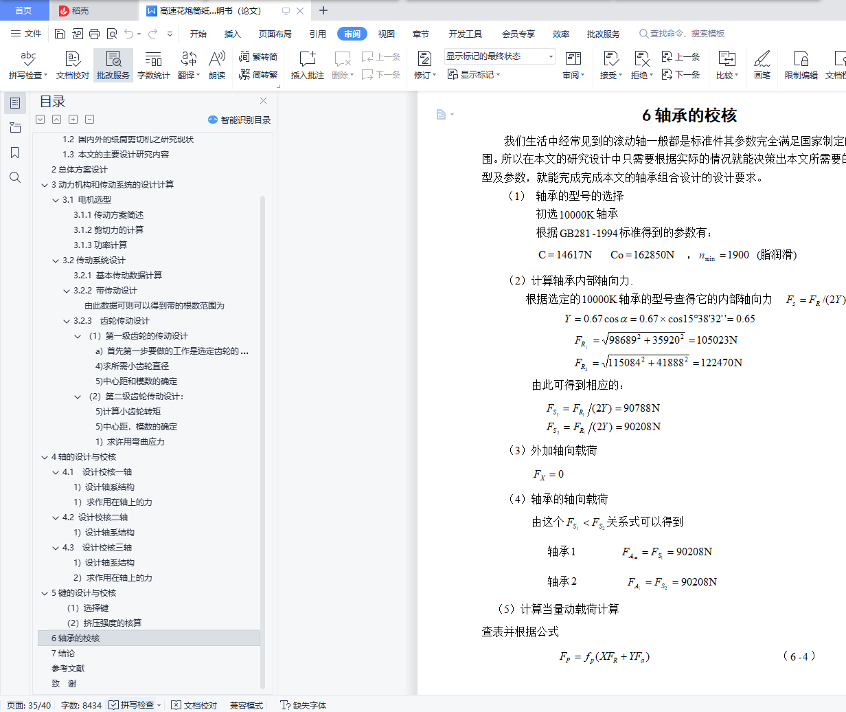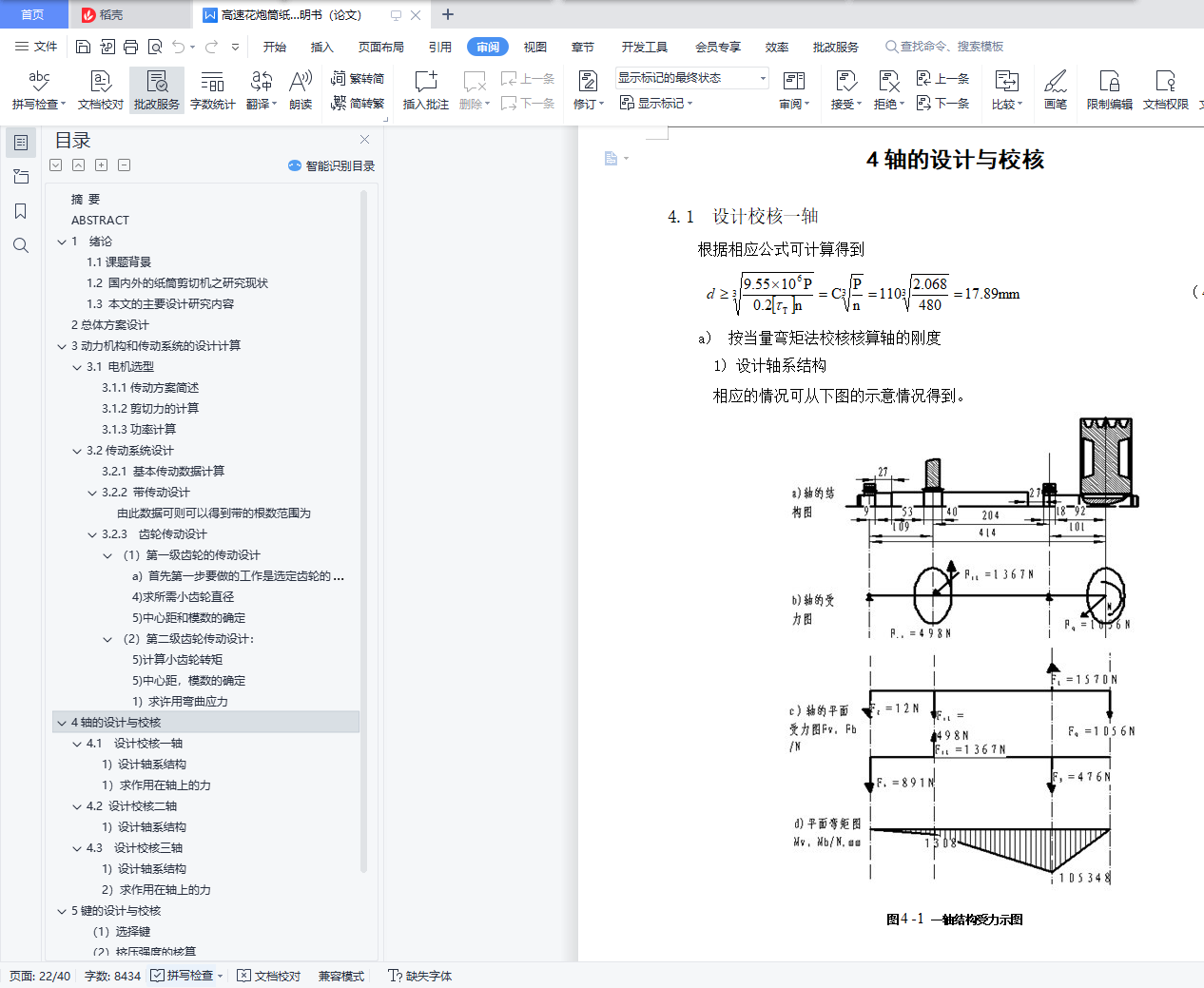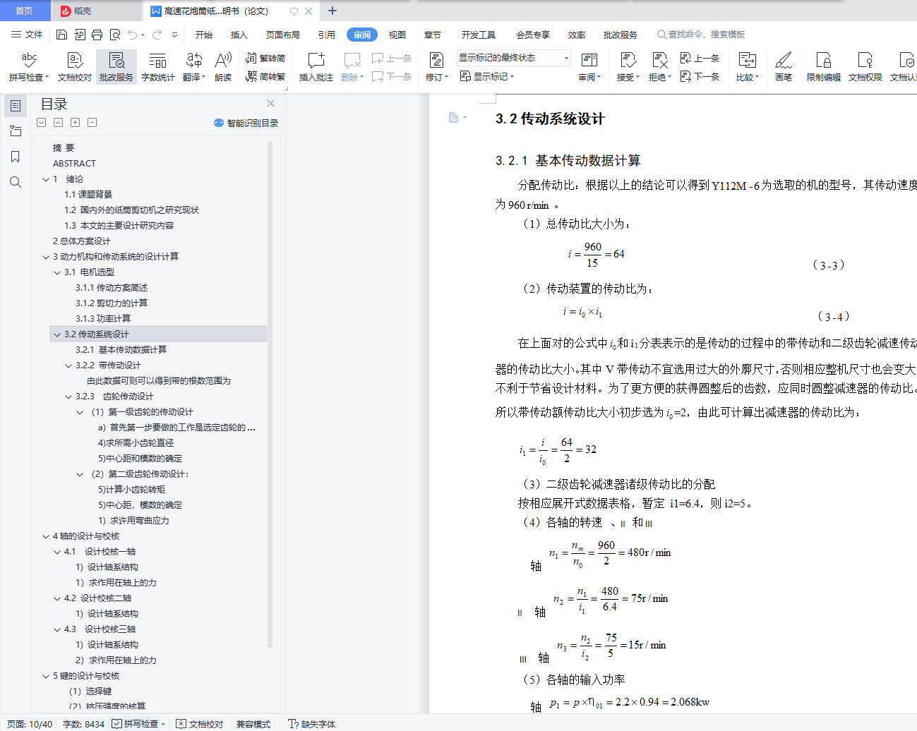 摘 要随着我国商品经济迅速发展日益壮大,工业产品的经济性及环保性受到了人们越来越多的重视。国内已可以生产纸筒剪切设备,但是国内目前设备的自动化水平和生产效率比较低,如果又只是引进国外的纸筒设备的话,又会面临价格昂贵的情况。本设计根据上述实际情况,并结合企业的生产的实际需求,设计出了一种纸筒剪切的自动化设备方案。本设备可用来生产一种用于剪切花炮筒等纸筒的纸筒剪切机,具有较高的自动化水平,也兼具较好的经济性。该方案中的主要创新之处在于,电动机输入动力后,通过一级带减速和二级齿轮减速后提供到执行机构。一级带传动有能够做到缓冲、吸收机构运行中产生的振动,使生产过程平稳的同时又有结构简单的特点;而齿轮传动具有功率覆盖范围大,在工作运行之中的性能可靠,结构紧凑的同时又有着较高的传动效率等优点。通过这样的三级减速传动结构能够达到一种得到较小的动力损失,传动平稳高效的目的。刀具往复运动过程在本设计中,是依靠曲柄滑块机构来实现完成。从而,该执行机构能够将传动系统中原本执行的回转运动,转换成纸筒剪切机所需要的直线运动,达到使纸筒剪切机做往复运动切割纸筒的目的。本纸筒剪切机的设计内容主要包括为:纸筒剪切机的传动机构和执行机构。对传动部件中的电机、带等零件和执行机构涉及的曲轴、连杆、导杆、轴承等零部件进行了选型和结构设计计算以及关键零件的校核。关键词:纸筒剪切,带传动,齿轮传动,轴,切刀ABSTRACTWith the rapid development of China's economy, the economic and environmental protection of industrial products have attracted more and more attention. China has been able to produce paper cutting equipment, but the automation level and production efficiency is relatively low, if import foreign tube equipments,a expensive situation will be faced .According to the actual situation combined with the actual needs of enterprise production, an automation equipment scheme of a tube shear is designed. This equipment can be used in the production of a paper for shearing fireworks barrel cylinder, with a higher level of automation, it also has a better economy. The main innovation the scheme is that the input power of the motor provided to the actuator through a speed reducer and two gear reducer. A belt drive can produce vibration buffering and absorbing mechanism in operation, make the production process smoothly at the same time it has the advantages of simple structure; gear transmission with power coverage, at work the performance is reliable, and has advantages of compact structure and high transmission efficiency. Through the three speed transmission structure can achieve a smaller power loss, smooth transmission and high effect. The tool reciprocates in the design process is rely on the slider crank mechanism to achieve complete and. The agencies will be able to perform, the original implementation of the transmission system of rotary motion into linear motion, paper cutting machine needs to do reciprocating motion, cutting cylinder.The design mainly includes shearing machine cylinder gear and actuator. Motor for driving parts in the crankshaft, belt and other parts and the executive body of the connecting rod, a guide rod, bearings and other components are checked.Key words: Paper Tube cutting;Belt drive;Gear drive;Axis;Cut knife目 录摘 要 IIAbstract III摘 要 IABSTRACT II1 绪论 11.1课题背景 11.2 国内外的纸筒剪切机之研究现状 11.3 本文的主要设计研究内容 22总体方案设计 33动力机构和传动系统的设计计算 43.1 电机选型 43.1.1传动方案简述 43.1.2剪切力的计算 43.1.3功率计算 53.2传动系统设计 63.2.1 基本传动数据计算 63.2.2 带传动设计 73.2.3 齿轮传动设计 9(1)第一级齿轮的传动设计 9(2)第二级齿轮传动设计: 134轴的设计与校核 184.1 设计校核一轴 181) 设计轴系结构 181) 求作用在轴上的力 194.2 设计校核二轴 211) 设计轴系结构 214.3 设计校核三轴 241) 设计轴系结构 242) 求作用在轴上的力 265键的设计与校核 29(1)选择键 29(2)挤压强度的核算 296轴承的校核 31根据相关资料上的数据表格可以明确 327结论 34参考文献 35致 谢 36