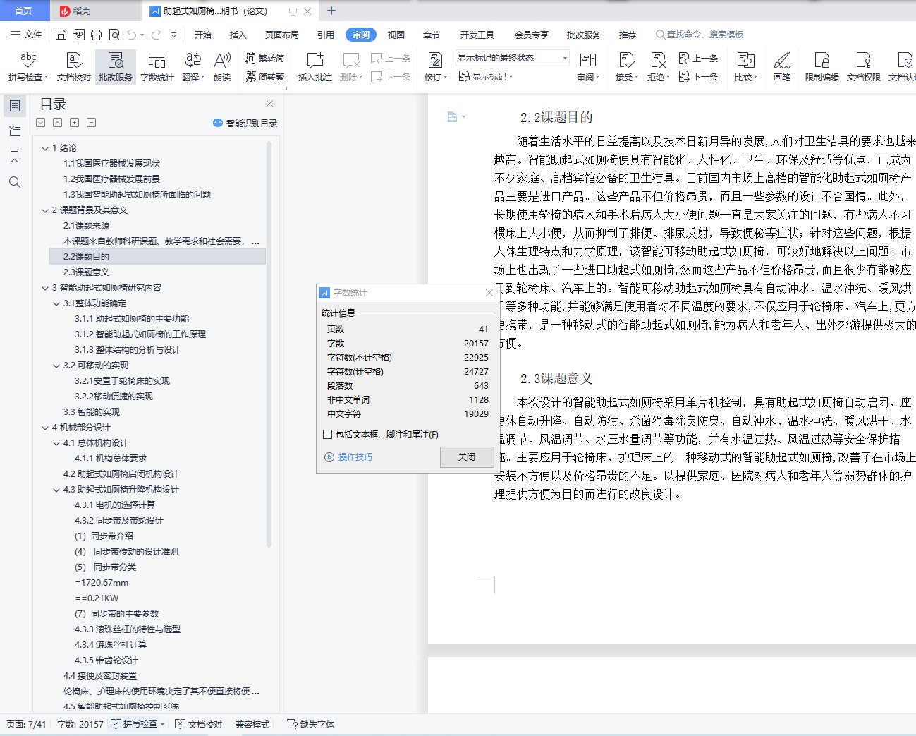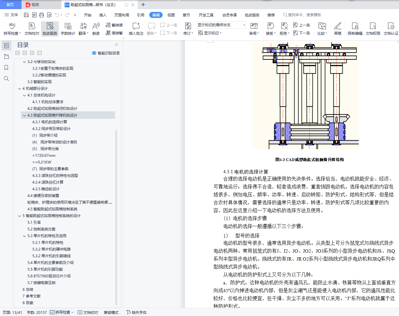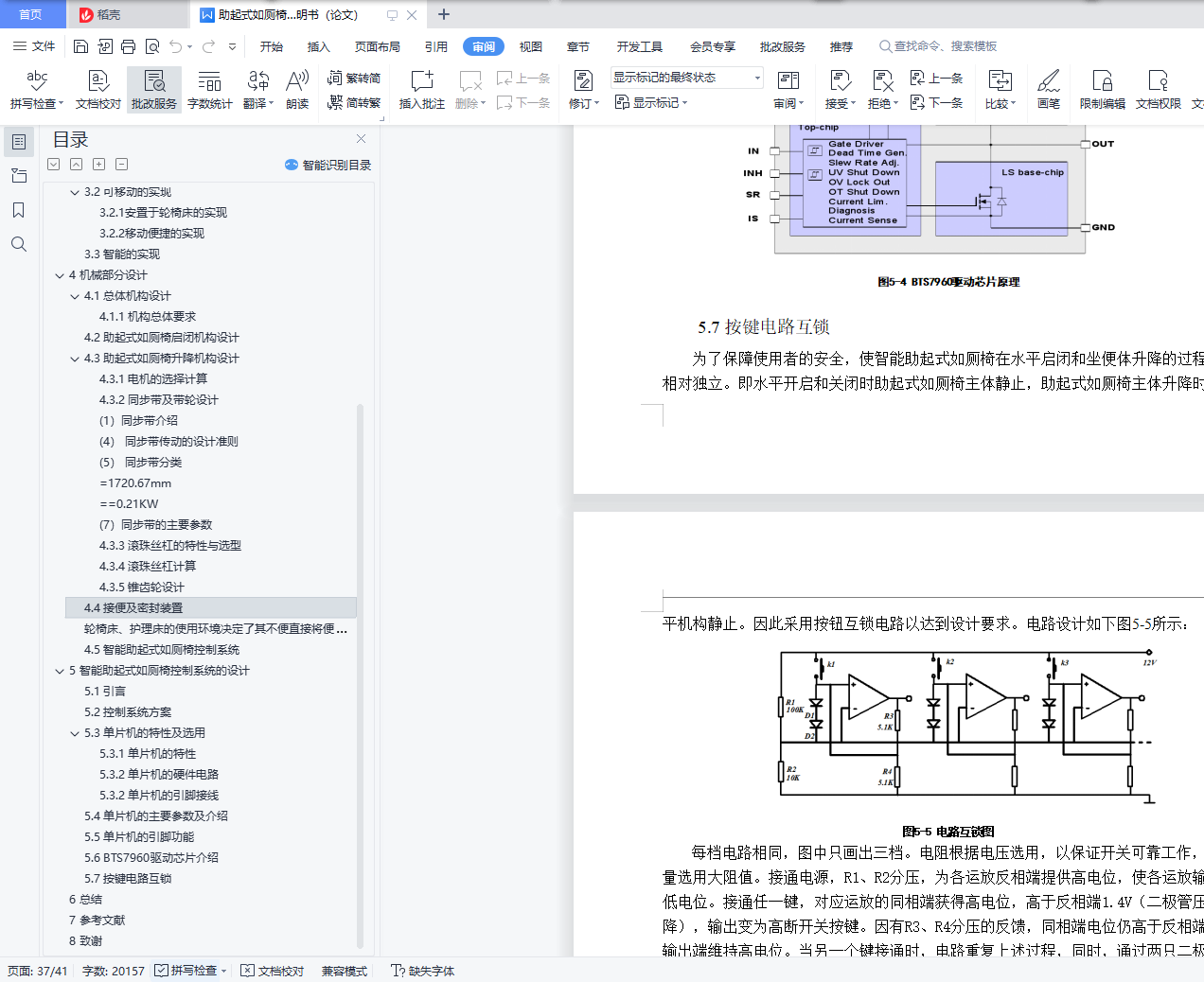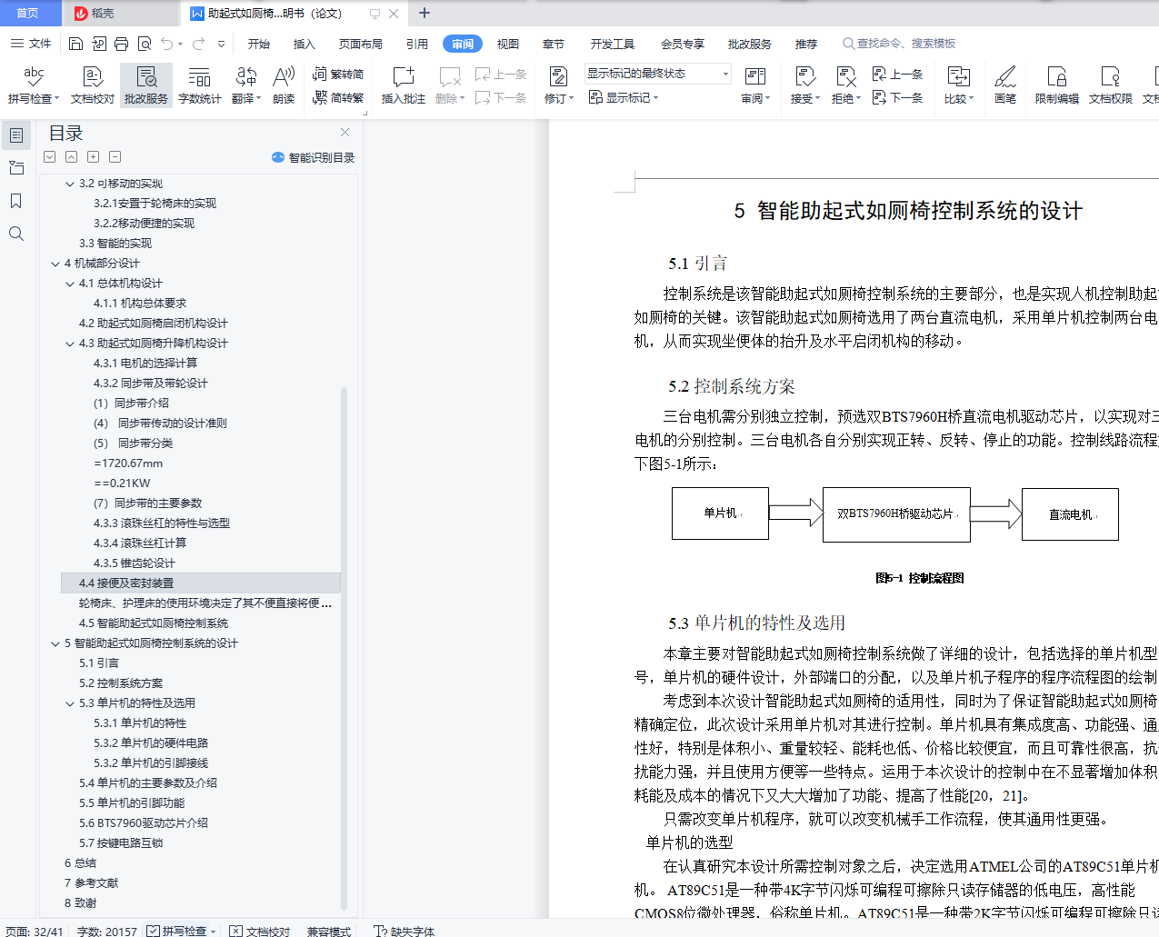 摘 要本次设计的智能助起式如厕椅采用单片机控制,具有助起式如厕椅自动启闭、座便体自动升降、自动防污、杀菌消毒除臭防臭、自动冲水、温水冲洗、暖风烘干、水温调节、风温调节、水压水量调节等功能,并有水温过热、风温过热等安全保护措施。主要应用于轮椅床、护理床上的一种智能助起式如厕椅,改善了在市场上安装不方便以及价格昂贵的不足。以提供家庭、医院对病人和老年人等弱势群体的护理提供方便为目的而进行的改良设计。关键词:如厕辅助;辅助椅;机械设计;结构设计;控制系统AbstractThe design of the intelligent toilet auxiliary chair using microcontroller control, with toilet auxiliary chair automatic closing, automatic lifting, automatic pollution, sterilization, deodorant and odor, automatic flushing, warm water washing, warm air drying, water temperature regulation, wind temperature regulation, water regulation and other functions, and the water temperature, such as wind temperature and overheating safety protection measures.A smart toilet auxiliary chair, mainly used in wheelchair beds and nursing beds, improves the inconvenient installation in the market and expensive deficiencies.Modified design for the purpose of providing convenience for home, hospital care for vulnerable groups such as patients and the elderly.Key words: toilet assistance; auxiliary chair; mechanical design; structural design; control system目录1 绪论 11.1 我国医疗器械发展现状 11.2 我国医疗器械发展前景 11.3 我国智能助起式如厕椅所面临的问题 22 课题背景及其意义 42.1 课题来源 42.2 课题目的 42.3 课题意义 43 智能助起式如厕椅研究内容 53.1 整体功能确定 53.2 可移动的实现 63.3 智能的实现 74 机械部分设计 84.1 总体机构设计 84.2 助起式如厕椅启闭机构设计 84.3 助起式如厕椅升降机构设计 94.4 接便及密封装置 274.5 智能助起式如厕椅控制系统 285 智能助起式如厕椅控制系统的设计 295.1 引言 295.2 控制系统方案 295.3 单片机的特性及选用 295.4 单片机的主要参数及介绍 325.6 BTS7960驱动芯片介绍 345.7 按键电路互锁 346 总结 367 参考文献 378 致谢 38