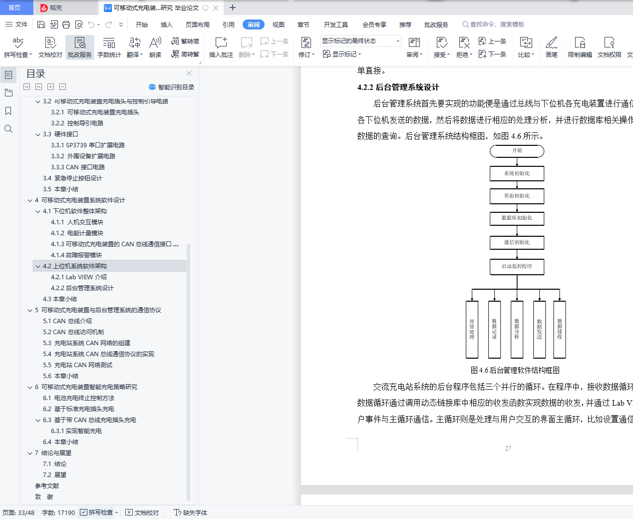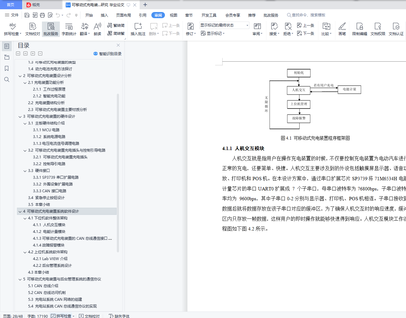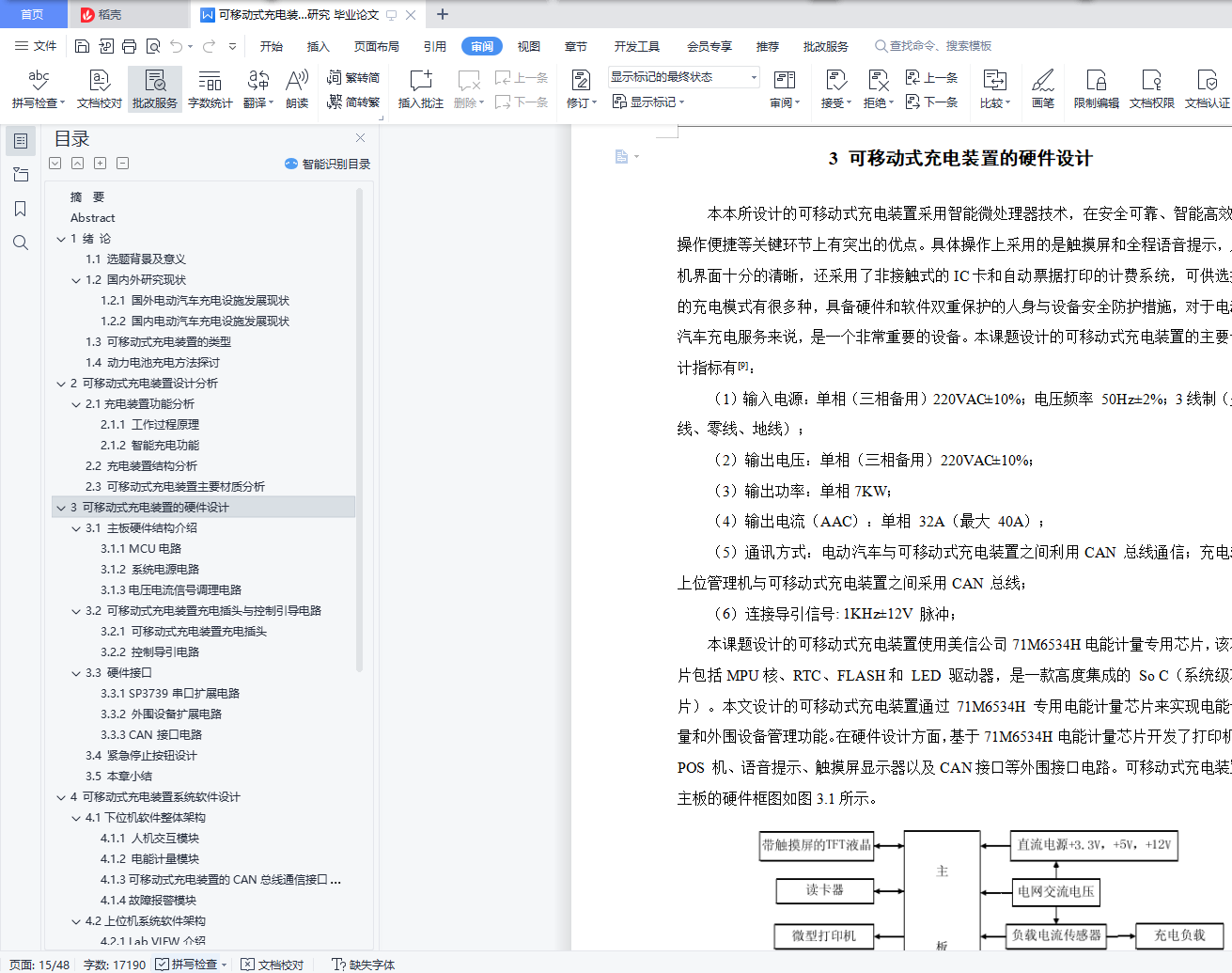 摘 要随着国际化石能源的日益匿乏,能源问题日益严峻,使用更节能环保的产品是一条途径,而纯电动汽车因为其不使用化石能源、污染等优势成为发展的必然趋势,但充电汽车的续肮问题一直困扰着其发展,然而方便快捷的充电桩能够大大缓解续肮的压力。设计该装置不仅仅提供快捷的充电服务,而且也使得建筑停车场充电装桩充分利用,减少车主绕行停车带来的麻烦。这样既方便了车主又大大减少了充电桩闲置的现象,也为电动汽车更快更好发展铺设了前进的道路。本次设计的是一种移动式、功能模块化的交流充电装置以及车载电池管理系统,给出交流充电装置软硬件设计方案,并在结构上实现利用智能操作系统并采用时尚的外观造型对电动汽车充电装置进行人机友好设计,在外形上摆脱了以往呆板、庞大、笨拙等缺点。在硬件设计方面给出主电路结构,包括 MCU 电路、系统电源电路、电压电流信号调理电路、用于与后台管理系统通信的 CAN总线接口电路以及外围人机交互接口电路。其中,人机交互接口电路包括打印机接口、POS 机接口、触摸屏显示器接口、语音提示接口电路。完成装置的机械结构的方案设计和结构设计,要完成该设备的重要的零件图和设计计算说明书。关键词:可移动;移动充电;充电装置;控制系统AbstractWith the international lack of fossil energy, energy problem is increasingly serious, use more energy conservation and environmental protection products is a way, and pure electric vehicles because it does not use fossil energy, pollution advantages become the inevitable trend of development, but the problem has been troubling its development, but convenient and fast charging pile can greatly relieve the pressure of continued dirty.The design of the device not only provides fast charging service, but also makes full use of charging piles in the building parking lot, reducing the trouble caused by car owners' detour parking.This not only facilitates the car owners and greatly reduces the phenomenon of idle charging piles, but also lays the road forward for the faster and better development of electric vehicles.The design is a kind of mobile, functional modular AC charging device and on-board battery management system, the AC charging device software and hardware design, and the structure of intelligent operating system and adopt fashionable appearance modelling of electric vehicle charging device man-machine friendly design, in the shape of the previous rigid, large, clumsy and other shortcomings.In terms of hardware design, the main circuit structure is given, including MCU circuit, system power supply circuit, voltage and current signal conditioning circuit, CAN bus interface circuit for communication with the background management system, and peripheral human-computer interaction interface circuit.Among them, the human-computer interaction interface circuit includes the printer interface, POS interface, touch screen display interface, voice prompt interface circuit.Complete the mechanical structure design and structural design of the device, to complete the important part drawings and design calculation specifications of the equipment.Key words: mobile; mobile charging; charging device; control system目 录摘 要 IAbstract II1 绪 论 11.1 选题背景及意义 11.2 国内外研究现状 11.2.1 国外电动汽车充电设施发展现状 11.2.2 国内电动汽车充电设施发展现状 21.3 可移动式充电装置的类型 31.4 动力电池充电方法探讨 42 可移动式充电装置设计分析 62.1充电装置功能分析 62.1.1 工作过程原理 62.1.2 智能充电功能 62.2 充电装置结构分析 62.3 可移动式充电装置主要材质分析 73 可移动式充电装置的硬件设计 93.1 主板硬件结构介绍 103.1.1 MCU电路 103.1.2 系统电源电路 113.1.3电压电流信号调理电路 133.2 可移动式充电装置充电插头与控制引导电路 143.2.1 可移动式充电装置充电插头 143.2.2 控制导引电路 153.3 硬件接口 163.3.1 SP3739串口扩展电路 163.3.2 外围设备扩展电路 183.3.3 CAN接口电路 193.4 紧急停止按钮设计 203.5 本章小结 204 可移动式充电装置系统软件设计 214.1下位机软件整体架构 214.1.1 人机交互模块 224.1.2 电能计量模块 234.1.3可移动式充电装置的CAN总线通信接口模块 244.1.4故障报警模块 254.2上位机系统软件架构 264.2.1 Lab VIEW介绍 264.2.2后台管理系统设计 274.3本章小结 285 可移动式充电装置与后台管理系统的通信协议 295.1 CAN总线介绍 295.2 CAN总线访问机制 305.3 充电站系统CAN网络的组建 305.4 充电站系统CAN总线通信协议的实现 315.5 充电站CAN网络测试 345.6 本章小结 346 可移动式充电装置智能充电策略研究 356.1 电池充电终止控制方法 356.2 基于标准充电插头充电 366.3 基于带CAN总线充电插头充电 366.3.1实现智能充电 366.4 本章小结 377 结论与展望 387.1 结论 387.2 展望 39参考文献 40致 谢 42
