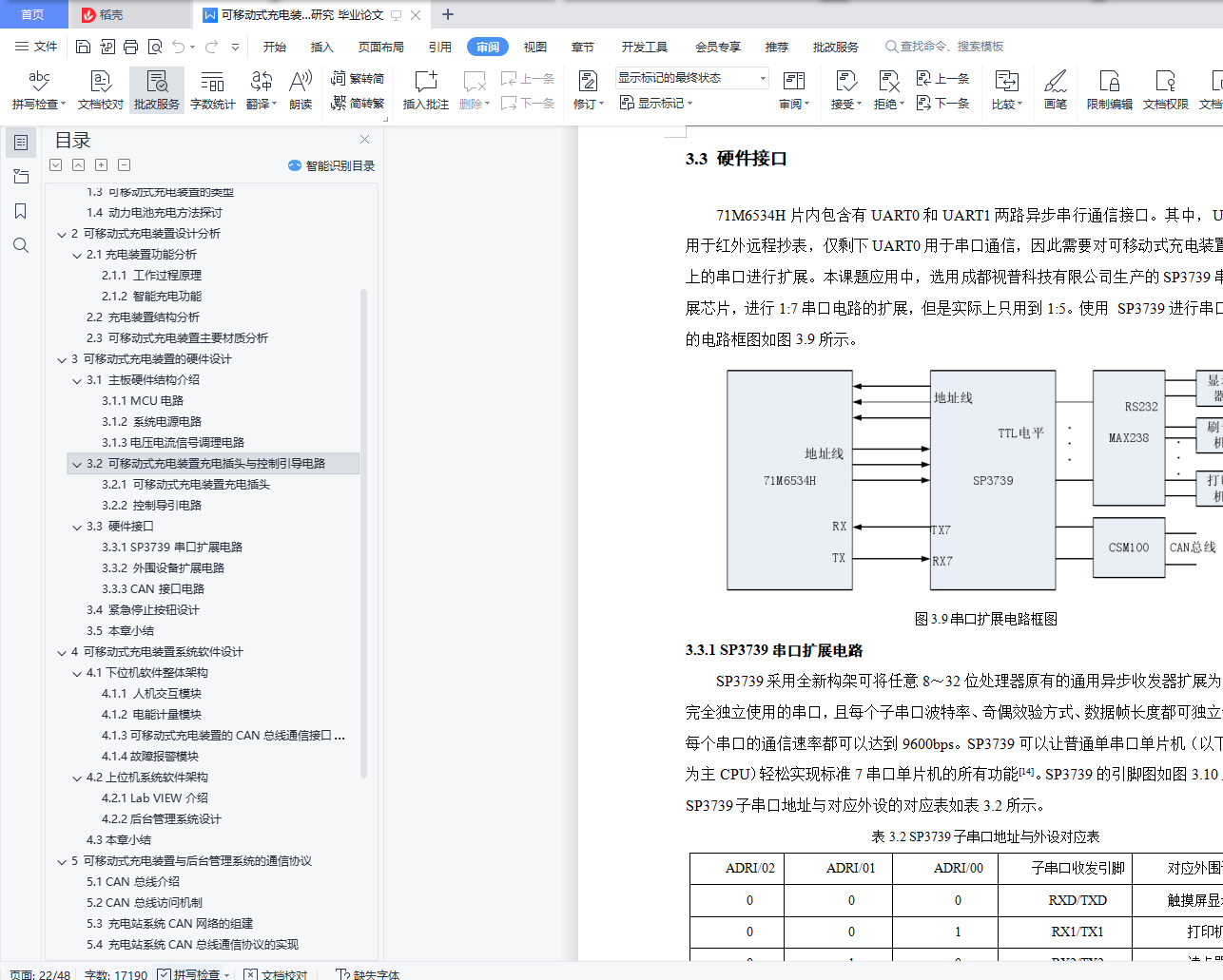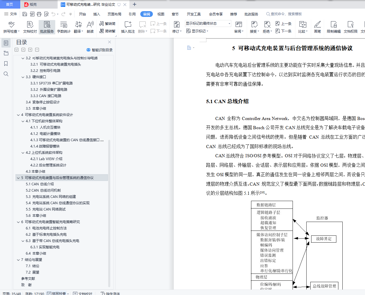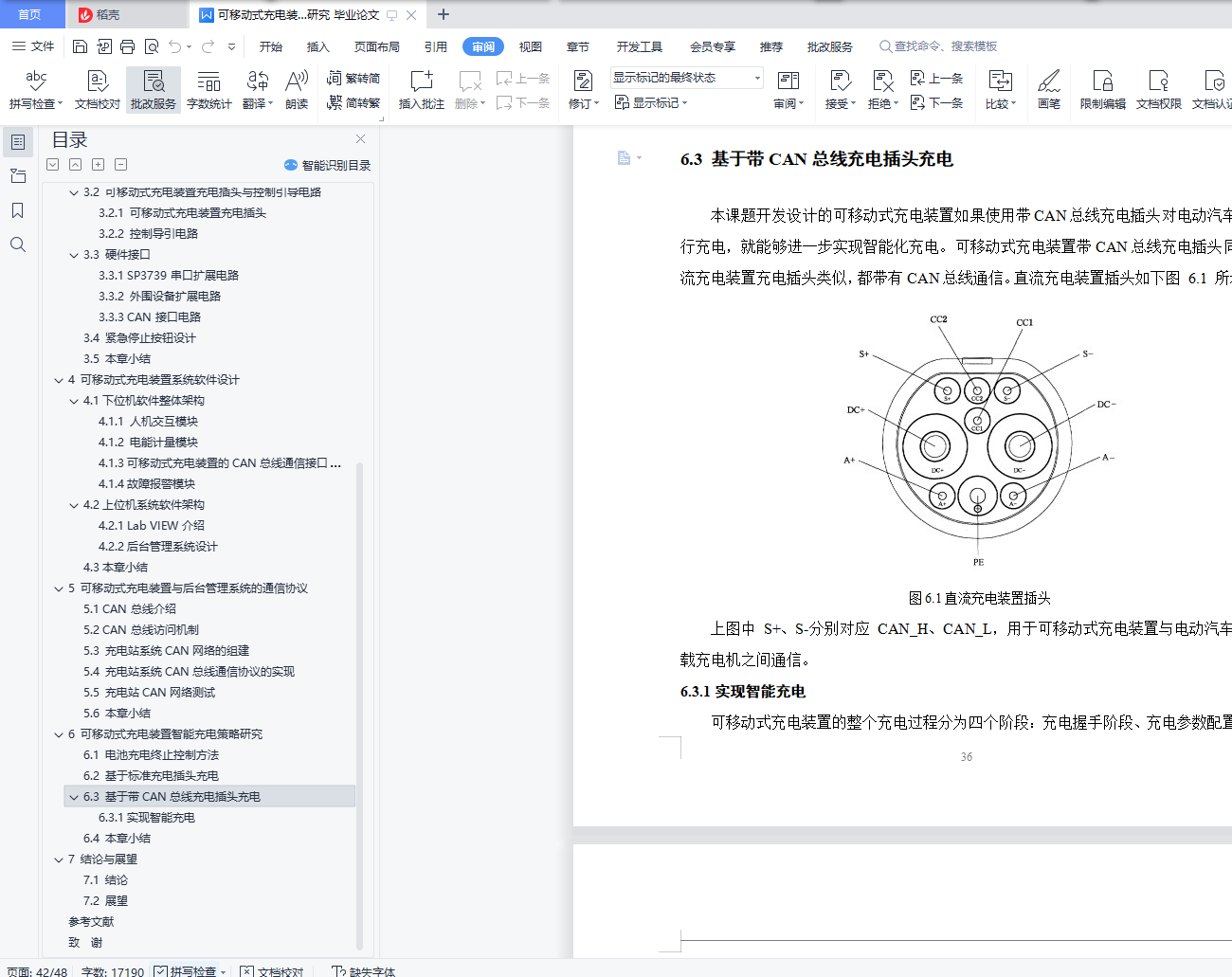 摘 要随着国际化石能源的日益匿乏,能源问题日益严峻,使用更节能环保的产品是一条途径,而纯电动汽车因为其不使用化石能源、污染等优势成为发展的必然趋势,但充电汽车的续肮问题一直困扰着其发展,然而方便快捷的充电桩能够大大缓解续肮的压力。设计该装置不仅仅提供快捷的充电服务,而且也使得建筑停车场充电装桩充分利用,减少车主绕行停车带来的麻烦。这样既方便了车主又大大减少了充电桩闲置的现象,也为电动汽车更快更好发展铺设了前进的道路。本次设计的是一种移动式、功能模块化的交流充电装置以及车载电池管理系统,给出交流充电装置软硬件设计方案,并在结构上实现利用智能操作系统并采用时尚的外观造型对电动汽车充电装置进行人机友好设计,在外形上摆脱了以往呆板、庞大、笨拙等缺点。在硬件设计方面给出主电路结构,包括 MCU 电路、系统电源电路、电压电流信号调理电路、用于与后台管理系统通信的 CAN总线接口电路以及外围人机交互接口电路。其中,人机交互接口电路包括打印机接口、POS 机接口、触摸屏显示器接口、语音提示接口电路。完成装置的机械结构的方案设计和结构设计,要完成该设备的重要的零件图和设计计算说明书。关键词:可移动;移动充电;充电装置;控制系统AbstractWith the international lack of fossil energy, energy problem is increasingly serious, use more energy conservation and environmental protection products is a way, and pure electric vehicles because it does not use fossil energy, pollution advantages become the inevitable trend of development, but the problem has been troubling its development, but convenient and fast charging pile can greatly relieve the pressure of continued dirty.The design of the device not only provides fast charging service, but also makes full use of charging piles in the building parking lot, reducing the trouble caused by car owners' detour parking.This not only facilitates the car owners and greatly reduces the phenomenon of idle charging piles, but also lays the road forward for the faster and better development of electric vehicles.The design is a kind of mobile, functional modular AC charging device and on-board battery management system, the AC charging device software and hardware design, and the structure of intelligent operating system and adopt fashionable appearance modelling of electric vehicle charging device man-machine friendly design, in the shape of the previous rigid, large, clumsy and other shortcomings.In terms of hardware design, the main circuit structure is given, including MCU circuit, system power supply circuit, voltage and current signal conditioning circuit, CAN bus interface circuit for communication with the background management system, and peripheral human-computer interaction interface circuit.Among them, the human-computer interaction interface circuit includes the printer interface, POS interface, touch screen display interface, voice prompt interface circuit.Complete the mechanical structure design and structural design of the device, to complete the important part drawings and design calculation specifications of the equipment.Key words: mobile; mobile charging; charging device; control system目 录摘 要 IAbstract II1 绪 论 11.1 选题背景及意义 11.2 国内外研究现状 11.2.1 国外电动汽车充电设施发展现状 11.2.2 国内电动汽车充电设施发展现状 21.3 可移动式充电装置的类型 31.4 动力电池充电方法探讨 42 可移动式充电装置设计分析 62.1充电装置功能分析 62.1.1 工作过程原理 62.1.2 智能充电功能 62.2 充电装置结构分析 62.3 可移动式充电装置主要材质分析 73 可移动式充电装置的硬件设计 93.1 主板硬件结构介绍 103.1.1 MCU电路 103.1.2 系统电源电路 113.1.3电压电流信号调理电路 133.2 可移动式充电装置充电插头与控制引导电路 143.2.1 可移动式充电装置充电插头 143.2.2 控制导引电路 153.3 硬件接口 163.3.1 SP3739串口扩展电路 163.3.2 外围设备扩展电路 183.3.3 CAN接口电路 193.4 紧急停止按钮设计 203.5 本章小结 204 可移动式充电装置系统软件设计 214.1下位机软件整体架构 214.1.1 人机交互模块 224.1.2 电能计量模块 234.1.3可移动式充电装置的CAN总线通信接口模块 244.1.4故障报警模块 254.2上位机系统软件架构 264.2.1 Lab VIEW介绍 264.2.2后台管理系统设计 274.3本章小结 285 可移动式充电装置与后台管理系统的通信协议 295.1 CAN总线介绍 295.2 CAN总线访问机制 305.3 充电站系统CAN网络的组建 305.4 充电站系统CAN总线通信协议的实现 315.5 充电站CAN网络测试 345.6 本章小结 346 可移动式充电装置智能充电策略研究 356.1 电池充电终止控制方法 356.2 基于标准充电插头充电 366.3 基于带CAN总线充电插头充电 366.3.1实现智能充电 366.4 本章小结 377 结论与展望 387.1 结论 387.2 展望 39参考文献 40致 谢 42