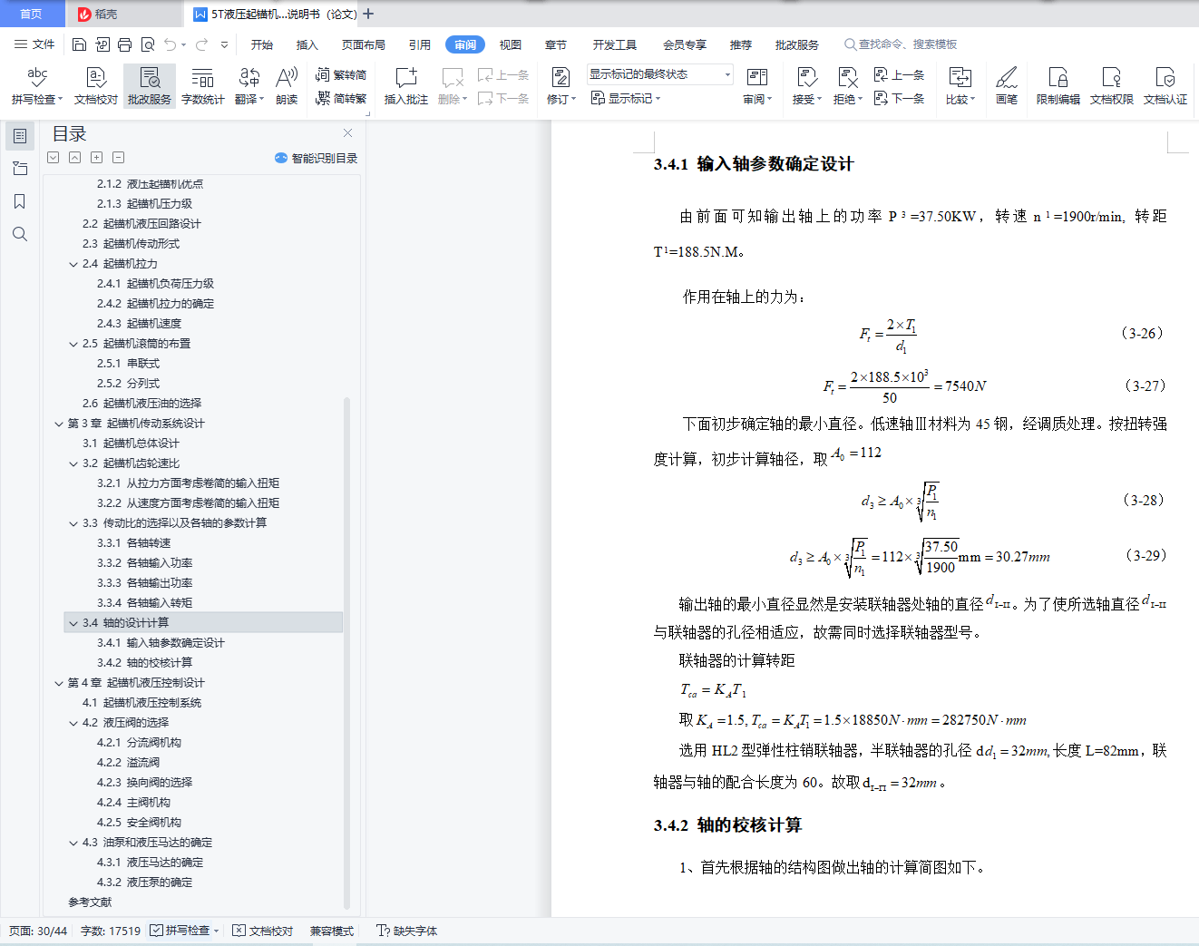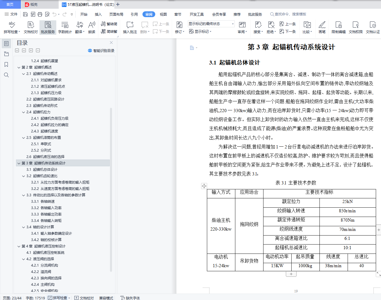 摘 要起锚机是一种船舶机械,主要用于船舶在起网过程中绞收纲索(曳纲和底纲),亦可用于起锚、扬帆和起吊渔货等。起锚机机械结构紧凑简单、布局合理、运转平稳、操作简单轻便、工作安全可靠。对提高起锚作业的效率、减轻劳动强度、节省劳动力等都具有重要作用。随着船舶生产的快速发展,船舶的升级。原有的机械式起锚机已经不能满足现代船舶的需求。它在机械传动中的不稳定性,操作控制上的不方便以及绞纲拉力小和速度慢等缺点也日益暴露出来。由于近年我国基础工业的发展,液压元件的制造技术越来越成熟。在同等功率条件下,液压传动装置比机械传动装置具有体积小,结构紧凑,重量轻,传递功率大,能自动防止过载,可无级变速操作等优点,但是考虑到成本的问题和各方面实际因素,为了能被广大渔民所接受,在本次设计中采取了液压与机械相结合的方法对立式起锚机的动力传输和控制系统进行了改进。本文首先在对起锚机进行简要介绍的基础上,分析了国内外起锚机的发展现状和国内起锚机的主要机型和展望,然后分析了起锚机及其液压系统,分别对传动系统和控制系统进行设计。关键词:起锚机;船舶机械;液压控制;液压系统AbstractAnchor machine is a kind of ship machinery, mainly used in the lifting cable (traction and bottom outline), can also be used to anchor, sail and lifting fishing goods. The anchor crane has a compact and simple mechanical structure, reasonable layout, smooth operation, simple and light operation, safe and reliable work. It plays an important role in improving the efficiency of fishing operations, reducing labor intensity and saving labor force.With the rapid development of ship production, ship upgrades. The original mechanical anchor machine is unable to meet the needs of modern ships. Its instability in the mechanical transmission, inconvenient operation and control, small stranded tension and slow speed and other shortcomings are also increasingly exposed. Due to the development of basic industry in recent years, the manufacturing technology of hydraulic components is becoming more and more mature. Under the same power conditions, the hydraulic transmission has small volume, compact structure, light weight, high transmission power, automatic overload, stepless speed operation, but considering the cost and practical factors, in order to be accepted by the fishermen, in this design combining hydraulic and mechanical method to improve the power transmission and control system of vertical anchor. Based on the brief introduction of the anchor machine, the paper analyzes the development status and its main models and prospect, then analyzes the anchor machine and its hydraulic system and designs the transmission system and control system.Key words: anchor machine; ship machinery; hydraulic control; hydraulic system目 录摘 要 IAbstract II第1章 绪 论 11.1 课题研究背景及目的意义 11.1.1 课题研究目的及意义 11.1.2 起锚机类型和基本参数 11.2 国内外研究现状 31.2.1 国外起锚机发展现状 31.2.2 国内起锚机发展现状 31.2.1 国内起锚机主要机型 41.2.4 起锚机展望 6第2章 起锚机概述 82.1 起锚机传动概述 82.1.1 对起锚机要求 82.1.2 液压起锚机优点 82.1.3 起锚机压力级 92.2 起锚机液压回路设计 102.3 起锚机传动形式 122.4 起锚机拉力 152.4.1 起锚机负荷压力级 152.4.2 起锚机拉力的确定 162.4.3 起锚机速度 172.5 起锚机滚筒的布置 172.5.1 串联式 172.5.2 分列式 172.6 起锚机液压油的选择 17第3章 起锚机传动系统设计 193.1 起锚机总体设计 193.2 起锚机齿轮速比 213.2.1 从拉力方面考虑卷简的输入扭矩 213.2.2 从速度方面考虑卷简的输入扭矩 223.3 传动比的选择以及各轴的参数计算 233.3.1 各轴转速 233.3.2 各轴输入功率 243.3.3 各轴输出功率 243.3.4 各轴输入转矩 243.4 轴的设计计算 253.4.1 输入轴参数确定设计 263.4.2 轴的校核计算 26第4章 起锚机液压控制设计 294.1 起锚机液压控制系统 294.2 液压阀的选择 304.2.1 分流阀机构 304.2.2 溢流阀 314.2.3 换向阀的选择 314.2.4 主阀机构 334.2.5 安全阀机构 334.3 油泵和液压马达的确定 344.3.1 液压马达的确定 344.3.2 液压泵的确定 35参考文献 39