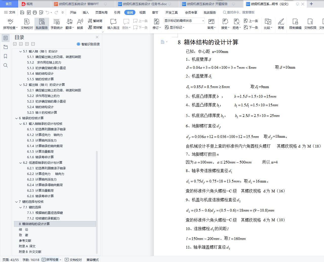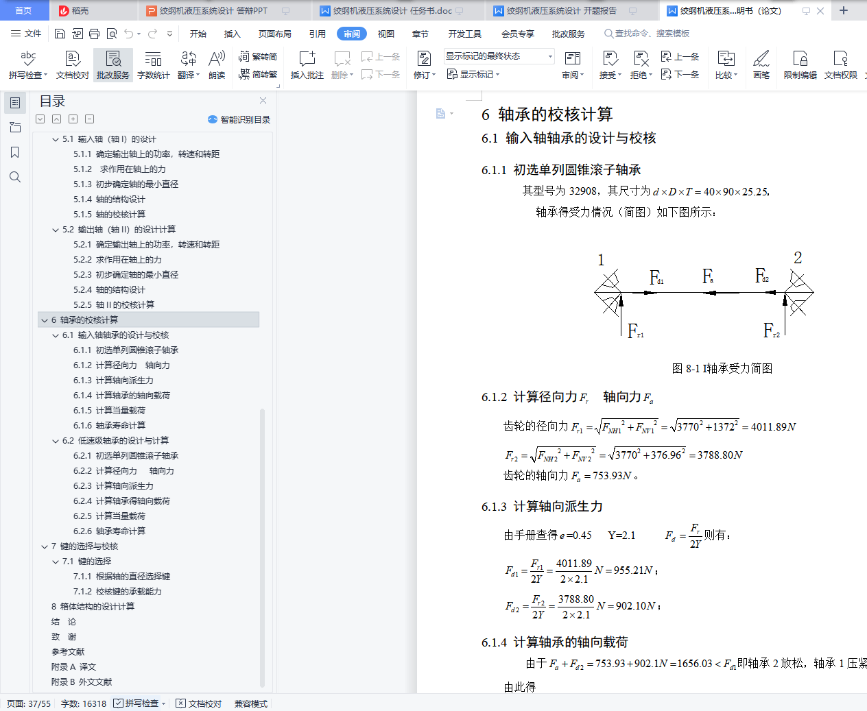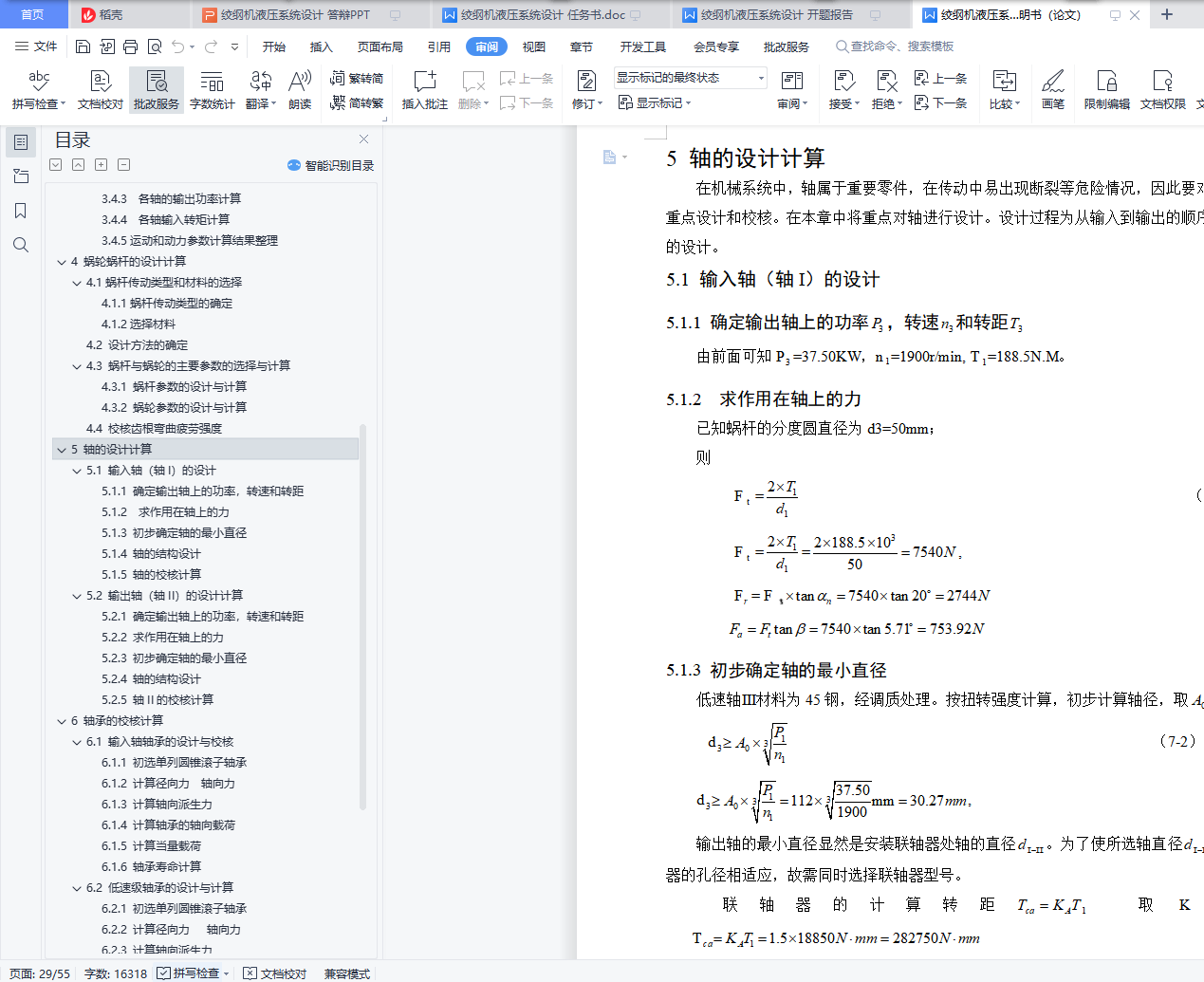 摘 要船用绞纲机是沿海渔船使用最广泛的起网绞纲设备。至今已经有50来年的历史。与卧式相比,它的来向不受限制,结构简单,操作方便,船上机舱人员都可以自己维修;又因为价格适中,使用寿命长等特点,所以深受广大渔民的欢迎。随着渔业生产的快速发展,渔船的升级。原有的机械式绞纲机已经不能满足现代渔船的需求。它在机械传动中的不稳定性,操作控制上的不方便以及绞纲拉力小和速度慢等缺点也日益暴露出来。由于近年我国基础工业的发展,液压元件的制造技术越来越成熟。在同等功率条件下,液压传动装置比机械传动装置具有体积小,结构紧凑,重量轻,传递功率大,能自动防止过载,可无级变速操作等优点,但是考虑到成本的问题和各方面实际因素,为了能被广大渔民所接受,在本次设计中采取了液压与机械相结合的方法对船用绞纲机的动力传输和控制系统进行了改进。首先用液压控制来代替传统的机械控制。然后对绞纲机的减速系统进行了设计和计算。最后对绞纲机进行三维建模,并对整个装置做一个运动仿真。本次设计涉及面很广,系统地对我大学四年所学的知识进行了检验。相信通过这次毕业设计将更好地帮助我对整个专业知识的复习。关键词:蜗轮蜗杆; 液压绞纲机;模拟仿真AbstractVertical winch is the most widely used winching equipment when fishing along the coast in Zhejiang Province. Since the 50's onwards,it is developed by Zhejiang Marine Fisheries Research Institute and Zhoushan shipyard.It is used 50 years. Compared with the horizontal,it is not restricted in the direction,and the structure is simple,the operation is easy, the ship crews can repair the winches by themselves;in addition, because the price is moderate,and it has long time to be used,so it is welcomed by the majority of fishermen.With the rapid development of fishing production, the fishing boats upgrade. The original winch can not content the need of modern fishing boat any more. The disadvantage about instability of mechanical transmission,inconvenience of operation control, small tension and slow speeding is increasingly exposed. In recent years, with the development of basic industries, manufacturing of hydraulic components is more mature.Under the same power conditions, compared with the mechanical transmission, hydraulic transmission has a series of advantages like the volume is small, the structure is compact, weight is light, transmission power is bigger, and it can automatically prevent overload,and it also have the variable speed operation,but taking into account coast issues and the practical factors in all kinds of aspects,in order to be accepted by the majority of fisherman, in this design, combining the hydraulic and mechanical method to improve the power transmission and control system of vertical winch.First,hydraulic control replace the traditional mechanical transmission.Then designing and calculating the winch’deceleration system. Finally, making the three-dimensional modeling machine, and make a motion simulation to the entire unit .The design involves a wide range, I test the knowledge learned tested in four years of the college,I believe that this design help me review the overall professional knowledge better.Keywords : hydraulic transmission;hydraulic turbine control system;hydraulic steel cutter machine;simulation目 录摘 要 IAbstract II1 绪论 11.1选题背景及意义 11.2研究现状 11.3研究主要内容及章节安排 22 液压控制系统的设计 32.1压力级的选择 32.2 液压回路的设计 42.2.1 回路设计方案一 42.2.2 回路设计方案二 53 传动机构的设计 83.1传动方案的确定 83.2油泵和液压马达的选择 83.2.1 液压马达的选择 83.2.2 液压泵的选择 103.3 液压阀的选择 133.3.1溢流阀的选择 133.3.2 换向阀的选择 133.4 传动比的选择以及各轴的参数计算 133.4.1 计算各轴转速 143.4.2 各轴的输入功率 143.4.3 各轴的输出功率计算 143.4.4 各轴输入转矩计算 143.4.5运动和动力参数计算结果整理 154 蜗轮蜗杆的设计计算 164.1蜗杆传动类型和材料的选择 164.1.1蜗杆传动类型的确定 164.1.2选择材料 164.2 设计方法的确定 164.3 蜗杆与蜗轮的主要参数的选择与计算 184.3.1 蜗杆参数的设计与计算 184.3.2 蜗轮参数的设计与计算 184.4 校核齿根弯曲疲劳强度 195 轴的设计计算 215.1 输入轴(轴I)的设计 215.1.1 确定输出轴上的功率,转速和转距 215.1.2 求作用在轴上的力 215.1.3 初步确定轴的最小直径 215.1.4 轴的结构设计 225.1.5 轴的校核计算 235.2 输出轴(轴II)的设计计算 255.2.1 确定输出轴上的功率,转速和转距 255.2.2 求作用在轴上的力 255.2.3 初步确定轴的最小直径 255.2.4 轴的结构设计 255.2.5 轴II的校核计算 276 轴承的校核计算 296.1 输入轴轴承的设计与校核 296.1.1 初选单列圆锥滚子轴承 296.1.2 计算径向力 轴向力 296.1.3 计算轴向派生力 296.1.4 计算轴承的轴向载荷 296.1.5 计算当量载荷 306.1.6 轴承寿命计算 306.2 低速级轴承的设计与计算 316.2.1 初选单列圆锥滚子轴承 316.2.2 计算径向力 轴向力 316.2.3 计算轴向派生力 316.2.4 计算轴承得轴向载荷 316.2.5 计算当量载荷 326.2.6 轴承寿命计算 327 键的选择与校核 337.1 键的选择 337.1.1 根据轴的直径选择键 337.1.2 校核键的承载能力 348 箱体结构的设计计算 35结 论 37致 谢 38参考文献 39附录A 译文 41附录B 外文文献 45