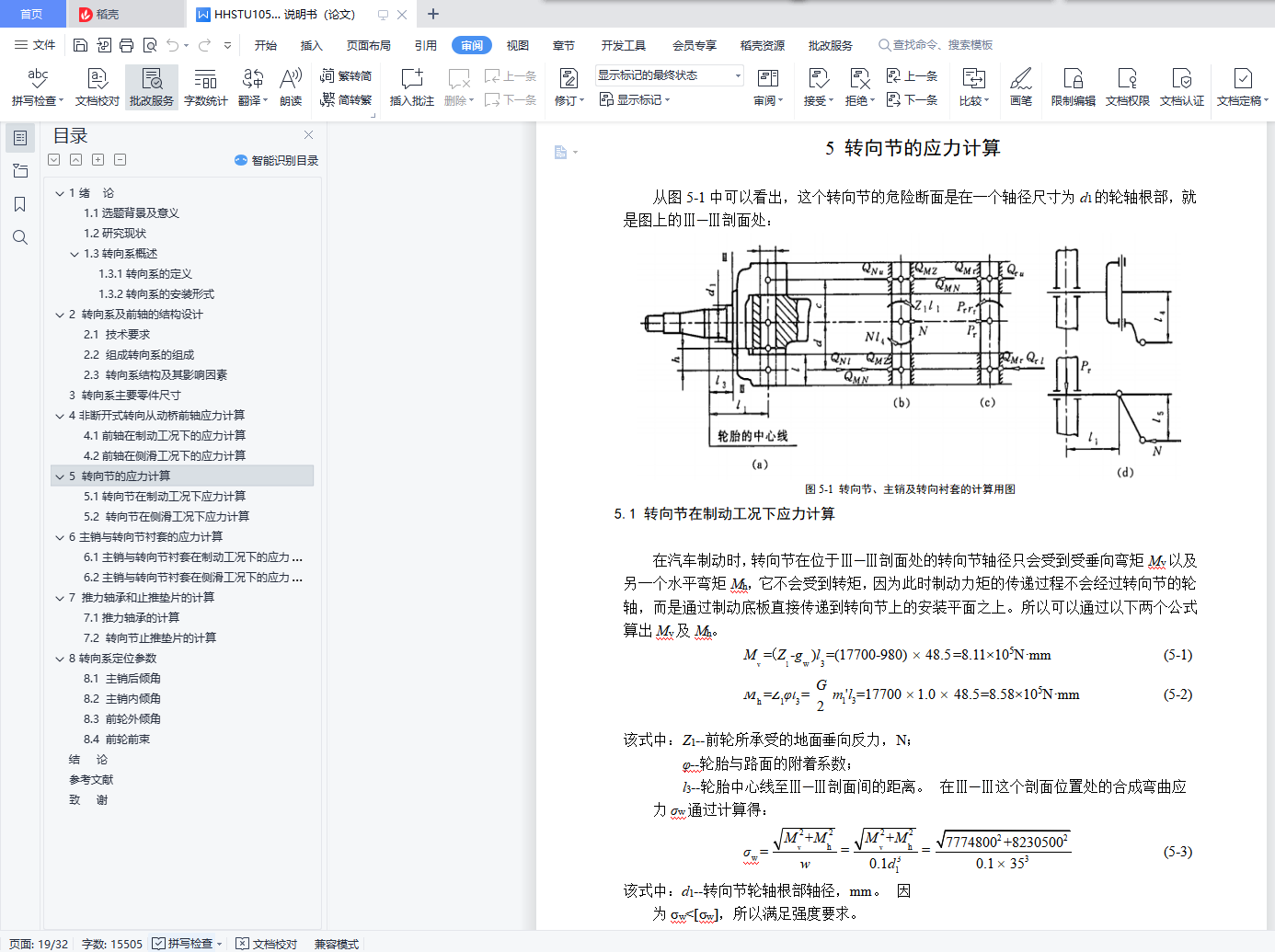 HHSTU1050型货车转向系及前轴设计摘 要在货车产业的发展上,对转向系的研究一直都是重点。此次设计是对HHSTU1050型货车转向系及前轴设计,其中包含对转向系进行合理计算,并进行结构设计。 在设计之前,首先要查阅相关资料,了解转向系的结构,熟悉设计转向系的方法。在此之后,进行转向系的设计。此次设计的过程会介绍转向系的定义、结构、工作原理以及可能会影响转向系的因素等。在设计时还会对转向系各主要零件的尺寸和结构进行确定, 并会对其在各种工况下的应力进行应力计算,这些零件主要是前轴、转向节、主销、主销 上下轴承(即转向节衬套)、转向节推力轴承和止推垫片等。除此之外,还要确定转向系 的定位参数。在设计之后,除了要使转向系的结构能够比较紧凑,使它的重量更轻,还要 使货车在转向时较为轻松,在制造转向系时比较容易。这次设计对HHSTU1050型货车转向系及前轴设计的计算以及其结构布局,对其他货车转向 桥的设计提供设计方法和思路。关键词:货车转向系;转向系前轴;转向节;应力计算;定位参数Type HHSTU1050 type truck steering system and front axle designAbstractIn the development of the automobile industry, the research of the steering system has always been the focus.This design is the design of the HHSTU1050-type truck steering system and the front axle, which includes the reasonable calculation of the steering system, and the structural design.Before the design, the first thing to consult the relevant information, understand the structure of the steering system, familiar with the design of the steering system method.After this, the design of the steering system is conducted.The design process will introduce the definition, structure, working principle of the steering system and the factors that may affect the steering system.In the design, the size and structure of the main parts of the steering system will be determined, and the stress calculation under various working conditions are mainly the front shaft, steering knuckle, main pin, main pin upper and lower bearings (i. e., steering joint bush), steering joint thrust bearing, thrust gasket, etc.In addition, but also to determine the positioning parameters of the steering system.After the design, in addition to making the structure of the steering system more compact and making it lighter, it also makes the car easier to turn and manufacture the steering system.This design provides design methods and ideas for the calculation and structural layout of the design of HHSTU1050 truck steering system and front axle, and the design of other trucks steering bridge.Key words: truck steering; steering front axle; knuckkle; stress calculation; positioning parameters目 录1 绪 论 31.1 选题背景及意义 31.2 研究现状 41.3 转向系概述 41.3.1 转向系的定义 41.3.2 转向系的安装形式 42 转向系及前轴的结构设计 62.1 技术要求 62.2 组成转向系的组成 72.3 转向系结构及其影响因素 93 转向系主要零件尺寸 124 非断开式转向从动桥前轴应力计算 144.1 前轴在制动工况下的应力计算 144.2 前轴在侧滑工况下的应力计算 155 转向节的应力计算 175.1 转向节在制动工况下应力计算 175.2 转向节在侧滑工况下应力计算 186 主销与转向节衬套的应力计算 196.1 主销与转向节衬套在制动工况下的应力计算 196.2 主销与转向节衬套在侧滑工况下的应力计算 207 推力轴承和止推垫片的计算 227.1 推力轴承的计算 227.2 转向节止推垫片的计算 228 转向系定位参数 248.1 主销后倾角 248.2 主销内倾角 268.3 前轮外倾角 278.4 前轮前束 27结 论 28参考文献 29致 谢 30