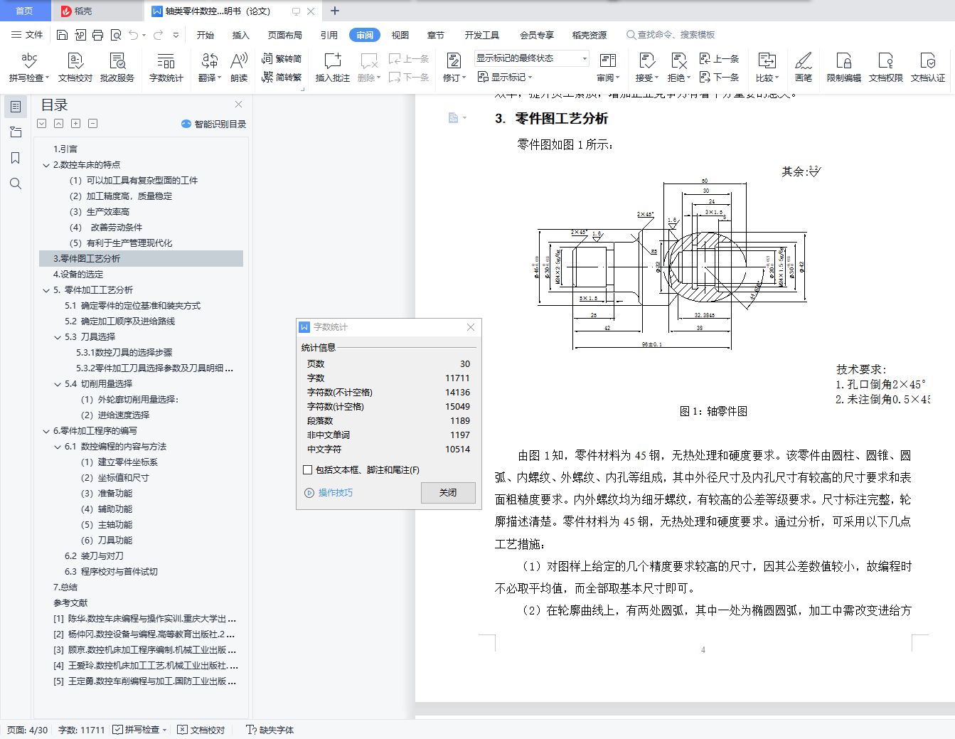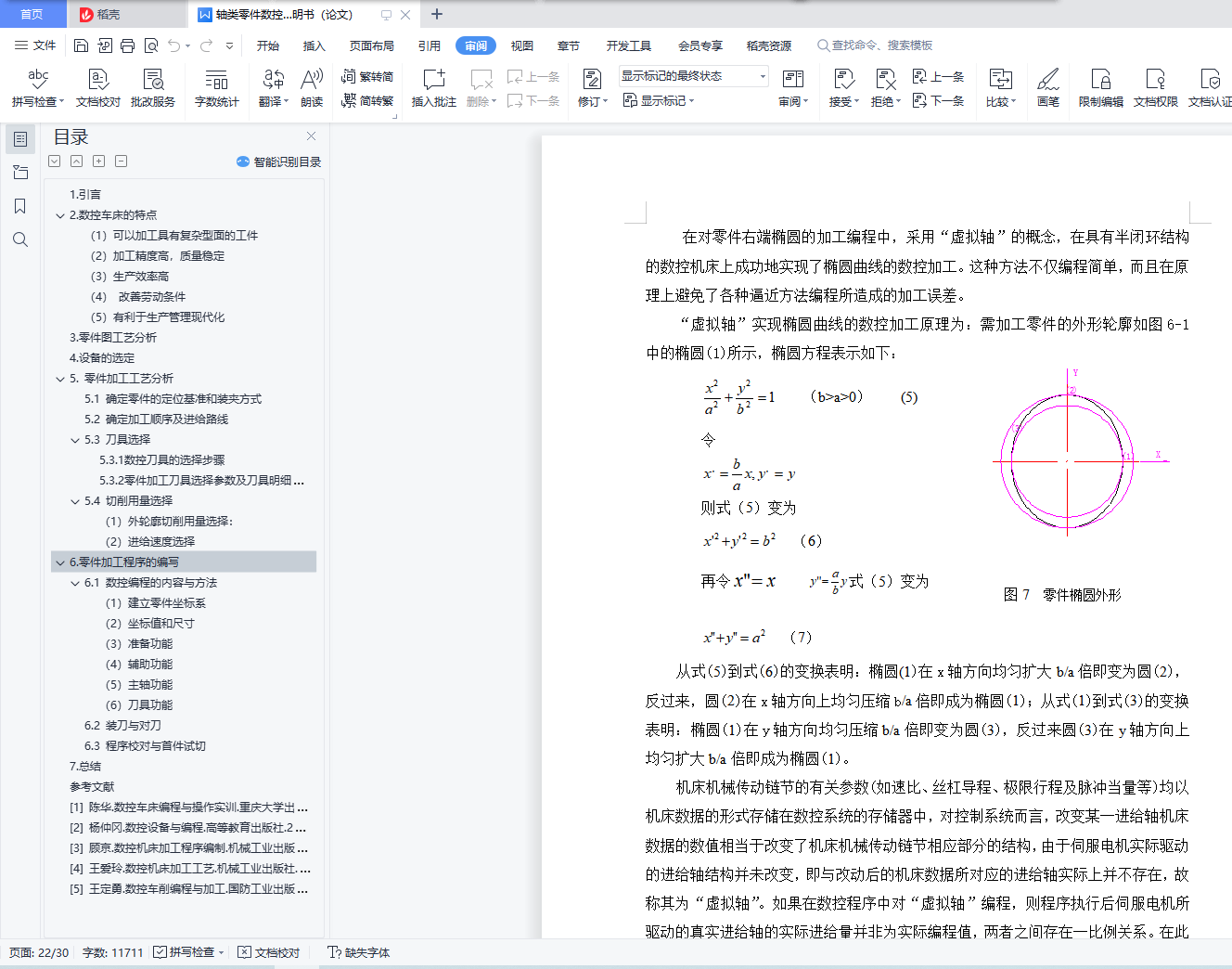 摘 要数控加工是现代制造技术的基础,这一发明对于制造行业而言,具有划时代的意义和深远的影响。本文通过以北京凯恩帝数控系统为基础,充分利用计算机辅助设计/制造(CAD/CAM)的优势,对零件形状、尺寸、精度等级、表面粗糙度、材料和热处理等技术要求的分析。针对上述对零件的分析,选择加工方案确定加工顺序、加工路线、装夹方式、刀具及切削用量参数等,进行数控加工工艺的编制;通过确立坐标系计算零件粗、精加工各运动轨迹,得到刀位数据及轨迹图,进行数控加工的程序编写。关键词: 数控加工 数控加工工艺 程序编写目录1. 引言 12. 数控车床的特点 2(1) 可以加工具有复杂型面的工件 2(2) 加工精度高,质量稳定 2(3) 生产效率高 2(4) 改善劳动条件 2(5) 有利于生产管理现代化 23. 零件图工艺分析 34. 设备的选定 45. 零件加工工艺分析 65.1 确定零件的定位基准和装夹方式 65.2 确定加工顺序及进给路线 75.3 刀具选择 135.3.1 数控刀具的选择步骤 135.3.2 零件加工刀具选择参数及刀具明细表 165.4 切削用量选择 18(1)外轮廓切削用量选择: 18(2) 进给速度选择 186. 零件加工程序的编写 206.1 数控编程的内容与方法 20(1)建立零件坐标系 20(2) 坐标值和尺寸 20(3)准备功能 21(4)辅助功能 23(5)主轴功能 23(6)刀具功能 236.2 装刀与对刀 276.3 程序校对与首件试切 287.总结 28参考文献 29[1] 陈华.数控车床编程与操作实训.重庆大学出版社.2006年 29[2] 杨仲冈.数控设备与编程.高等教育出版社.2004年 29[3] 顾京.数控机床加工程序编制.机械工业出版社.2006年 29[4] 王爱玲.数控机床加工工艺.机械工业出版社.2006年 29[5] 王定勇.数控车削编程与加工.国防工业出版社.2008年 291.引言高度发达的制造业和先进的制造技术已经成为当前衡量一个国家综合经济实力和科技水平的重要标志之一,成为一个国家在竞争激烈的国际市场上获胜的关键因素。随着我国从制造业大国走向制造业强国的步伐的加快,掌握以数控技术为主的先进制造技术,提高计算机辅助设计与制造(CAD/CAM)的技术水平成为一个制造企业持续进步,赖以生存的重要支撑。