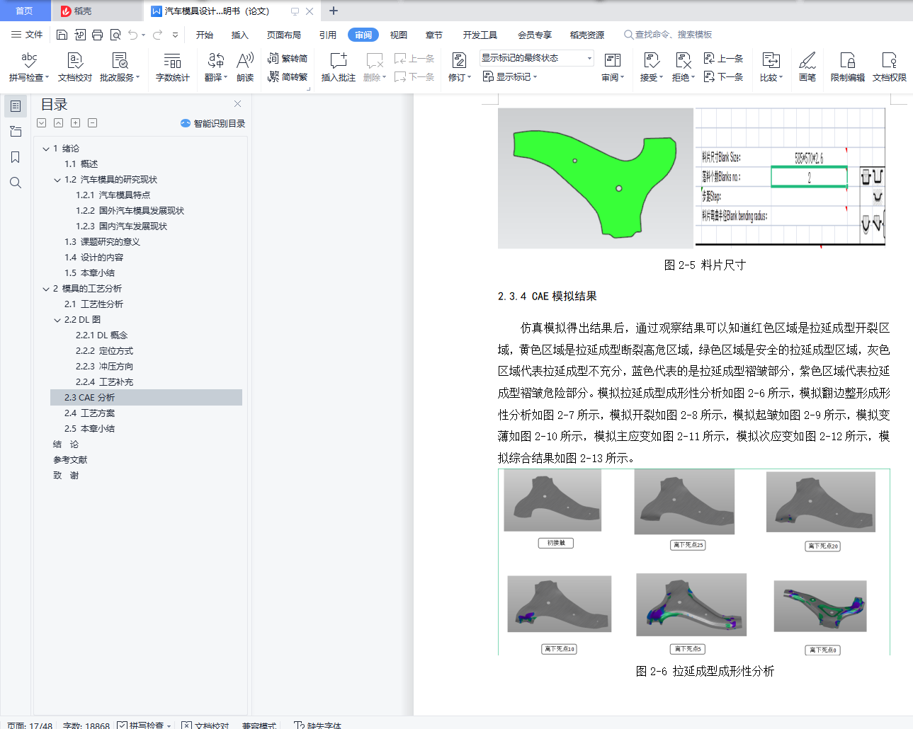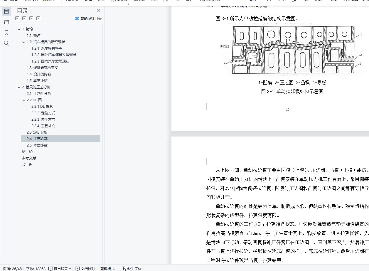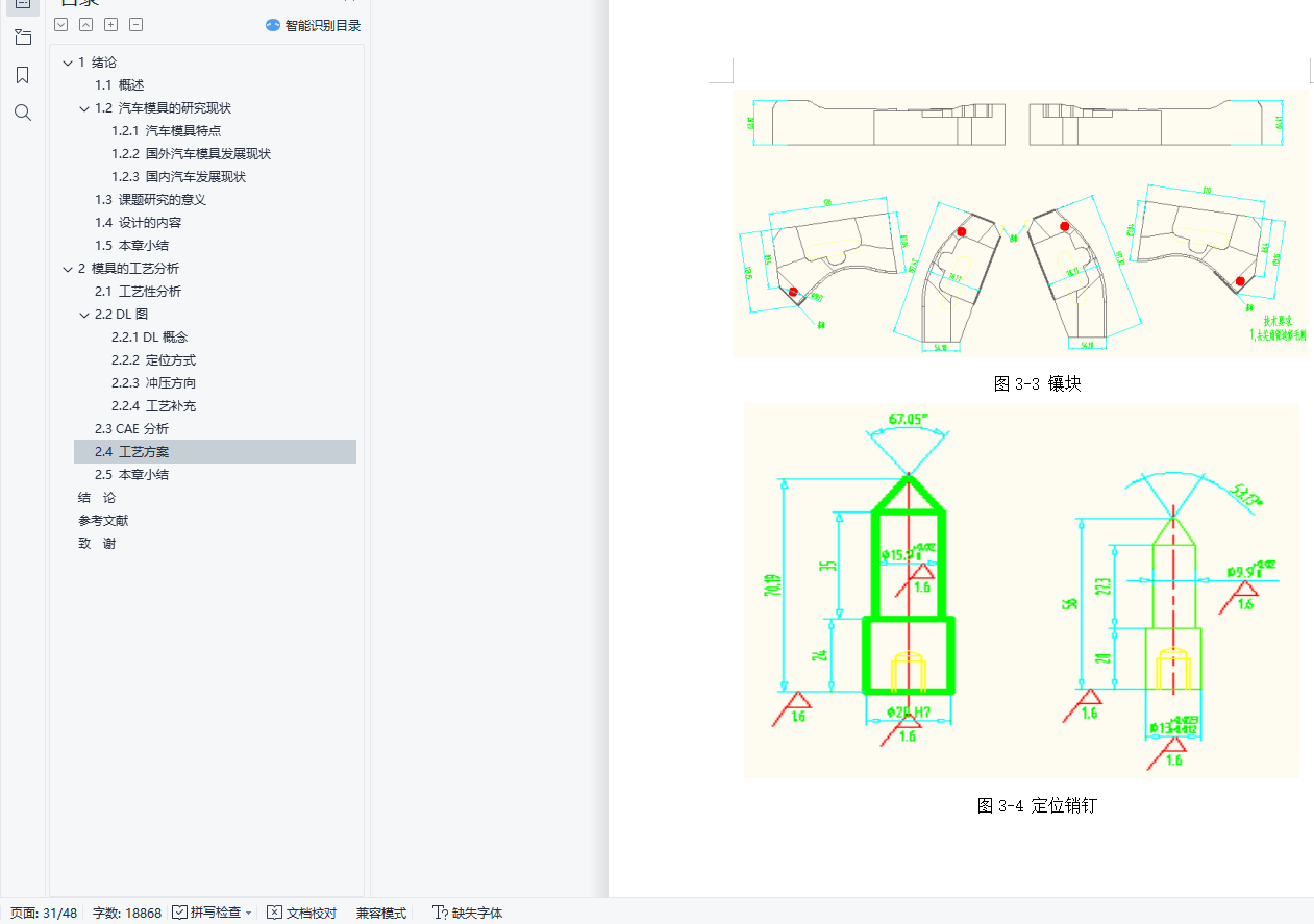 摘 要汽车模具指的是制造汽车零部件所用的模具总称,其中的汽车零部件又以汽车覆盖件居多。它们都大多采用冲压成型制造,靠对工件施加压力,使其塑性变形,得到所要求的产品,所以这类模具又被称为冷冲模具。汽车覆盖件最基本的冲压成型工艺有落料,拉延成型,冲孔,修边,翻边,整形,多工位等,但在实际加工时通常会将翻边整形等多几个工序合为一道工序进行生产加工。本设计以典型零部件上片的汽车模具作为设计对象,设计了拉延成型和翻边整形两道生产加工工序,了解了国内外汽车模具的现状,分析了拉延成型和翻边整形模具的工艺设计,了解了DL图和CAE图在生产加工中的地位,设计了拉延成型和翻边整形模具的结构,以 MR动画软件辅助,表达了其机械结构。关键词:冷冲压模具;汽车覆盖件;拉延成型;翻边整形ABSTRACTAutomobile mold refers to the general name of the mold used to manufacture automobile parts, in which the automobile parts are mainly automobile panels. Most of them are made by stamping. They can get the required products by applying pressure on the workpiece, so this kind of die is also called cold stamping die. The most basic stamping process of automobile panel includes blanking, drawing, punching, trimming, flanging, shaping, multi station, etc. but in actual processing, several processes such as flanging and shaping are usually combined into one process for production and processing.This design takes the automobile mould of typical parts as the design object, designs two production processes of drawing forming and flanging forming, understands the current situation of automobile mould at home and abroad, analyzes the process design of drawing forming and flanging forming mould, understands the position of DL diagram and CAE diagram in production processing, and designs the structure of drawing forming and flanging forming mould, With the help of Mr animation software, the mechanical structure is expressed.Key words: Cold stamping die; Automobile panel; drawing; flanging目 录1 绪论 71.1 概述 71.2 汽车模具的研究现状 81.2.1 汽车模具特点 81.2.2 国外汽车模具发展现状 81.2.3 国内汽车发展现状 91.3 课题研究的意义 101.4 设计的内容 101.5 本章小结 122 模具的工艺分析 132.1 工艺性分析 132.2 DL图 142.2.1 DL概念 152.2.2 定位方式 152.2.3 冲压方向 162.2.4 工艺补充 172.3 CAE分析 182.3.1 CAE概述 182.3.2 AutoForm 182.3.3 CAE分析过程 182.3.4 CAE模拟结果 192.4 工艺方案 222.4.1 压料面 222.4.2 拉延筋 232.4.3 工艺方案的确定 232.5 本章小结 263 模具设计 273.1 拉延成型模具的典型结构 273.1.1单动拉延模结构和原理 273.1.2 双动拉延模结构和原理 283.2 拉延成型模具设计 293.2.1 压边圈行程设计 293.2.2 顶杆布置 303.2.3 压边圈设计 303.2.4下模设计 333.2.5上模设计 353.3 翻边整形模的典型结构 363.3.1 垂直翻边模 363.3.2 斜锲翻边模 373.4 翻边整形模具设计 383.4.1 凹模设计 383.4.2 凸模设计 393.5 本章小结 394 MR设计 414.1 MR概述 414.2 UG建模 414.3 Maya转换 434.4 Unity 3D 444.5 本章小结 45结 论 46参考文献 47致 谢 49