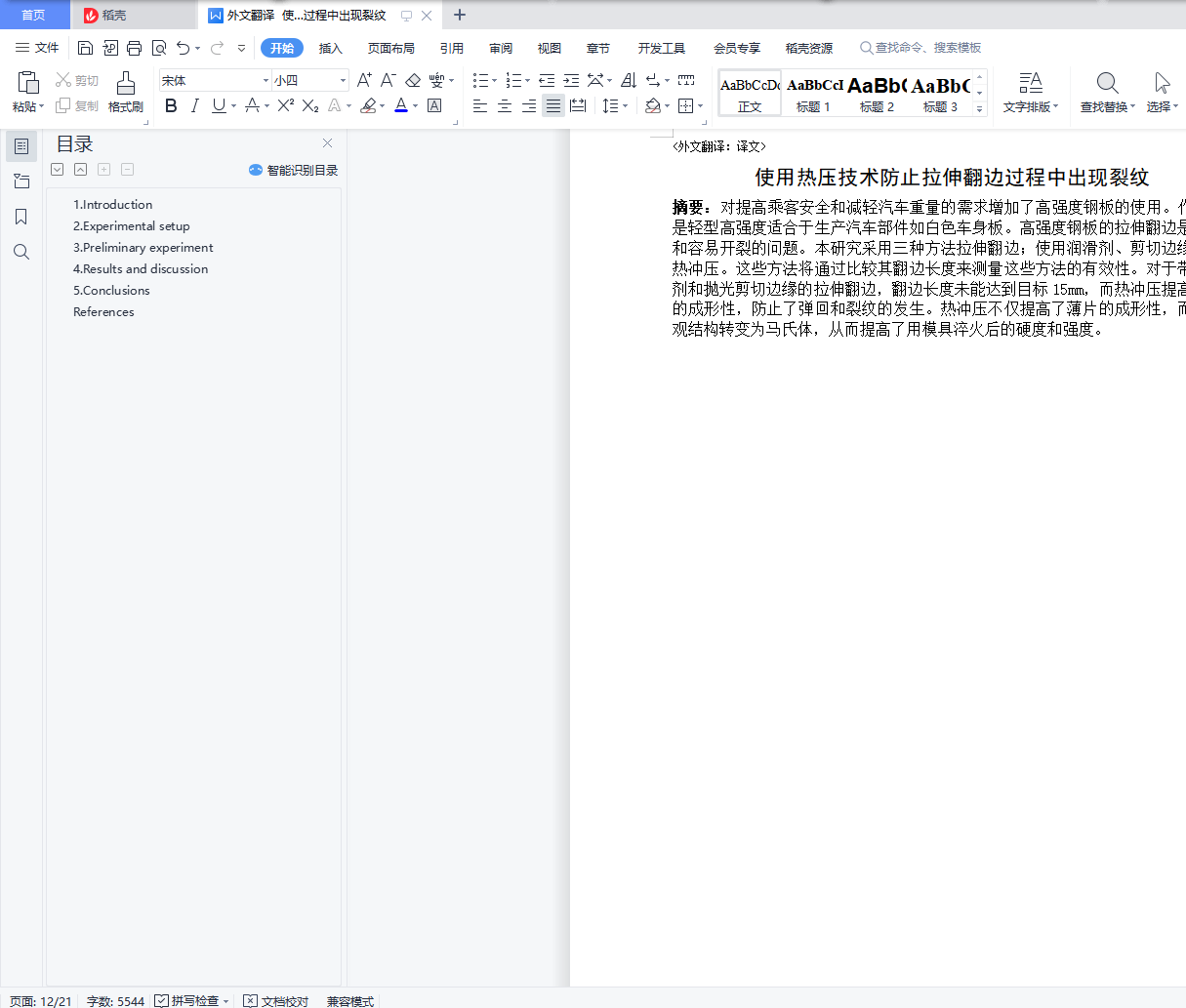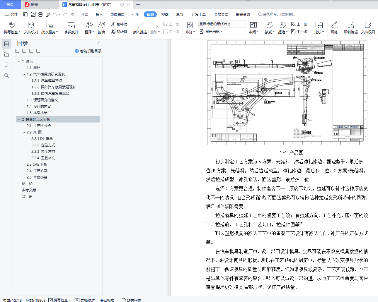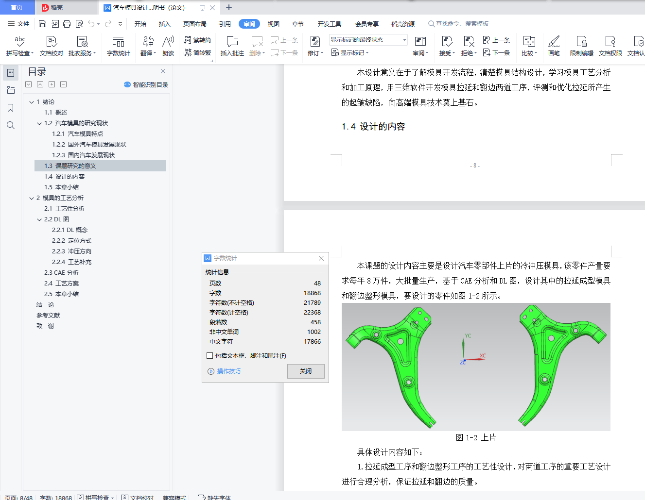 摘 要汽车模具指的是制造汽车零部件所用的模具总称,其中的汽车零部件又以汽车覆盖件居多。它们都大多采用冲压成型制造,靠对工件施加压力,使其塑性变形,得到所要求的产品,所以这类模具又被称为冷冲模具。汽车覆盖件最基本的冲压成型工艺有落料,拉延成型,冲孔,修边,翻边,整形,多工位等,但在实际加工时通常会将翻边整形等多几个工序合为一道工序进行生产加工。本设计以典型零部件上片的汽车模具作为设计对象,设计了拉延成型和翻边整形两道生产加工工序,了解了国内外汽车模具的现状,分析了拉延成型和翻边整形模具的工艺设计,了解了DL图和CAE图在生产加工中的地位,设计了拉延成型和翻边整形模具的结构,以 MR动画软件辅助,表达了其机械结构。关键词:冷冲压模具;汽车覆盖件;拉延成型;翻边整形ABSTRACTAutomobile mold refers to the general name of the mold used to manufacture automobile parts, in which the automobile parts are mainly automobile panels. Most of them are made by stamping. They can get the required products by applying pressure on the workpiece, so this kind of die is also called cold stamping die. The most basic stamping process of automobile panel includes blanking, drawing, punching, trimming, flanging, shaping, multi station, etc. but in actual processing, several processes such as flanging and shaping are usually combined into one process for production and processing.This design takes the automobile mould of typical parts as the design object, designs two production processes of drawing forming and flanging forming, understands the current situation of automobile mould at home and abroad, analyzes the process design of drawing forming and flanging forming mould, understands the position of DL diagram and CAE diagram in production processing, and designs the structure of drawing forming and flanging forming mould, With the help of Mr animation software, the mechanical structure is expressed.Key words: Cold stamping die; Automobile panel; drawing; flanging目 录1 绪论 71.1 概述 71.2 汽车模具的研究现状 81.2.1 汽车模具特点 81.2.2 国外汽车模具发展现状 81.2.3 国内汽车发展现状 91.3 课题研究的意义 101.4 设计的内容 101.5 本章小结 122 模具的工艺分析 132.1 工艺性分析 132.2 DL图 142.2.1 DL概念 152.2.2 定位方式 152.2.3 冲压方向 162.2.4 工艺补充 172.3 CAE分析 182.3.1 CAE概述 182.3.2 AutoForm 182.3.3 CAE分析过程 182.3.4 CAE模拟结果 192.4 工艺方案 222.4.1 压料面 222.4.2 拉延筋 232.4.3 工艺方案的确定 232.5 本章小结 263 模具设计 273.1 拉延成型模具的典型结构 273.1.1单动拉延模结构和原理 273.1.2 双动拉延模结构和原理 283.2 拉延成型模具设计 293.2.1 压边圈行程设计 293.2.2 顶杆布置 303.2.3 压边圈设计 303.2.4下模设计 333.2.5上模设计 353.3 翻边整形模的典型结构 363.3.1 垂直翻边模 363.3.2 斜锲翻边模 373.4 翻边整形模具设计 383.4.1 凹模设计 383.4.2 凸模设计 393.5 本章小结 394 MR设计 414.1 MR概述 414.2 UG建模 414.3 Maya转换 434.4 Unity 3D 444.5 本章小结 45结 论 46参考文献 47致 谢 49